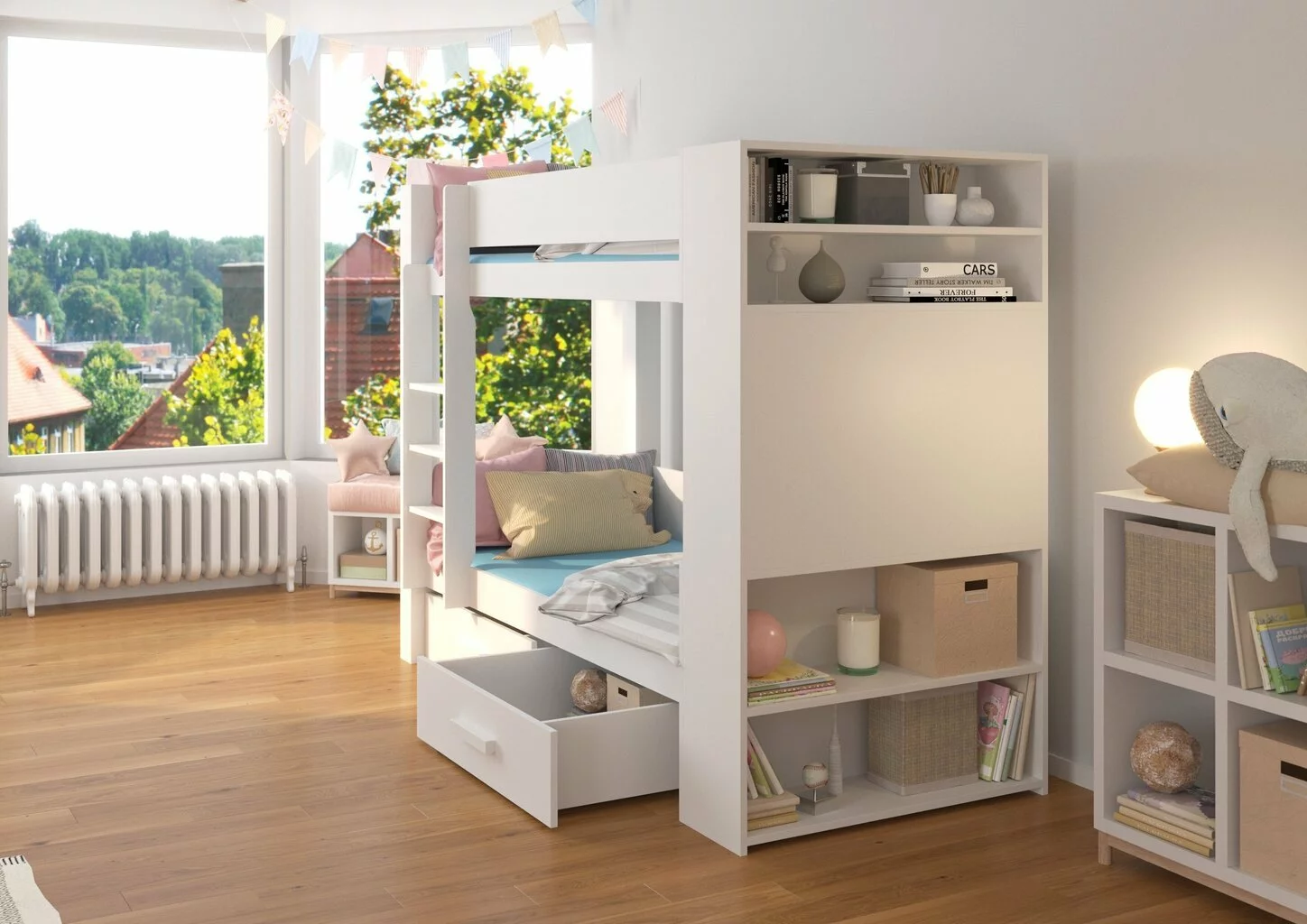 Moderni muotoilu: toimiva kerrossänky laatikoilla ja hyllyillä on täydellinen erilaisten tavaroiden säilyttämiseen. Se sopii ihanteellisesti minkä tahansa lastenhuoneen sisustukseen.