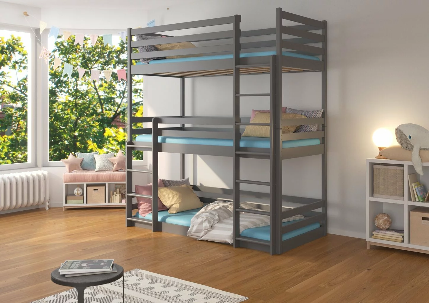 Kaikki nämä modernien huonekalujen ominaisuudet vahvistavat sen tosiasian, että tämän tyylin tuotteet ovat yksinkertaisia ja samalla erittäin yleisiä. Joten ne on helppo sijoittaa kaikenkokoisiin huoneisiin. ADRK Furniture Tedro -3-kerrossänky lapsille, 210 x 97 x 208 cm, harmaa pitää niistä, jotka haluavat luoda minimalistisen ja tilavan tilan, jossa on kunnollinen ja raikas luonto.