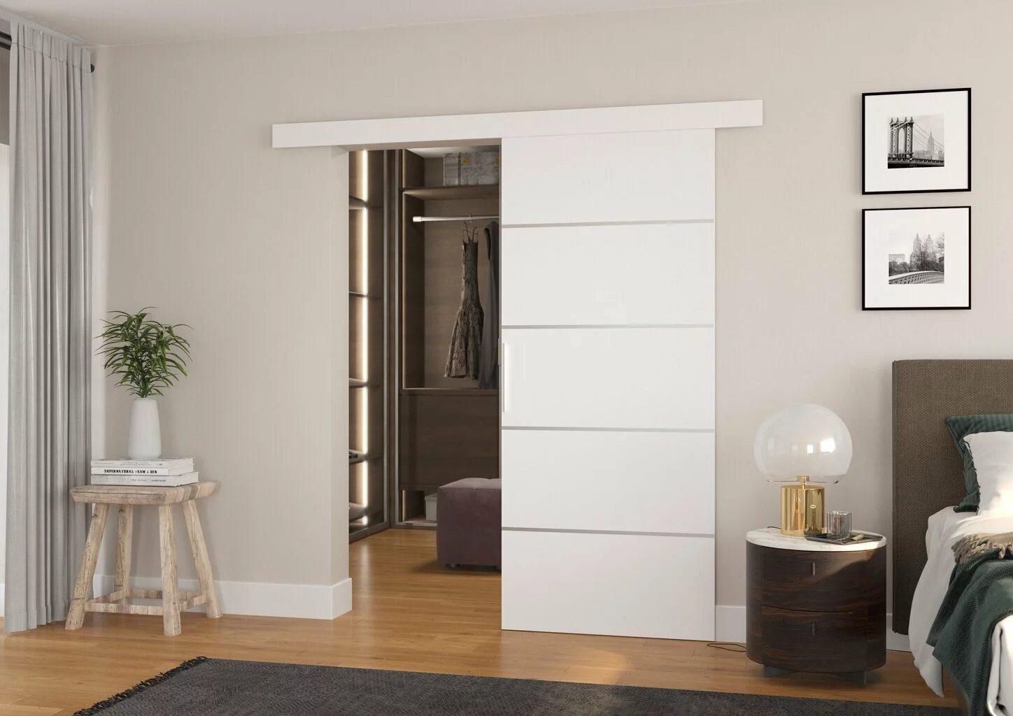 Liukuovet viimeistelevät kotisi sisustuksen. Muotoilua täydentävät tyylikkäät hopeiset asusteet, jotka antavat sisustukseen eleganssia. Mukavuus ja tyyli yhdessä.