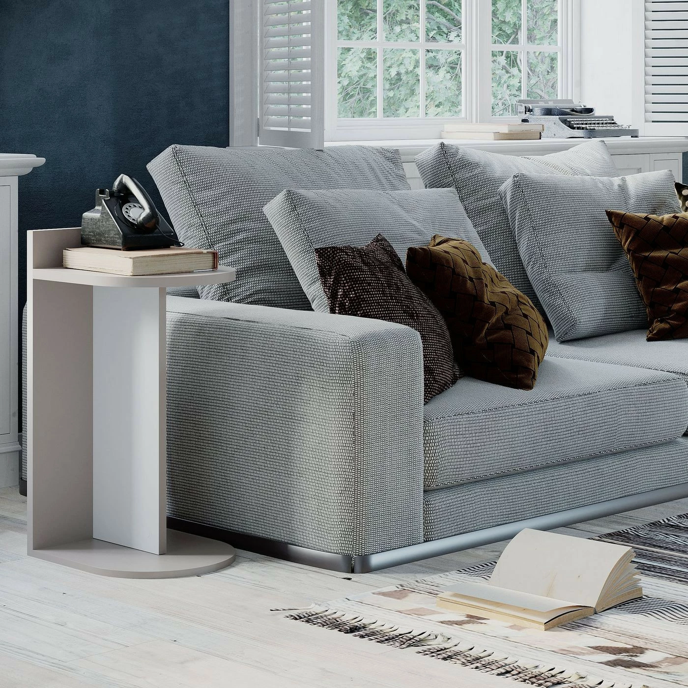 Kaksivärinen Dom-apupöytä. Sohvan viereen mukavasti sopivassa pöydässä on kauniin kaareva muoto.