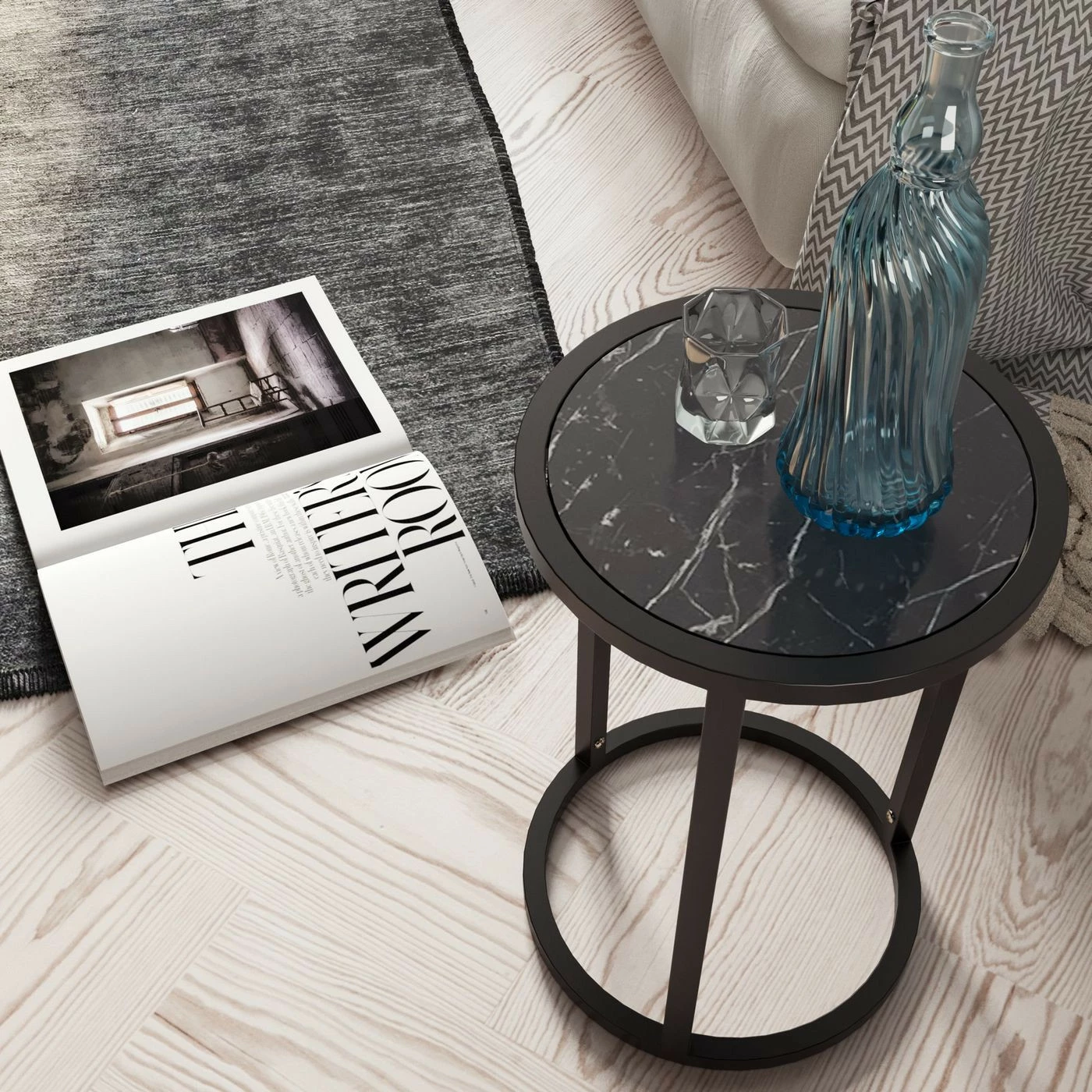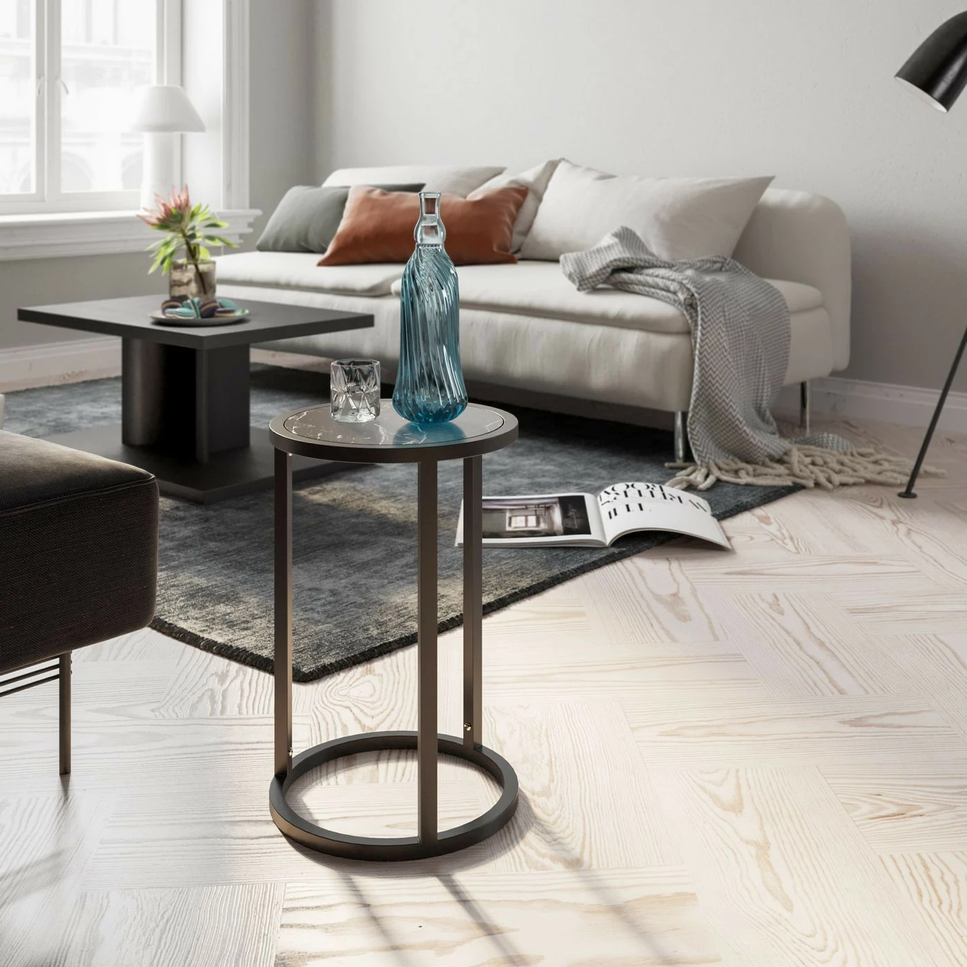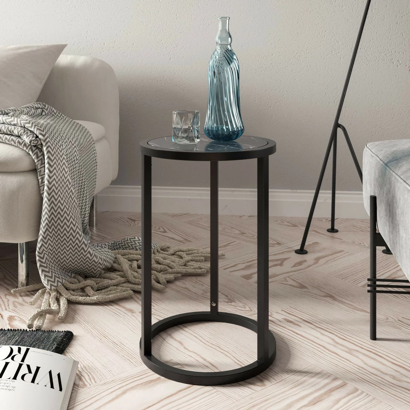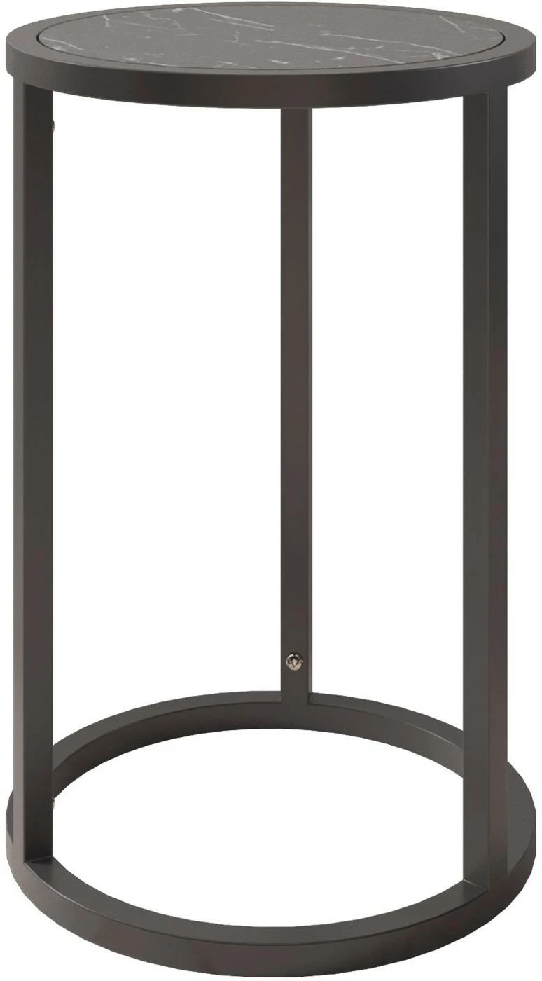 Kaunis pyöreä Tambur-apupöytä on helppo liittää osaksi sisustusta. Pöytälevyssä on marmorikuvio.