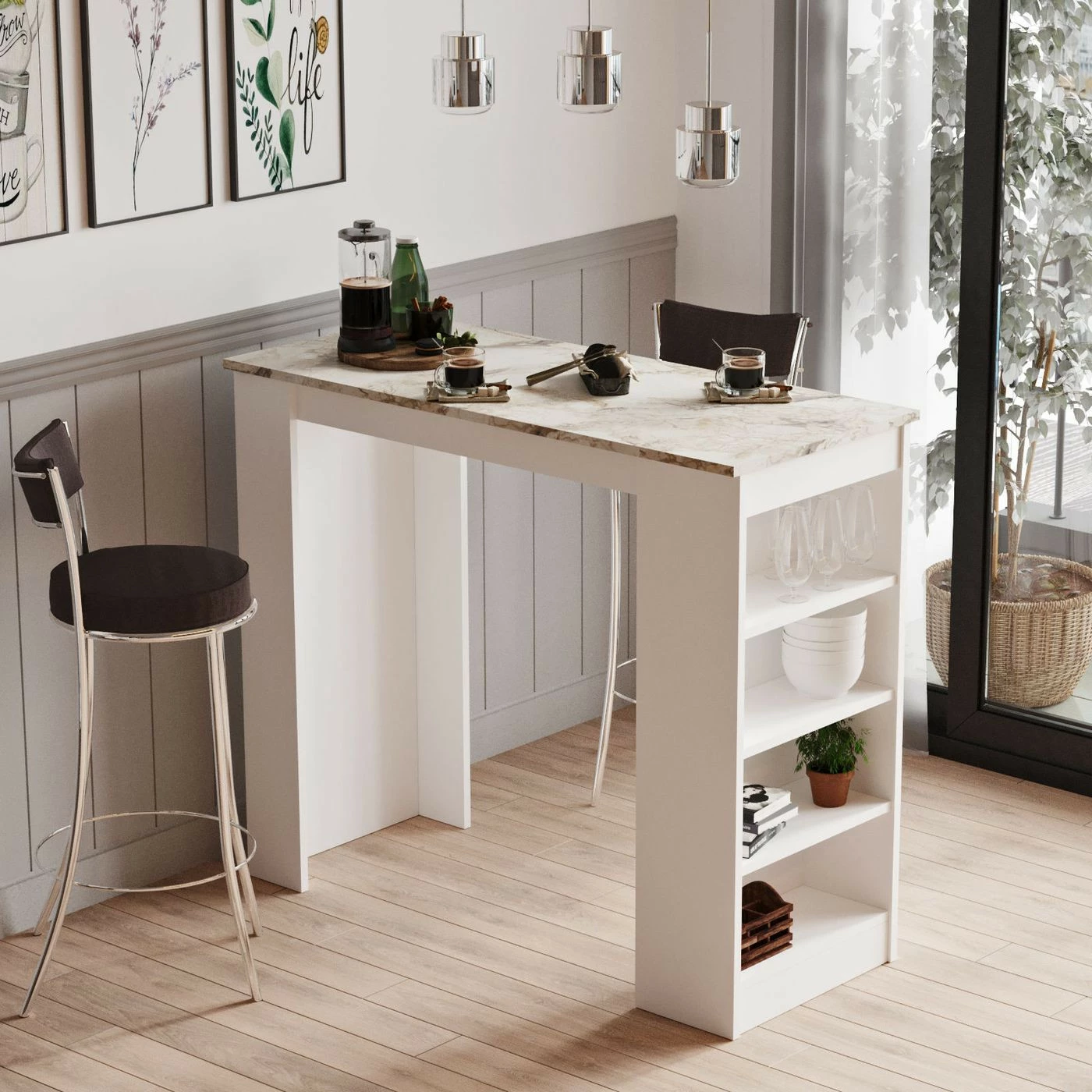 ST1 White -baaripöytä. Baaripöytä mahtuu pieneenkin tilaan. Se myös jakaa tilaa nätisti avokeittiössä.
