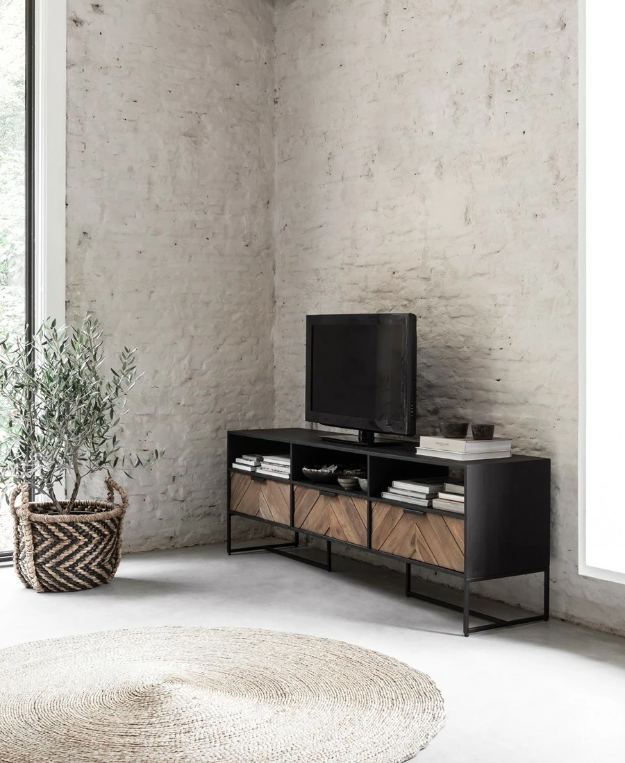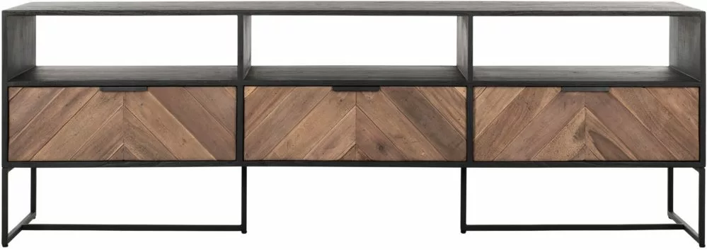 Jotain erilaista – tyylillä. Upean näyttävä kalanruotokuvioinen Criss Cross tv-taso kierrätystiikistä. Laadukas, ja niin katsetta kuin käyttöäkin kestävä säilytyskaluste, jossa on sekä avointa tilaa että kolme kätevää vetolaatikkoa. Täydellinen ja ikuinen kaluste täyspuusta laatua arvostavalle sisustajalle!