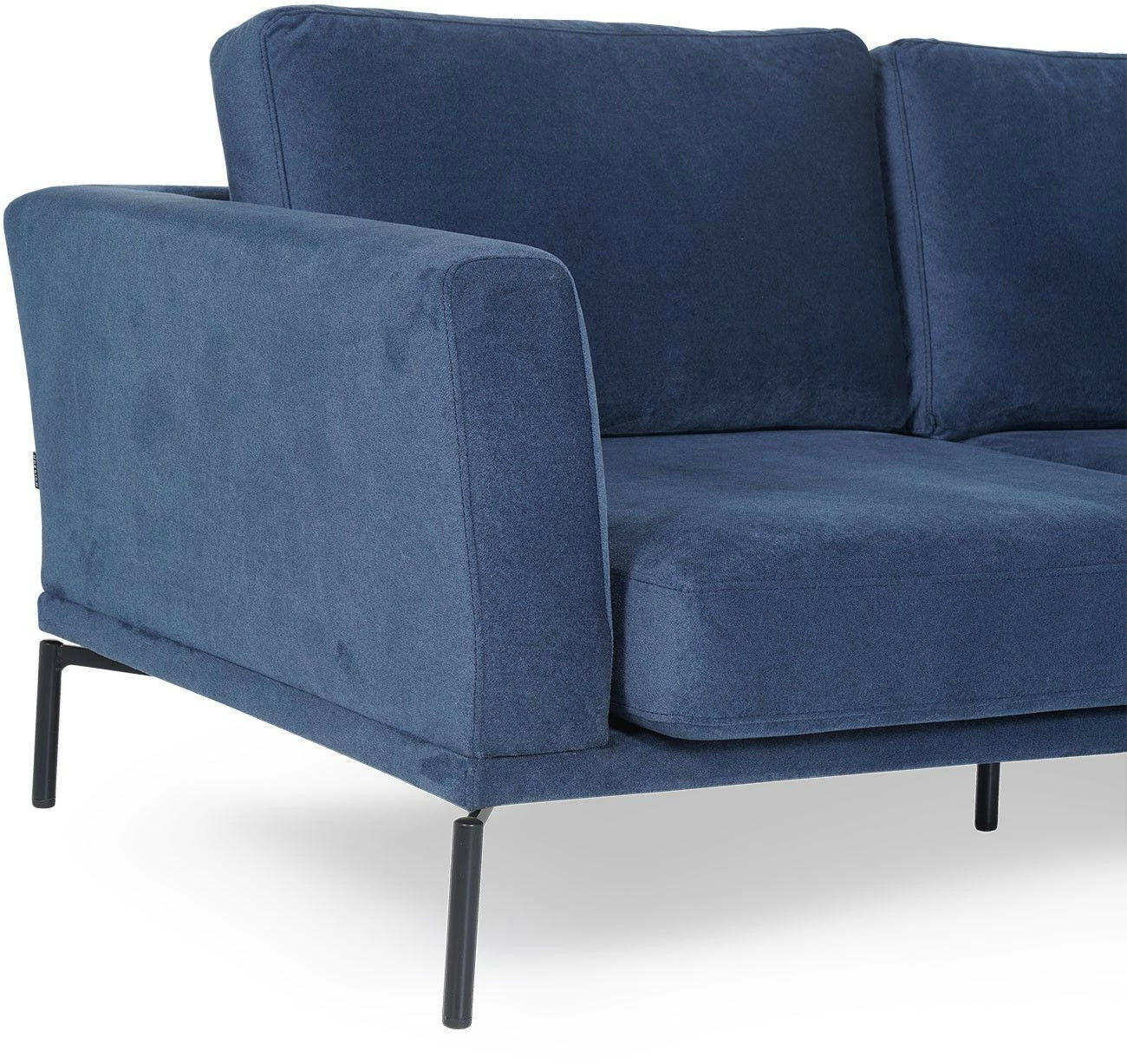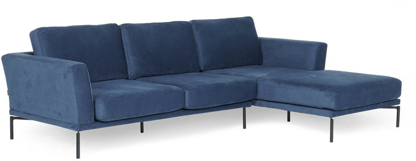 Sininen Jade Relax -sohva, jonka divaaniosa kutsuu rentoutumaan. Jade Relax -sohvassa on samettiverhoilu ja metallijalat.