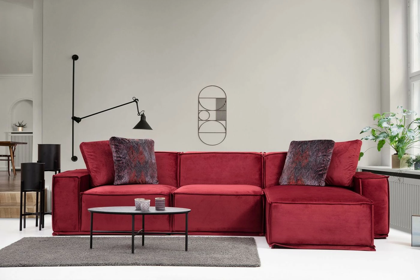 Lego-divaanisohvassa on upea punainen tekstiiliverhoilu. Divaaniosa oikealla puolella. Mukana toimitetaan neljä koristetyynyä.
