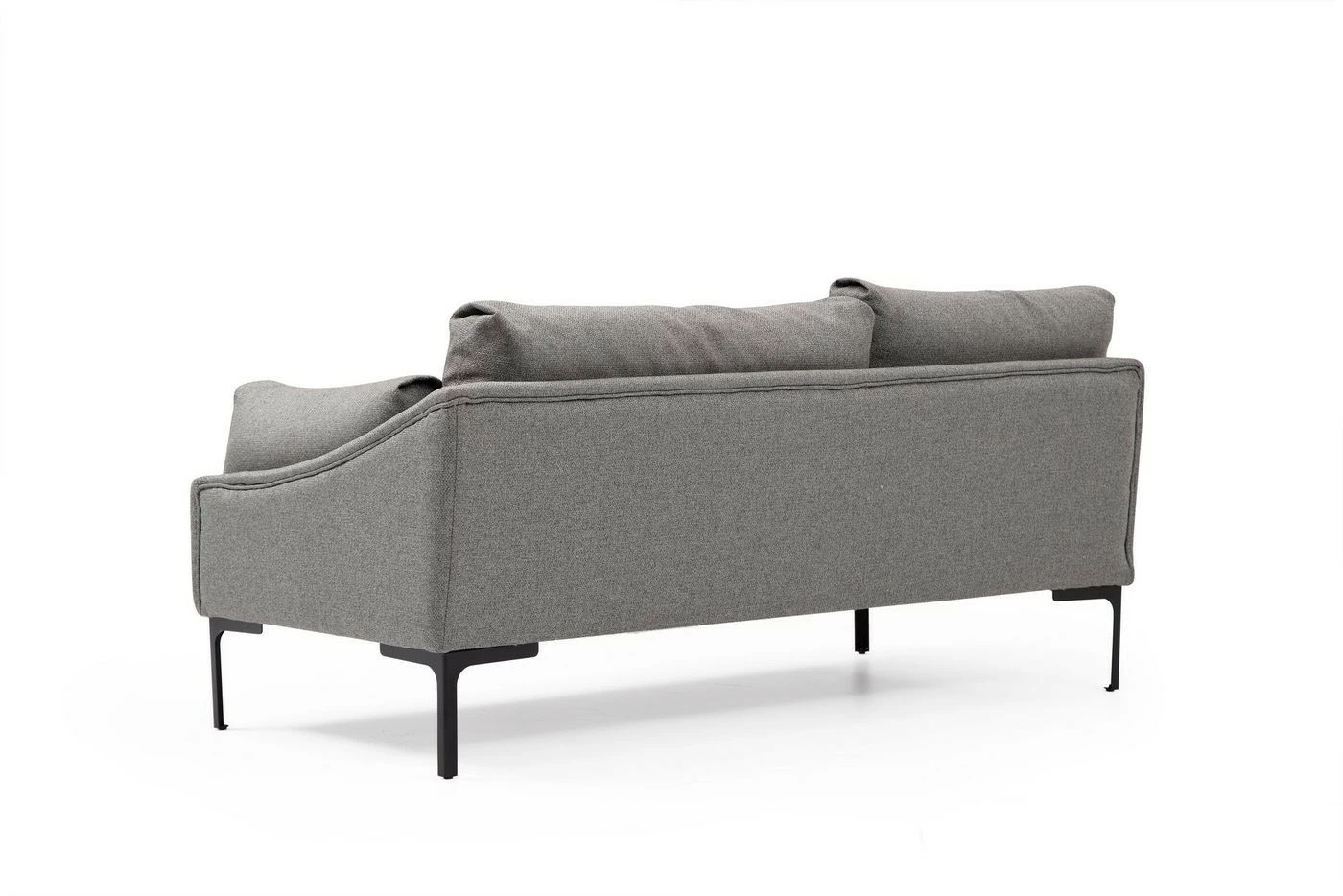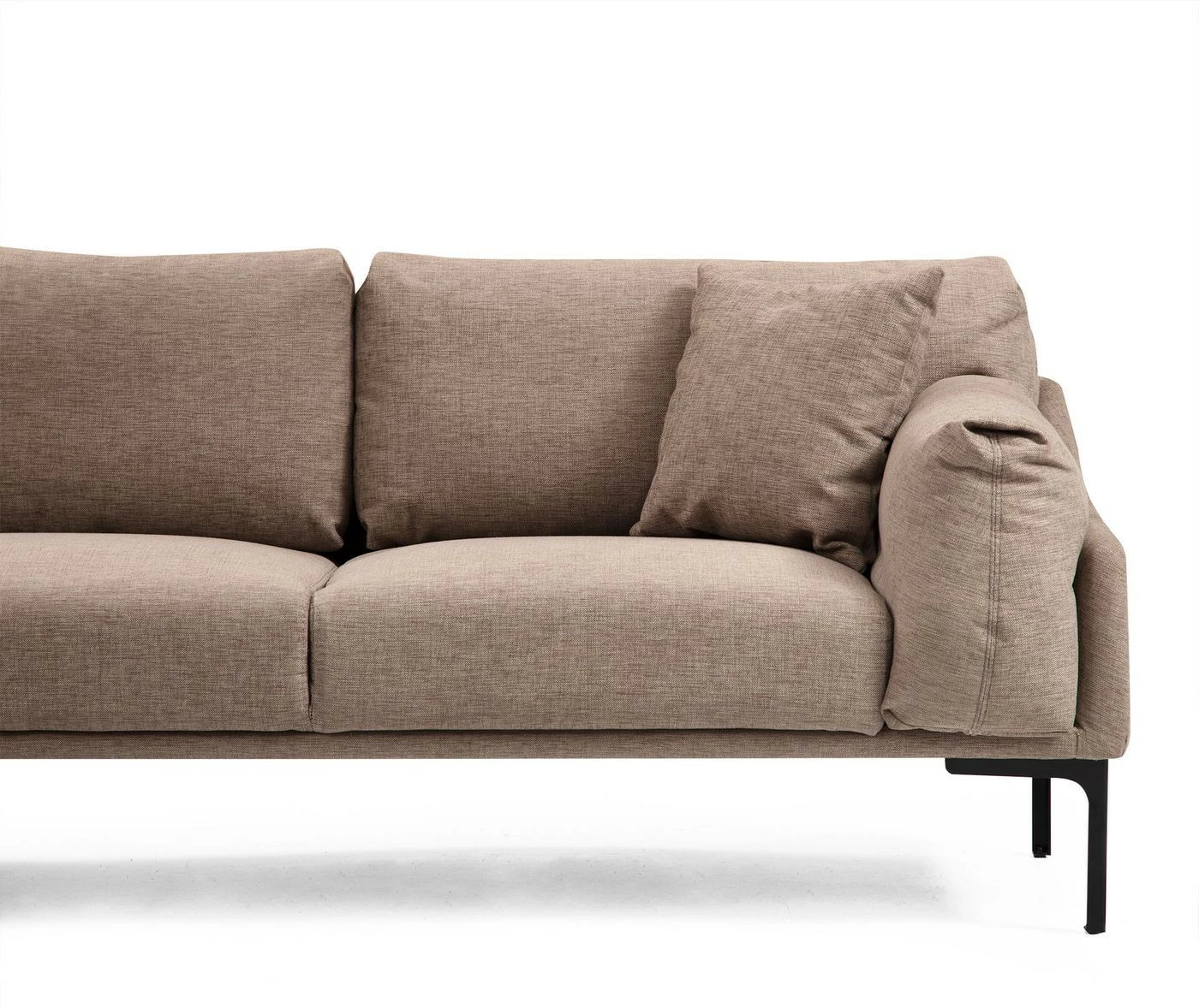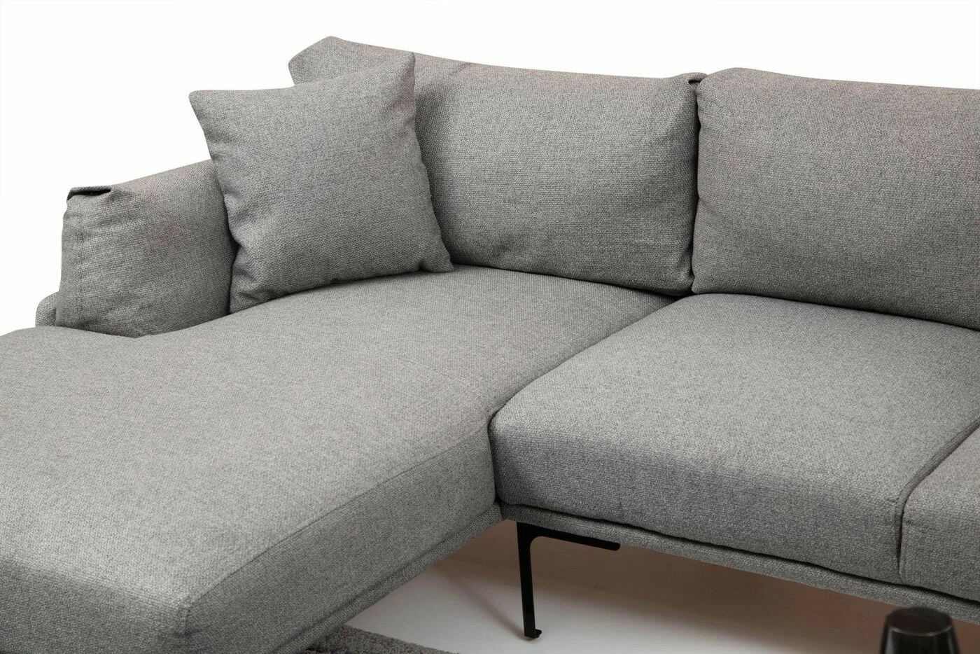 Pelkistetyssä Leo-divaanisohvassa on tekstiiliverhoilu ja mattamustat metallijalat. Divaaniosa on edestäpäin katsottuna sohvan vasemmassa reunassa. Sohvan mukana toimitetaan kaksi koristetyynyä.