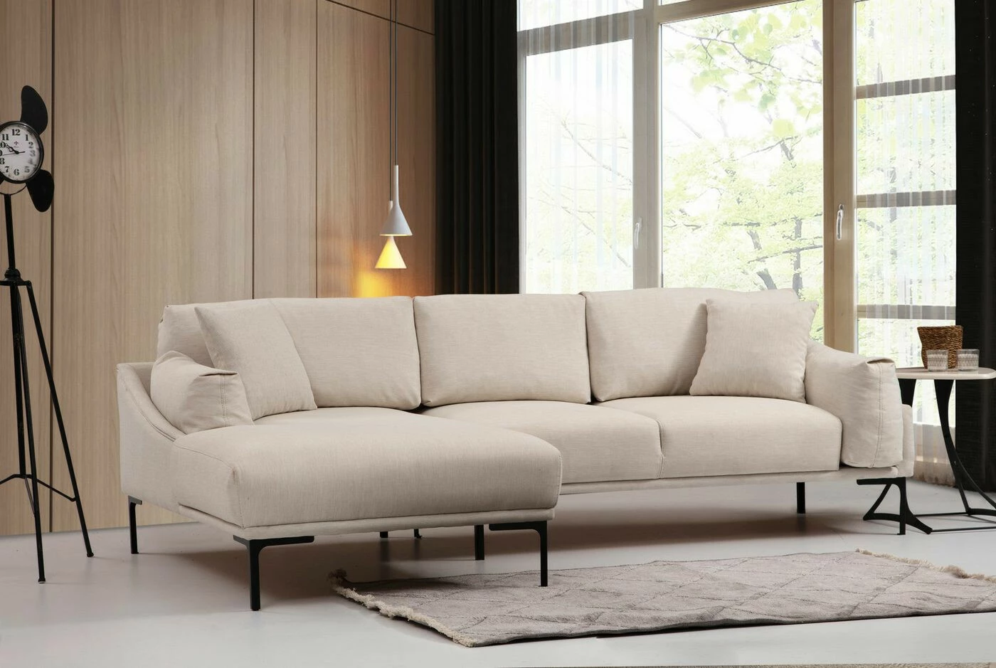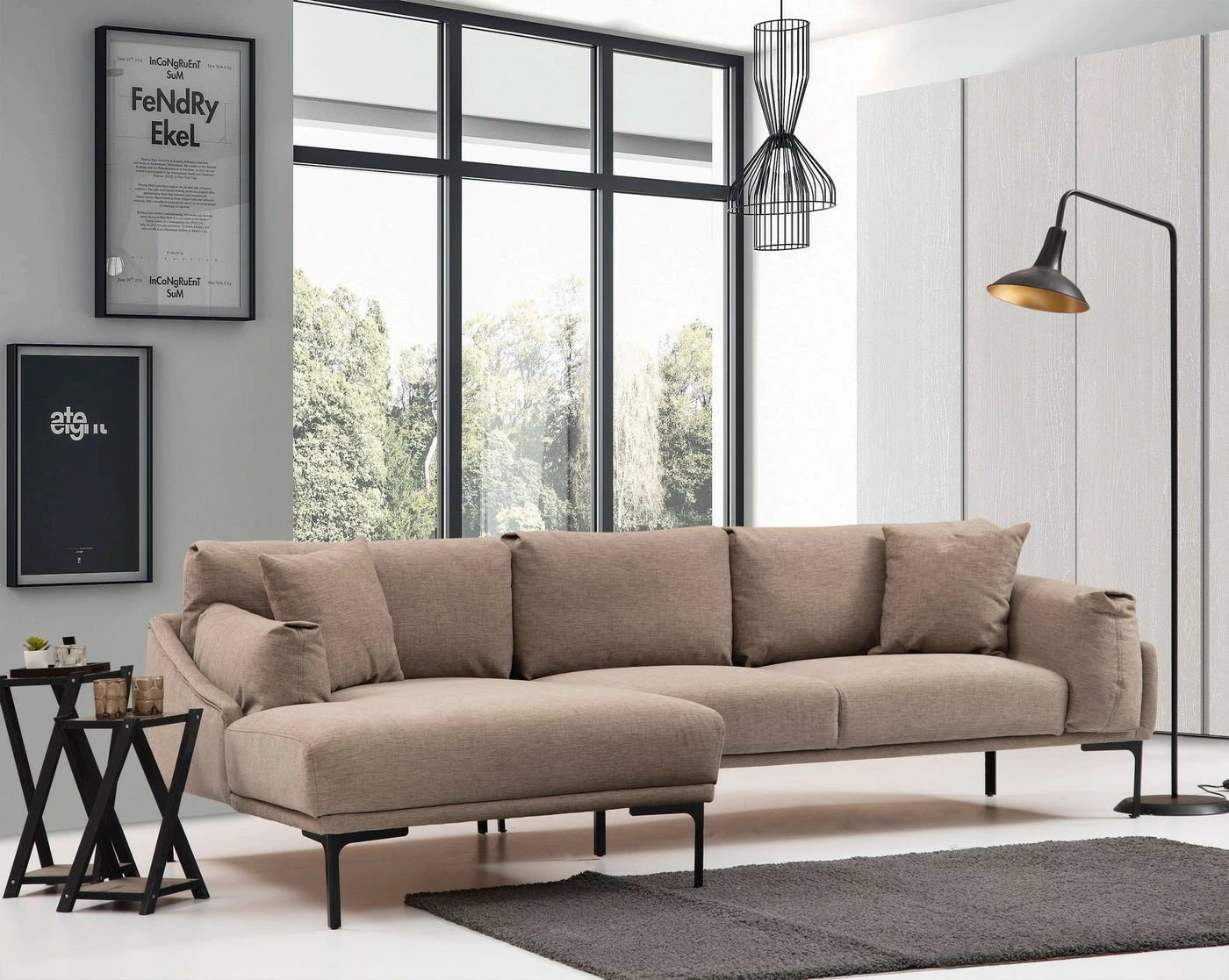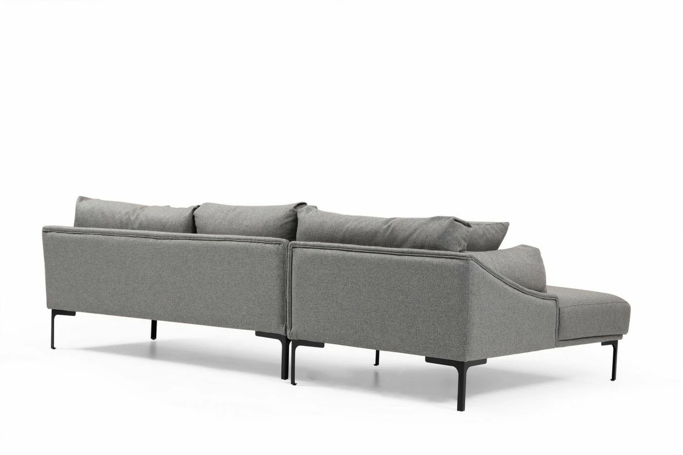 Pelkistetyssä Leo-divaanisohvassa on tekstiiliverhoilu ja mattamustat metallijalat. Divaaniosa on edestäpäin katsottuna sohvan vasemmassa reunassa. Sohvan mukana toimitetaan kaksi koristetyynyä.