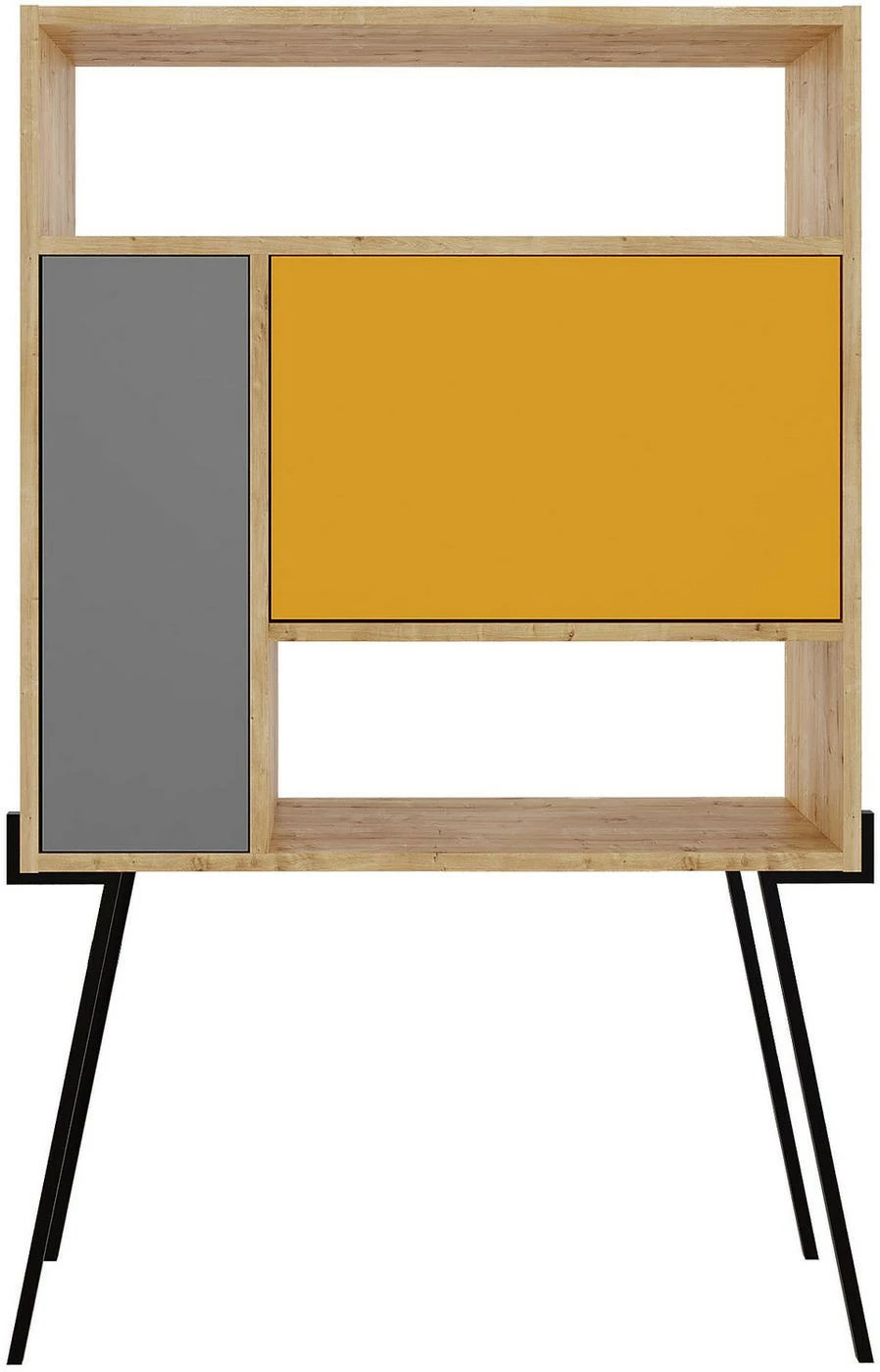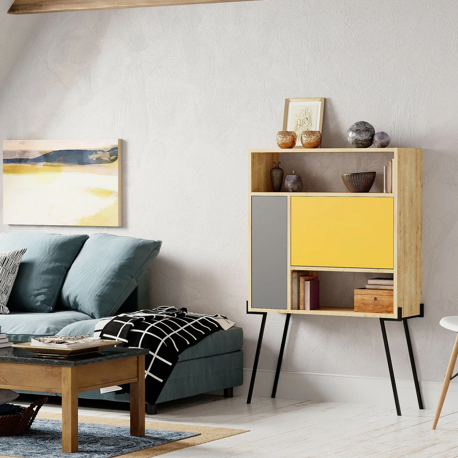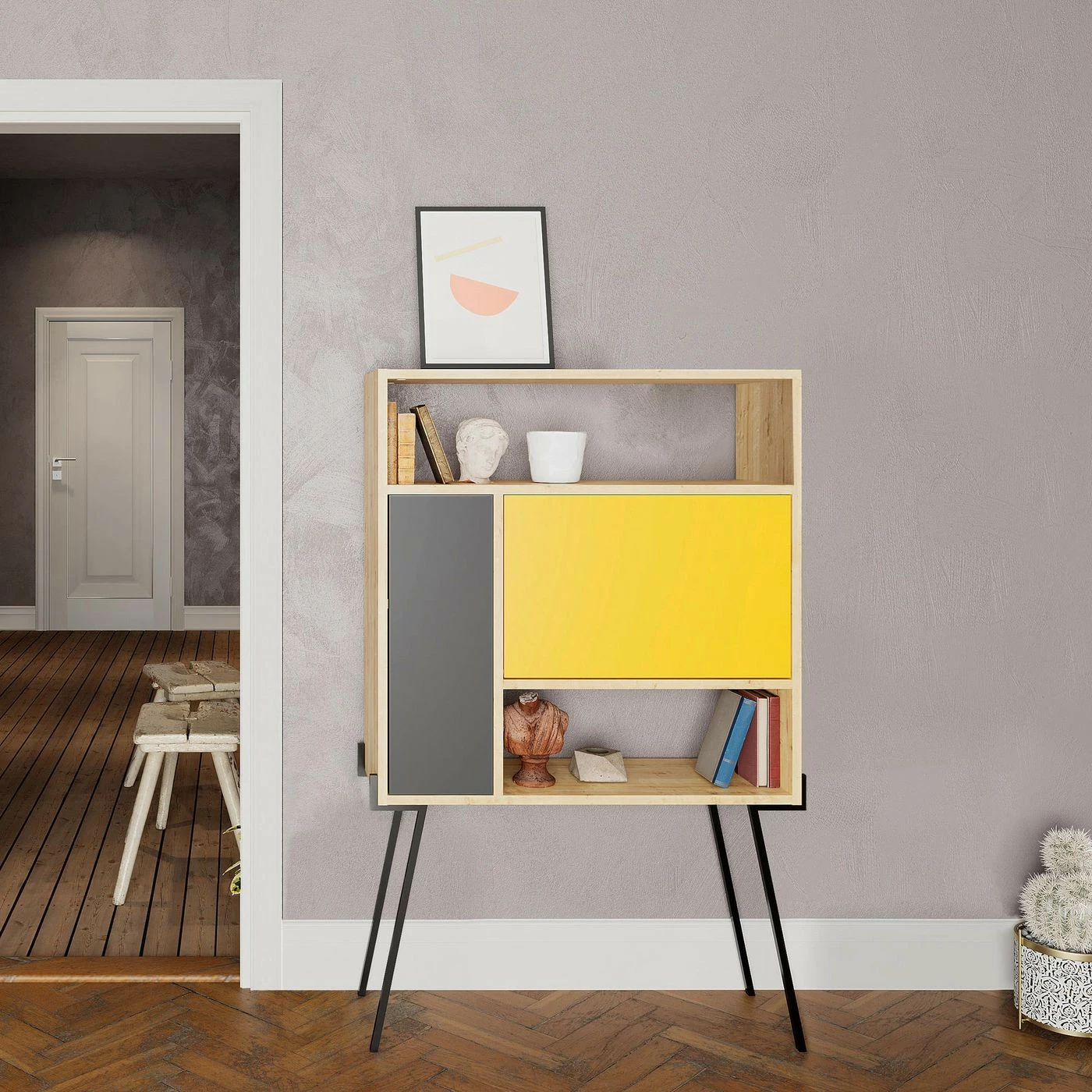 Monikäyttöinen hylly sopii niin olohuoneeseen, makuuhuoneeseen kuin keittiöön. Sirot jalat ovat metallia.