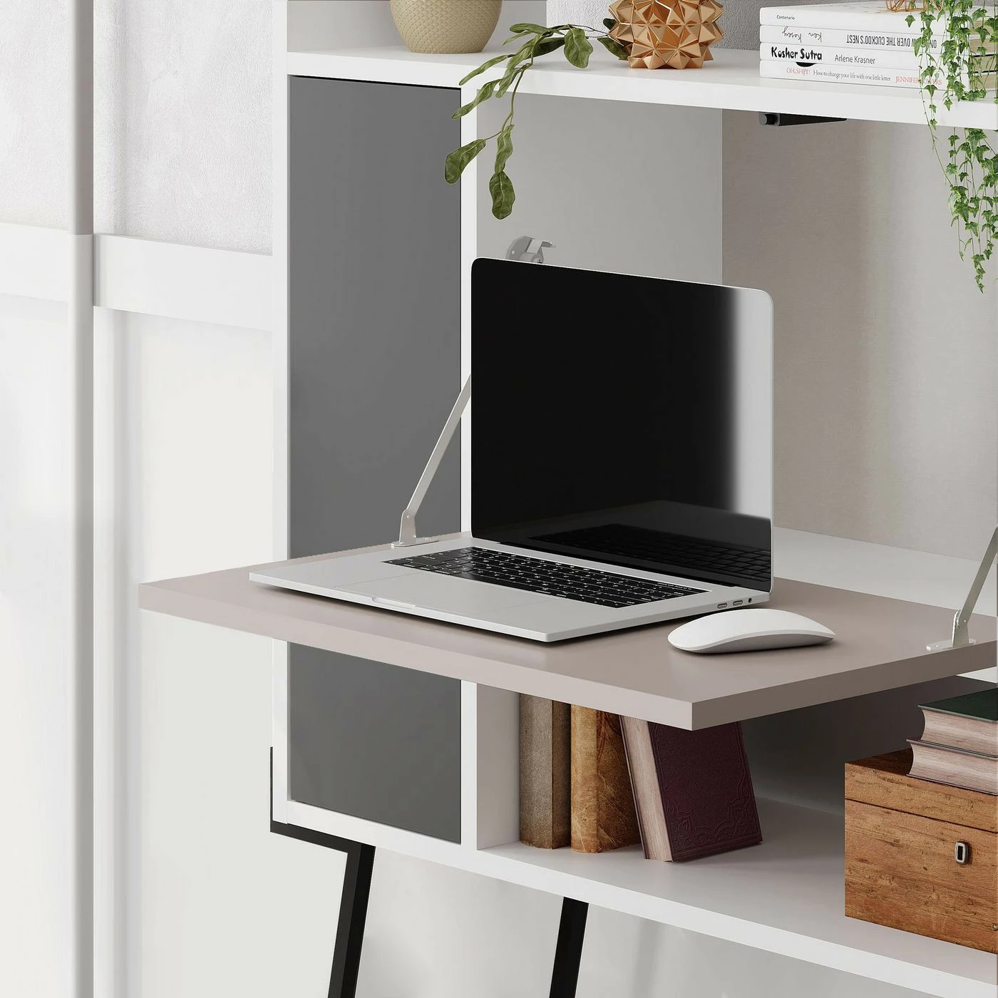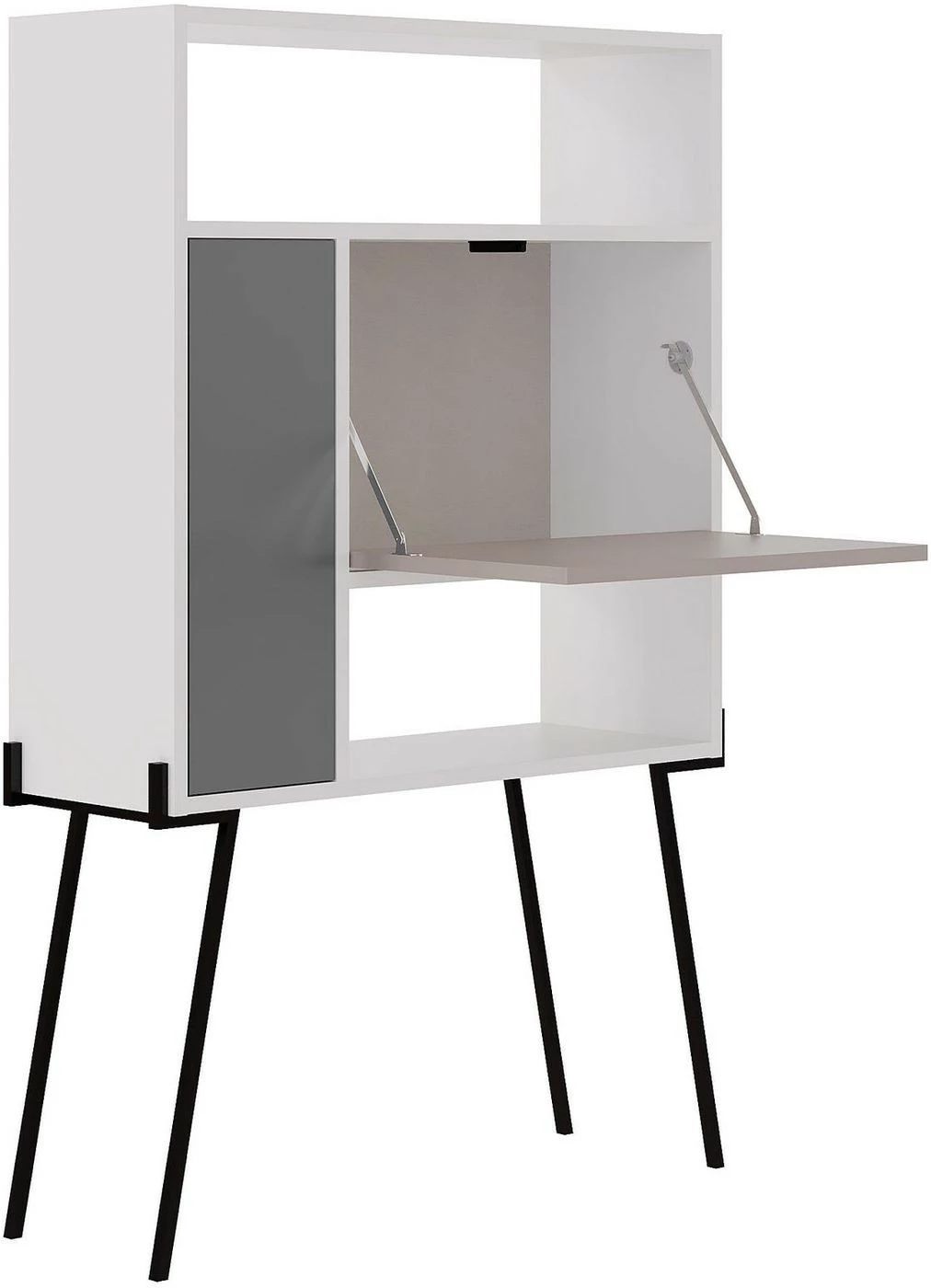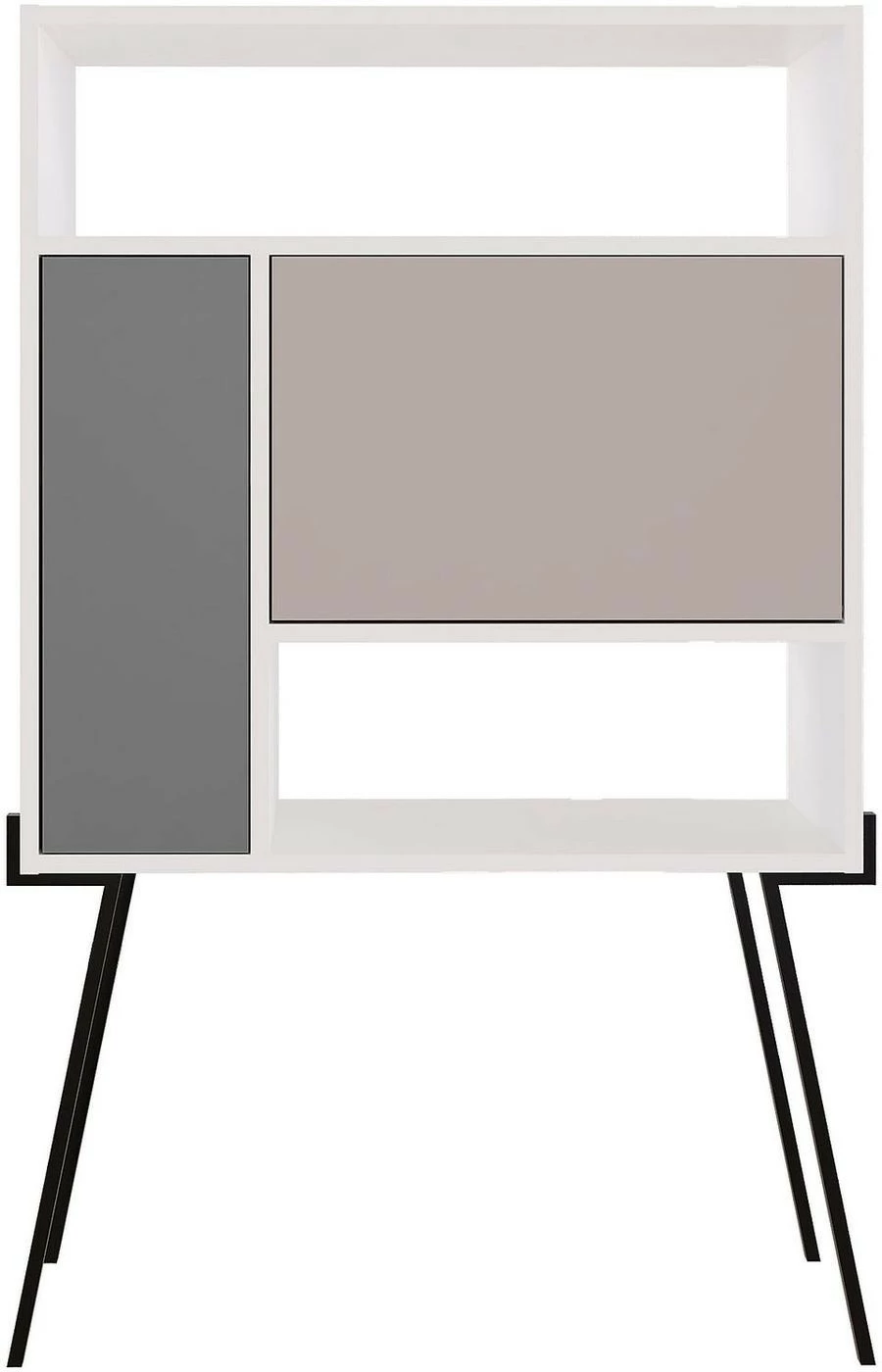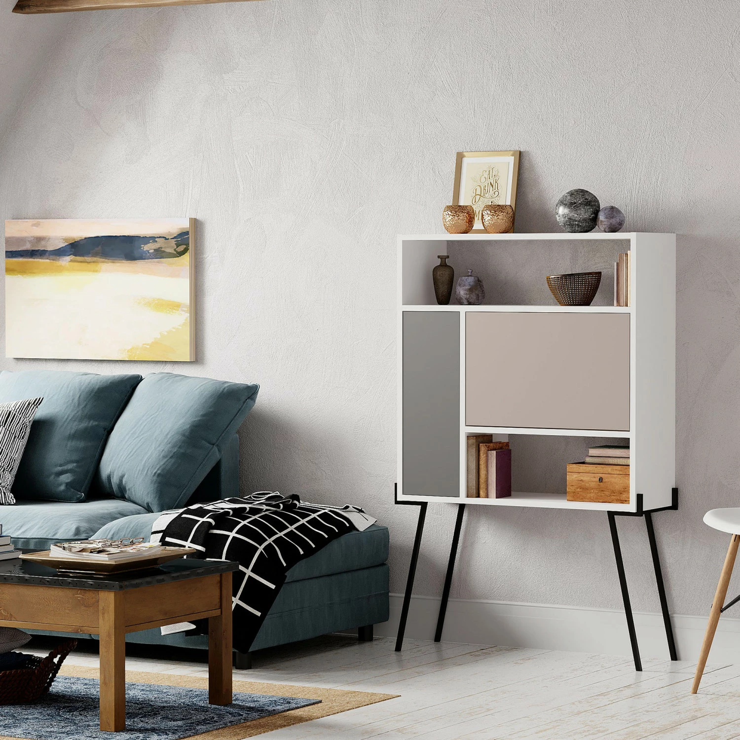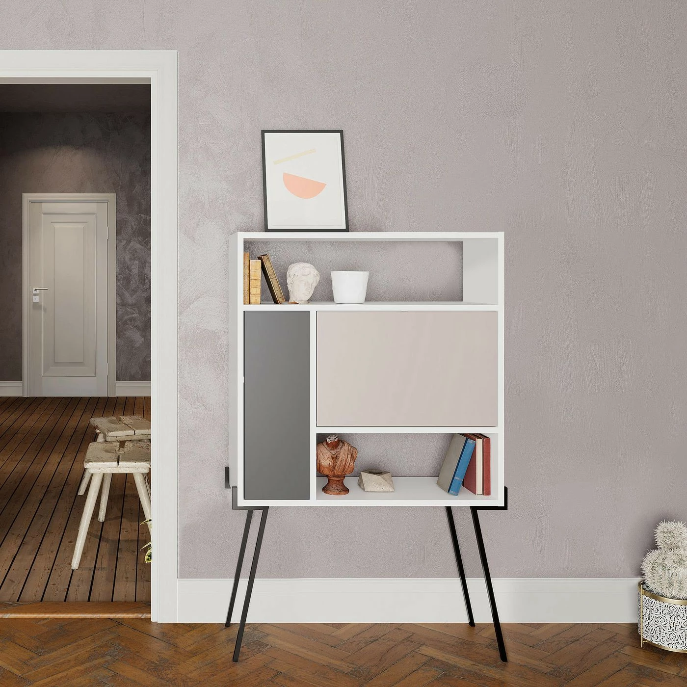 Monikäyttöinen hylly sopii niin olohuoneeseen, makuuhuoneeseen kuin keittiöön. Sirot jalat ovat metallia.