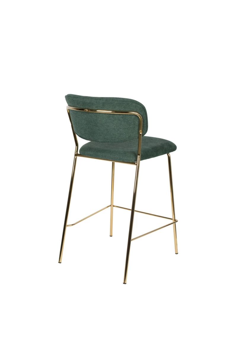 Ihanan pehmeä Jolien baarituoli saarekkeeseen sopivassa koossa. Tummanvihreä samettinen baarituoli supermukavalla pehmustetulla istuinosalla ja kunnon selkänojalla on todella miellyttävä istua. Kultaiset jalat viimeistelevät ylellisen kokemuksen.