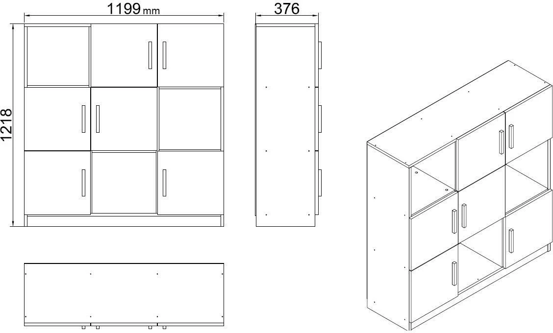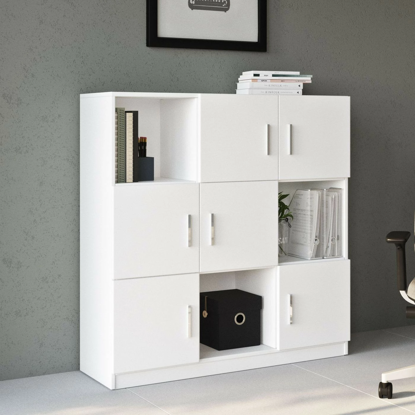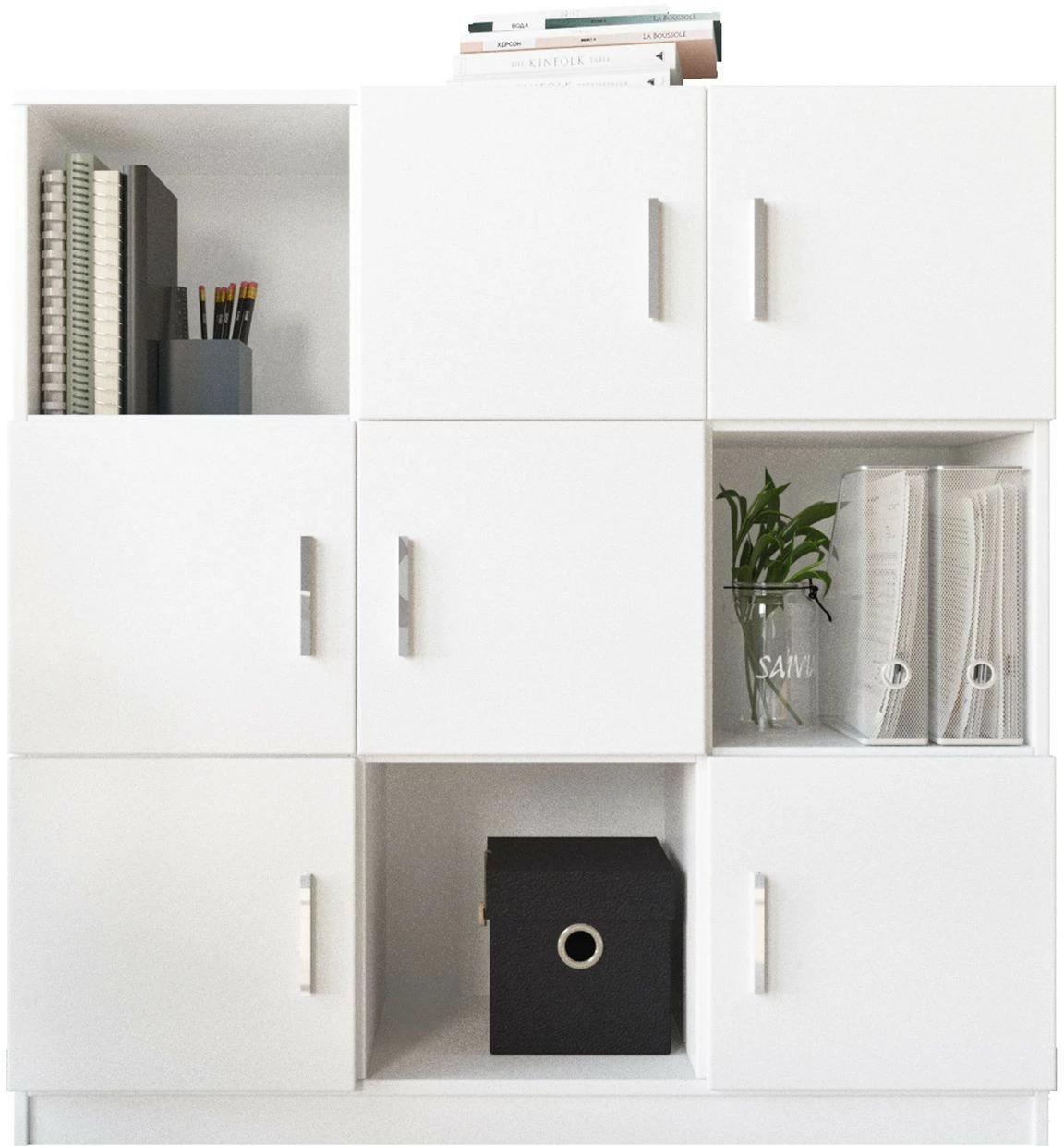 Tyylikäs kaapisto kodin tärkeille papereille ja työvälineille. Kolme avohyllyä.