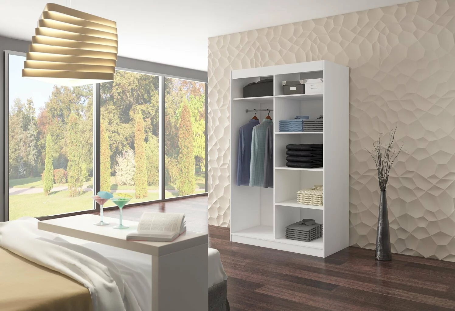 Kaikki nämä modernien huonekalujen ominaisuudet vahvistavat sen tosiasian, että tämän tyylin tuotteet ovat yksinkertaisia ja samalla erittäin yleisiä. Joten ne on helppo sijoittaa kaikenkokoisiin huoneisiin. Kaappi ADRK Furniture Benisso, valkoinen pitää niistä, jotka haluavat luoda minimalistisen ja tilavan tilan, jossa on kunnollinen ja raikas luonto.