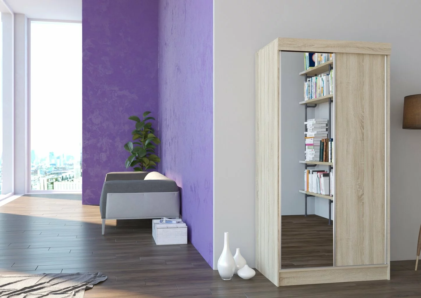 - Moderni kaappi, jossa kaksi liukuovea peileillä;