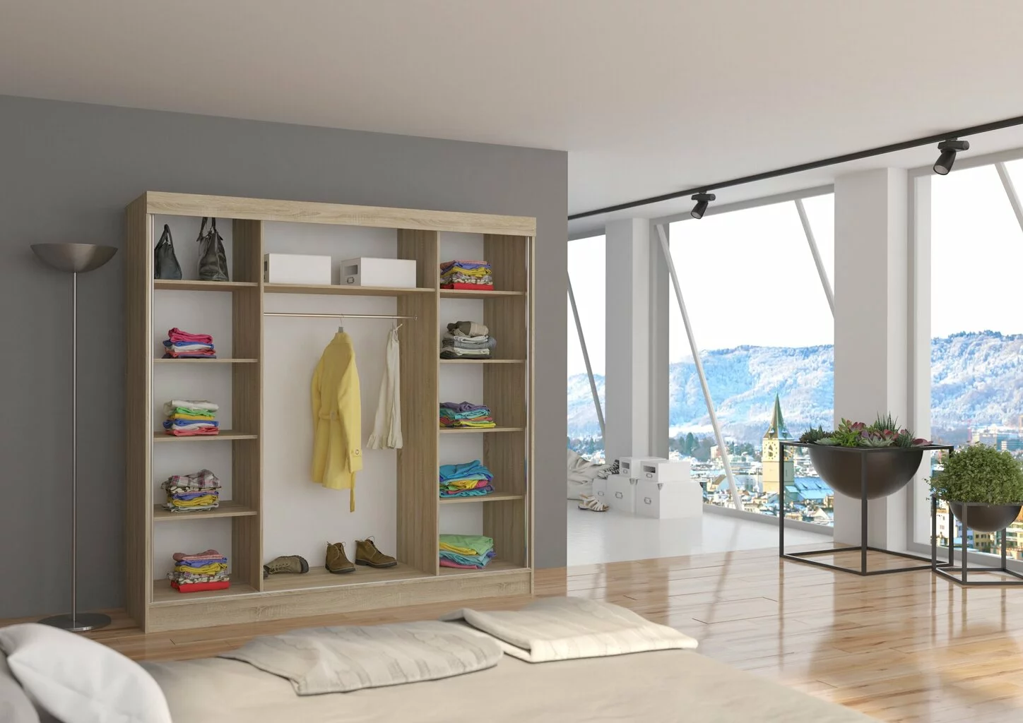 - Nykyaikainen näyttävä vaatekaappi, joka on varustettu kahdella tyylikkäällä liukuovella;