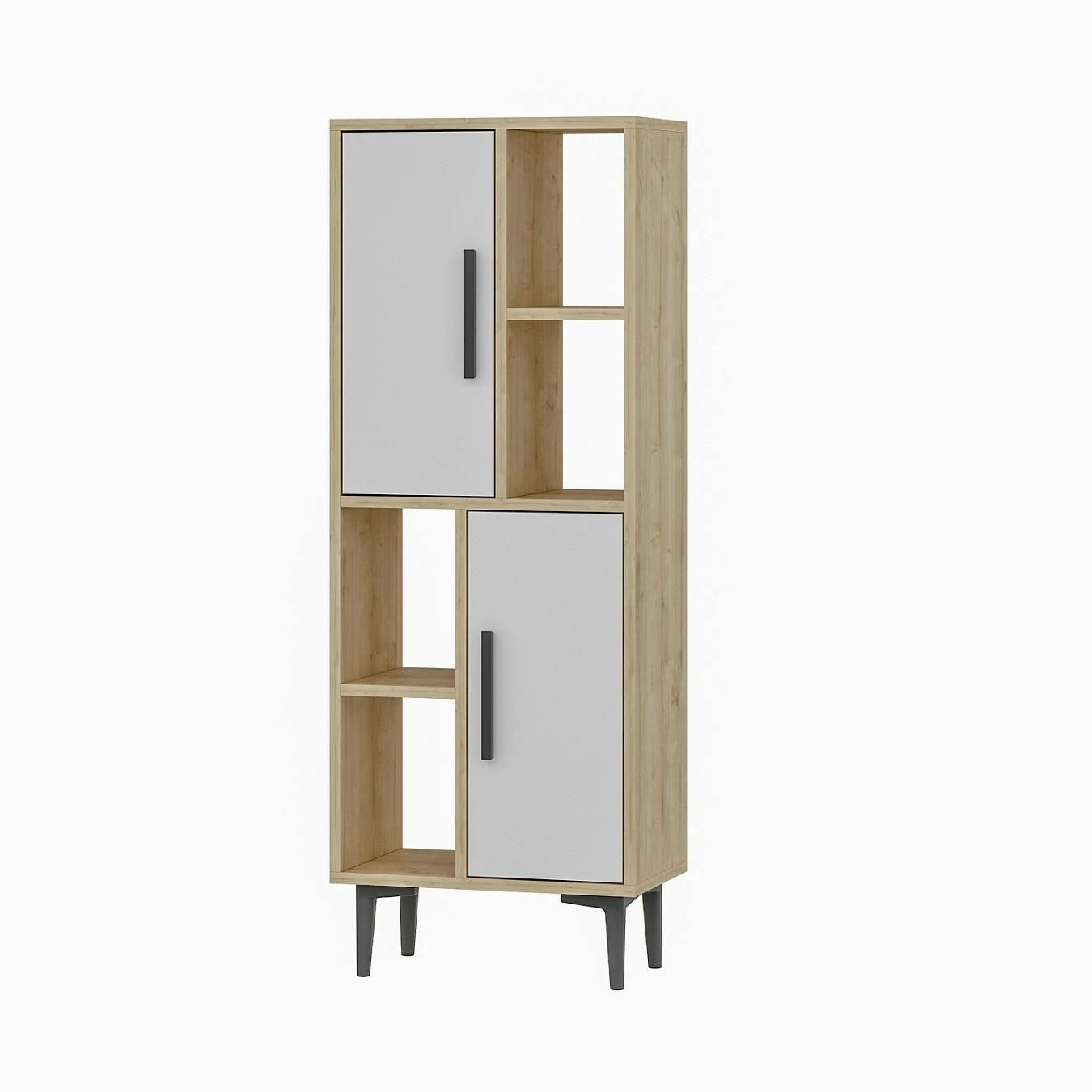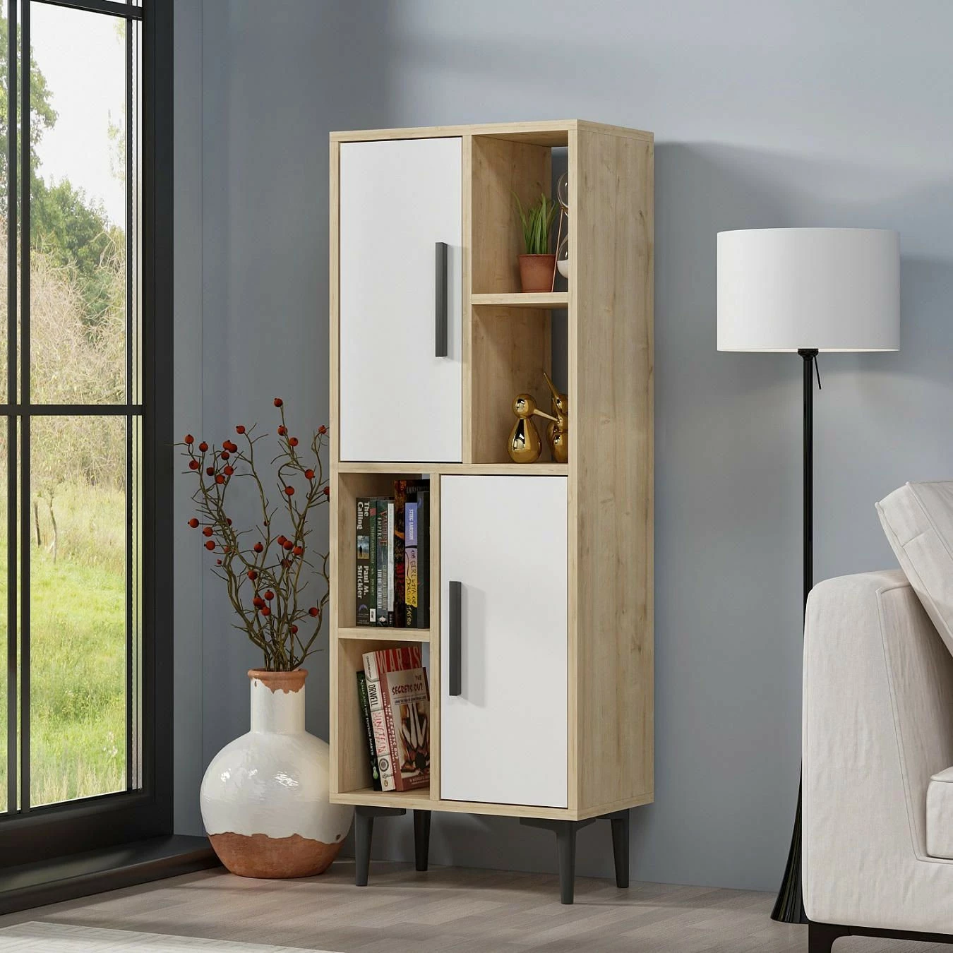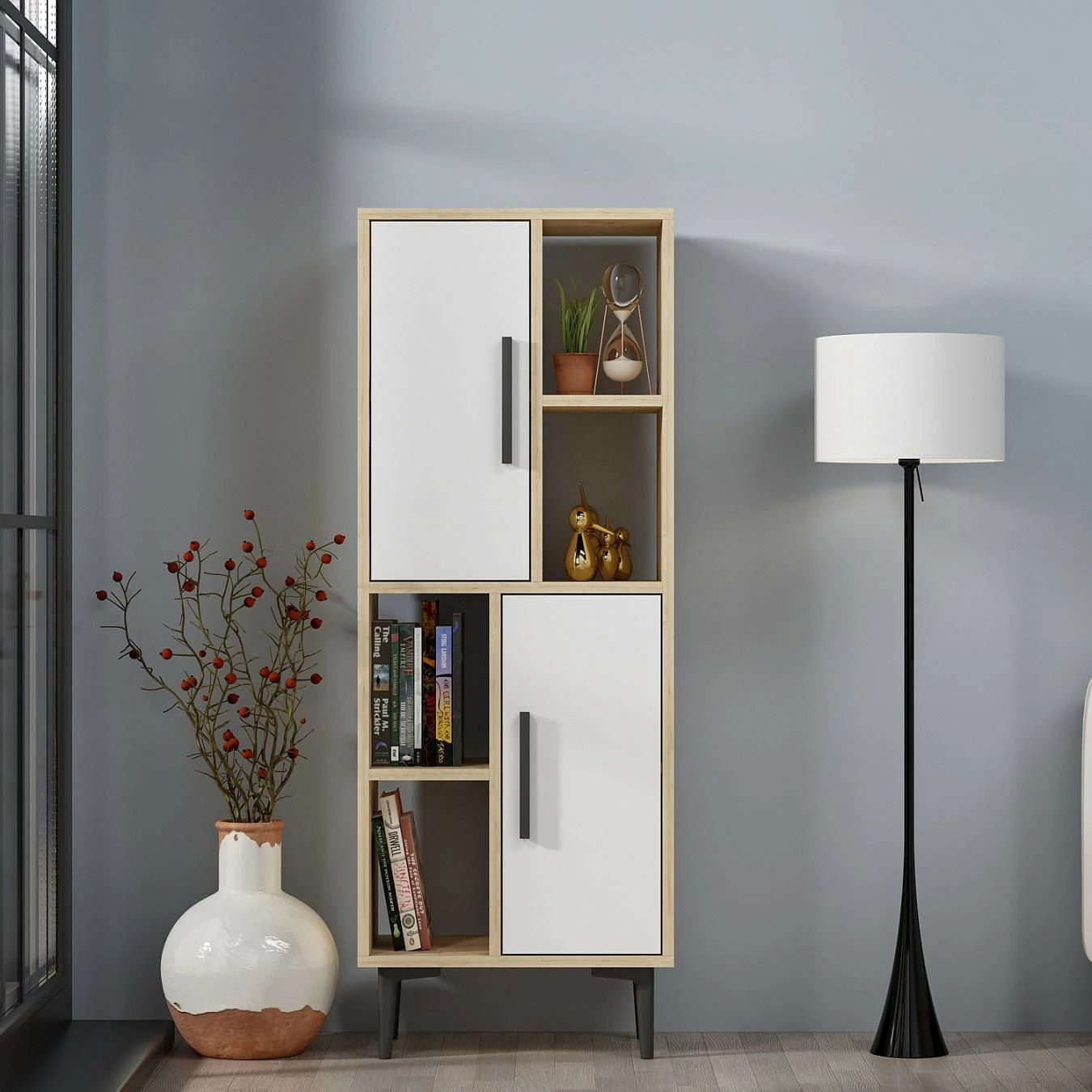 Avohyllyllinen kaappi tai kaapeilla varustettu kirjahylly – Lenistä on moneksi. Tummat jalat, ruskea runko ja valkoiset ovet.