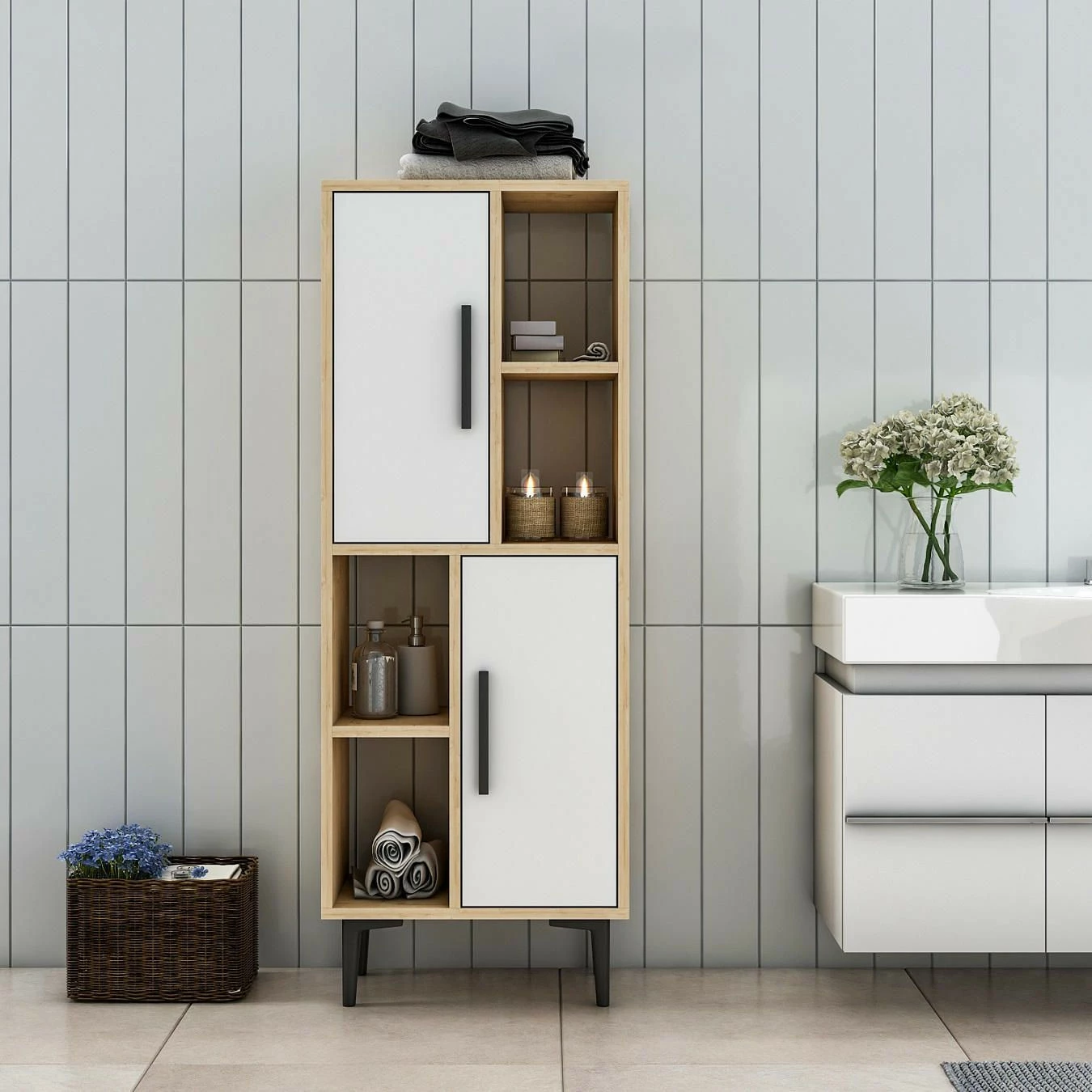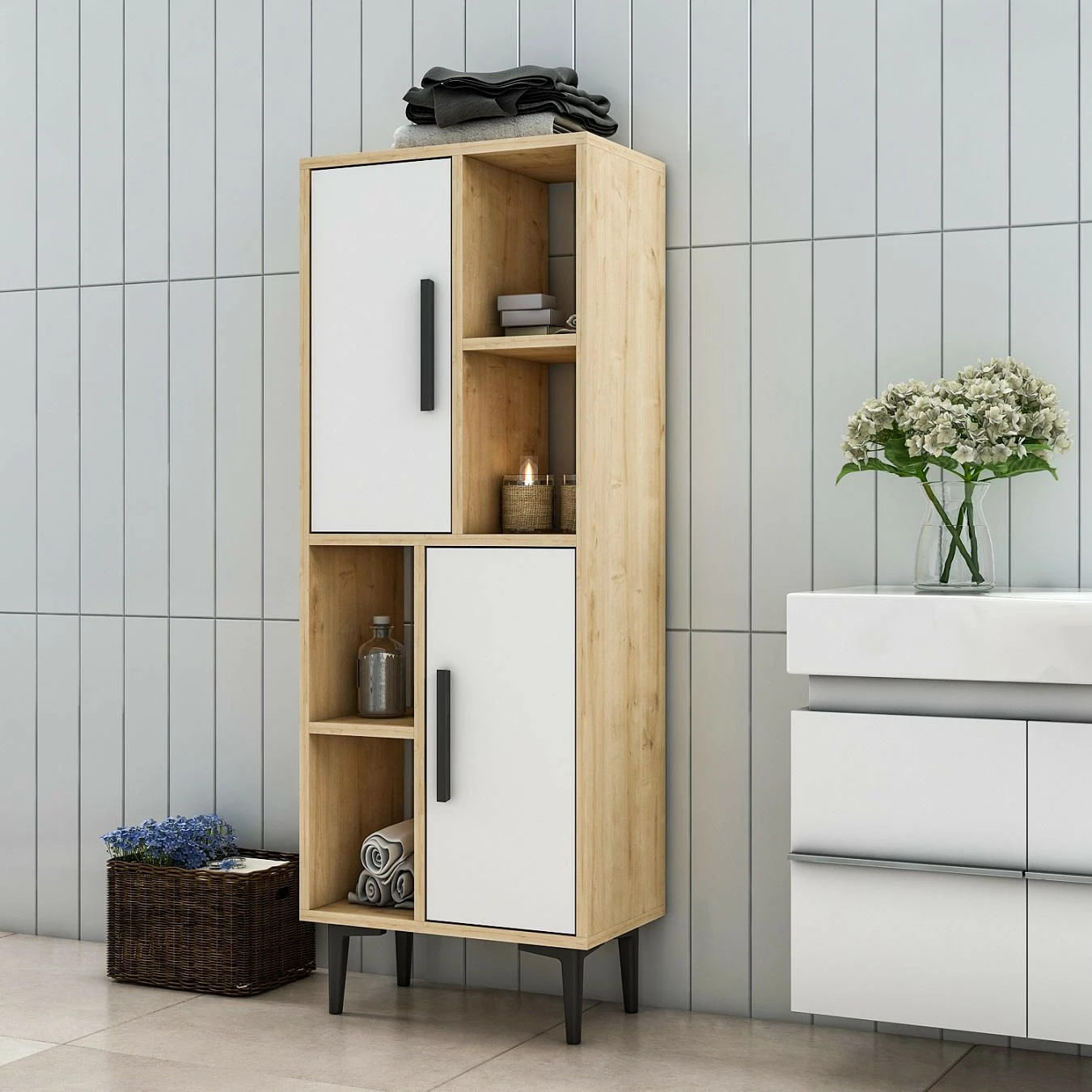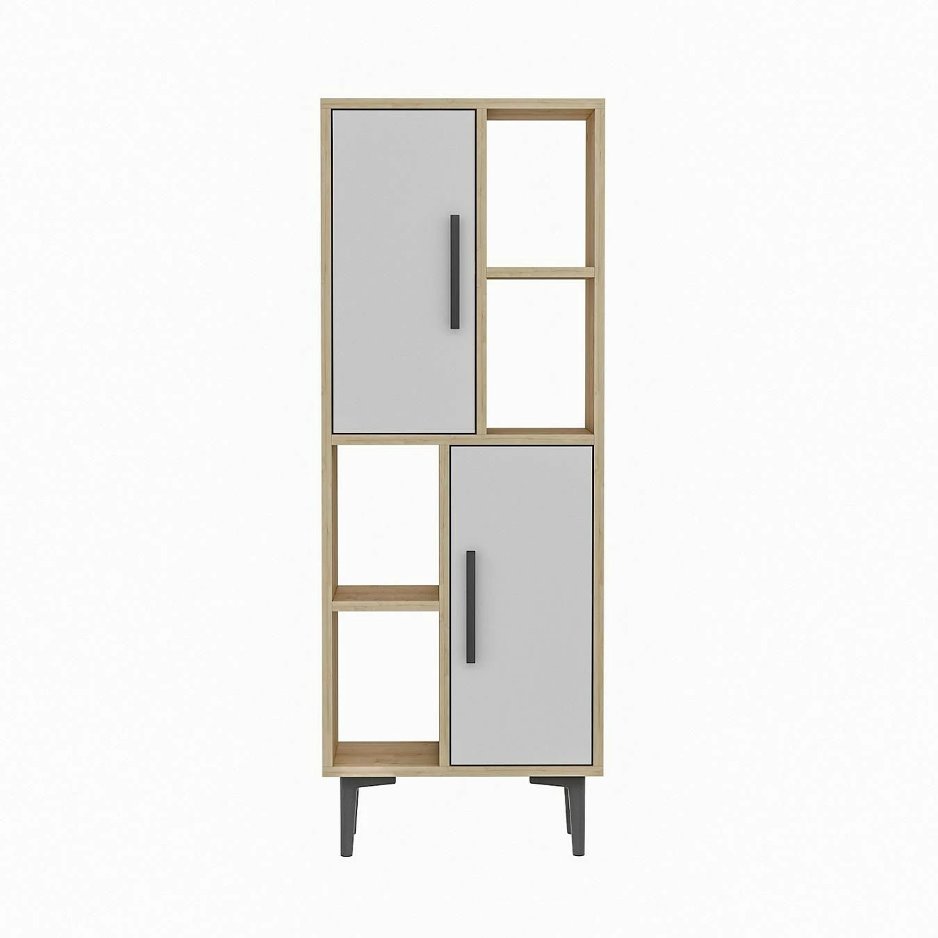 Avohyllyllinen kaappi tai kaapeilla varustettu kirjahylly – Lenistä on moneksi. Tummat jalat, ruskea runko ja valkoiset ovet.