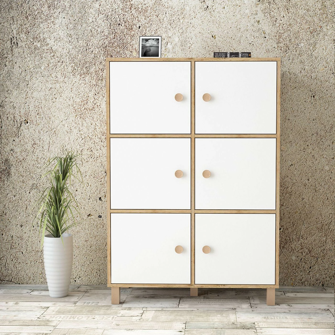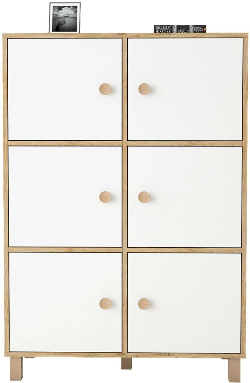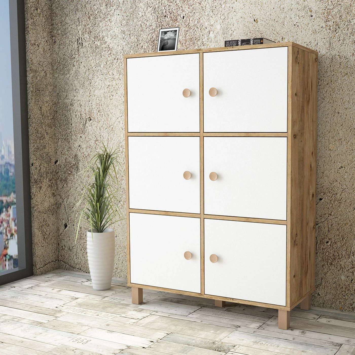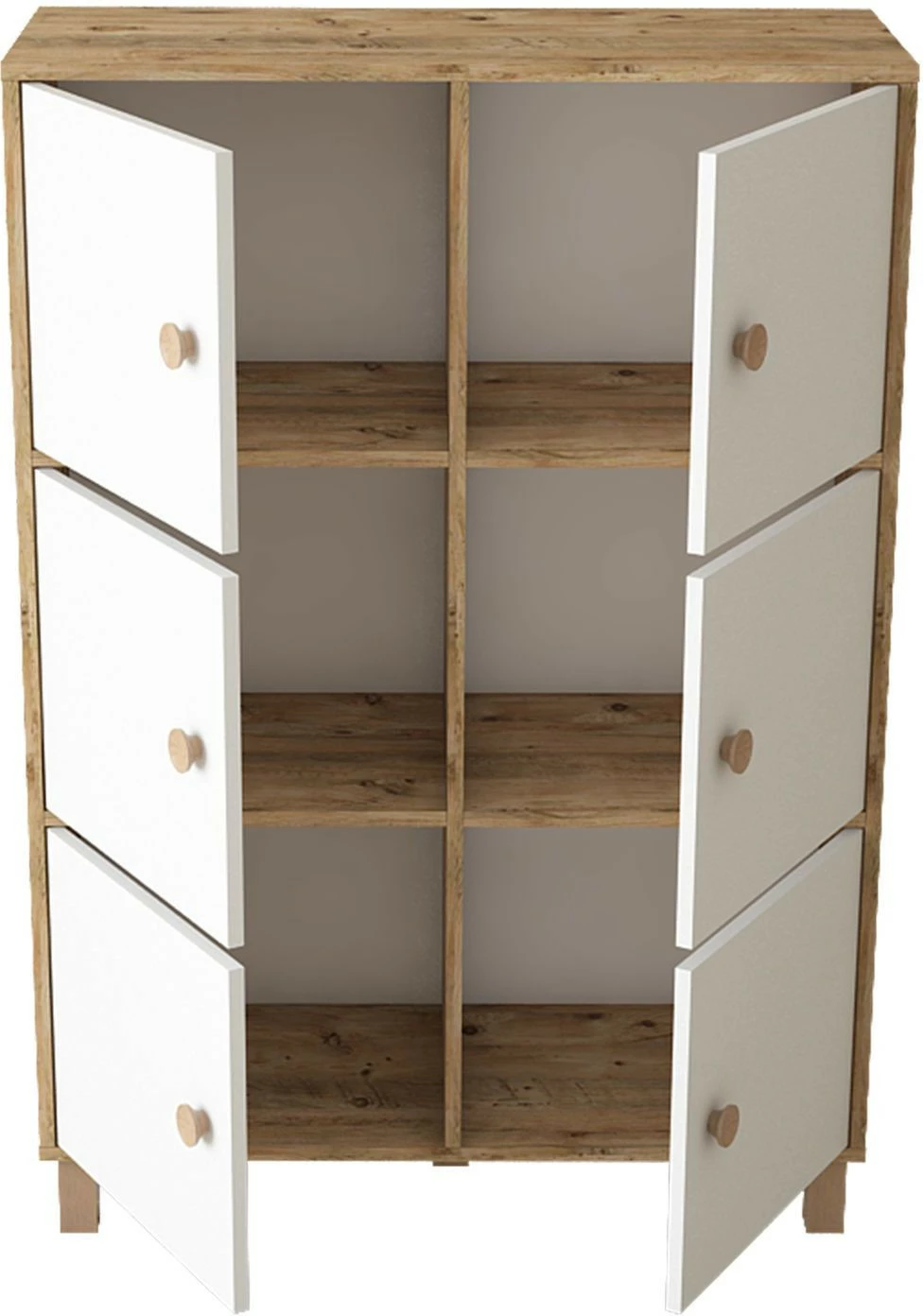 Kaksivärisessä säilytyskalusteessa on kuusi ovea. Rungon väri on puunruskea.
