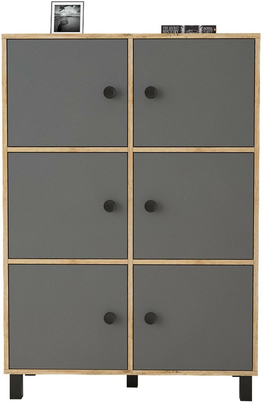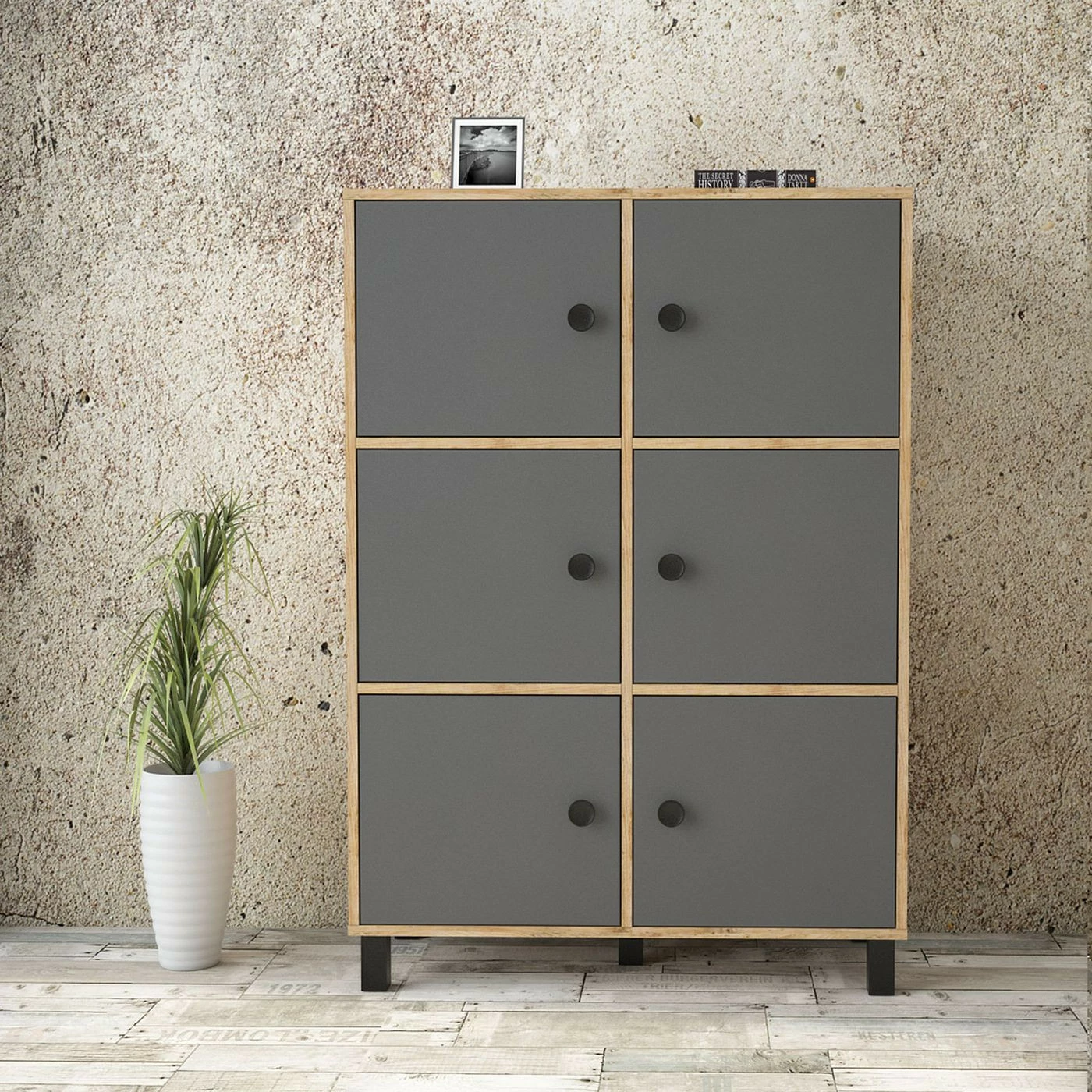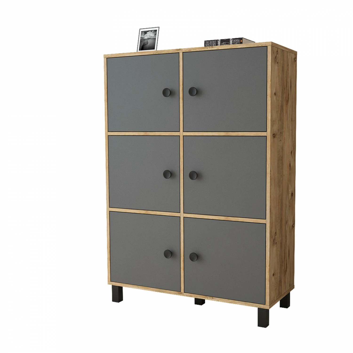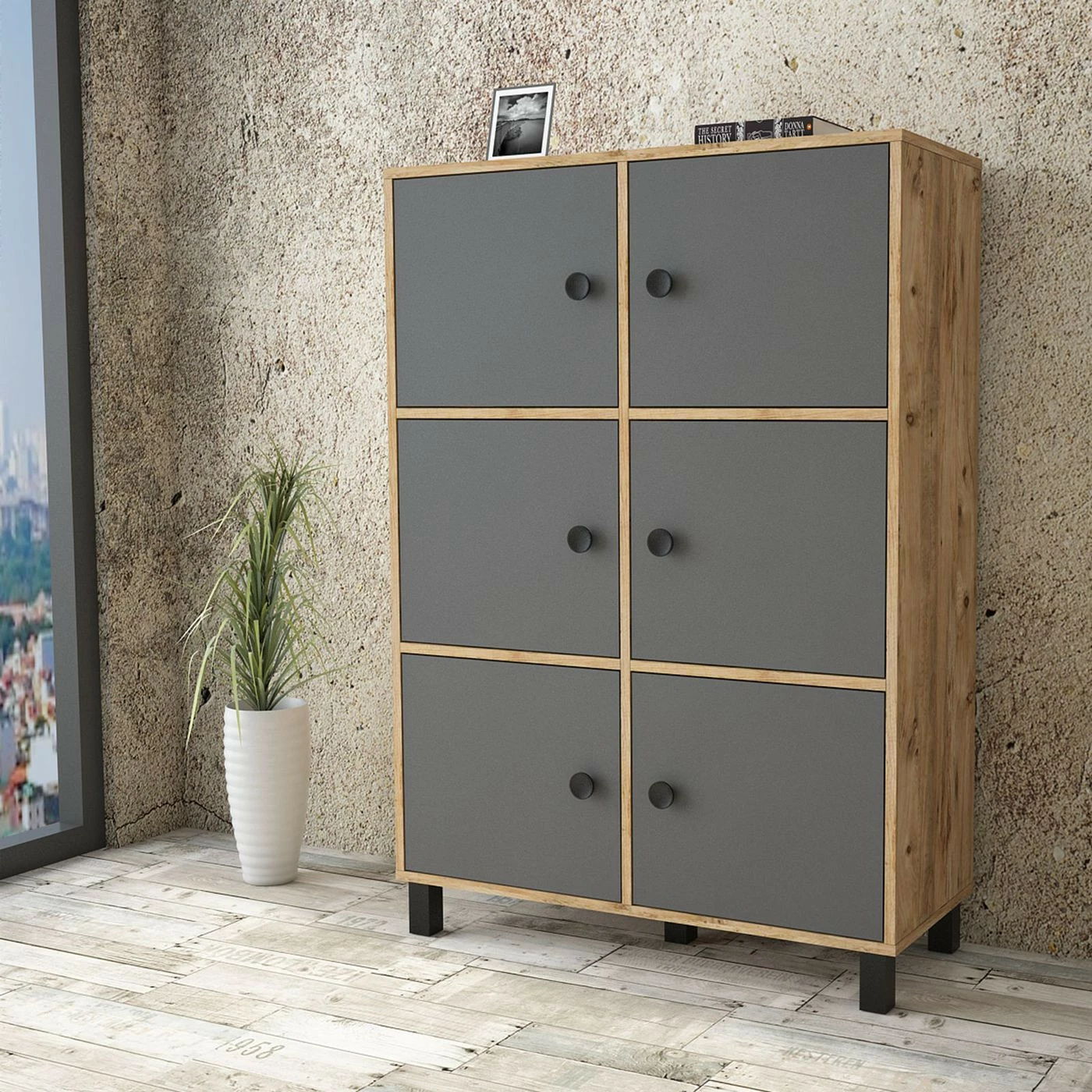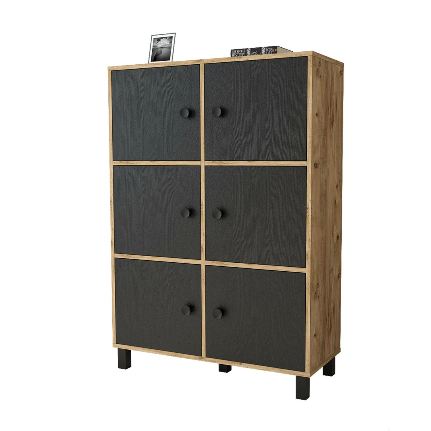 Kaksivärisessä säilytyskalusteessa on kuusi ovea. Rungon väri on puunruskea.