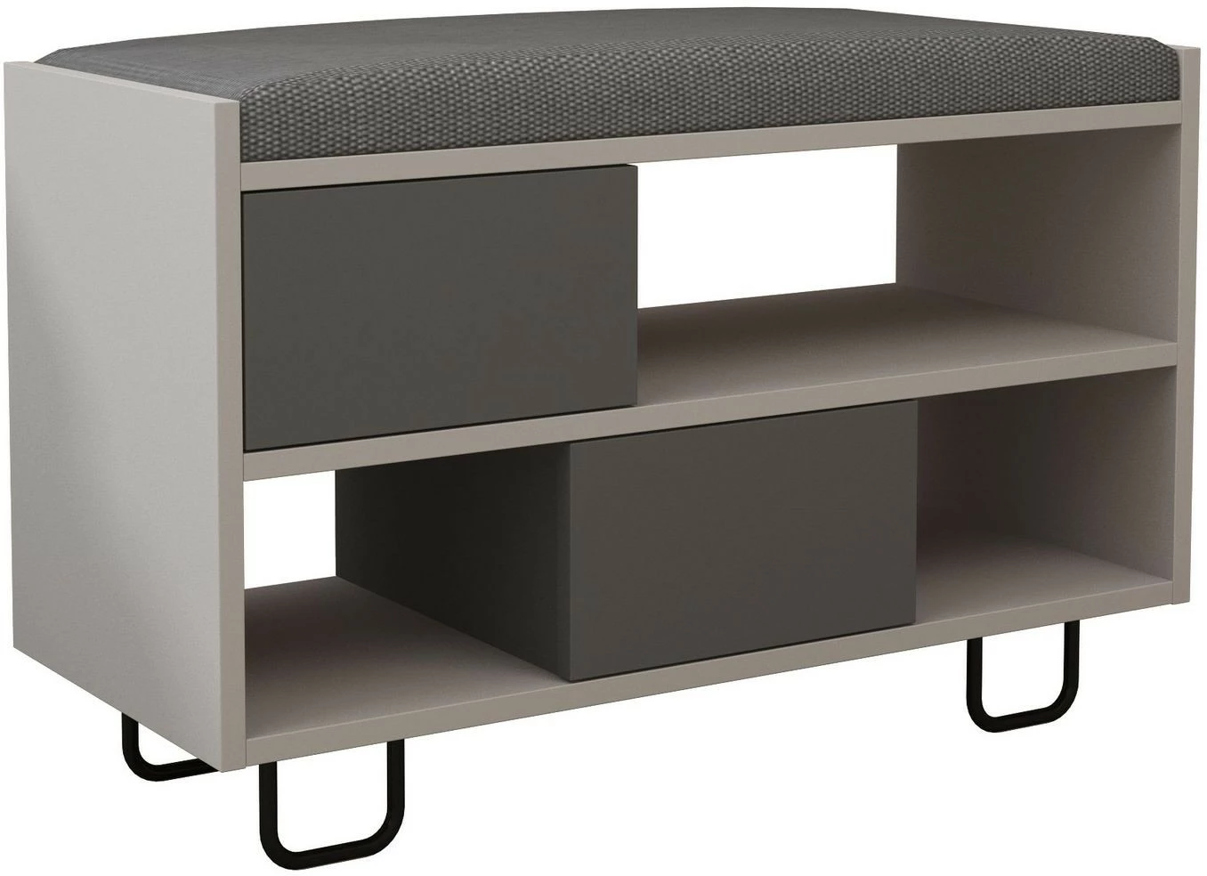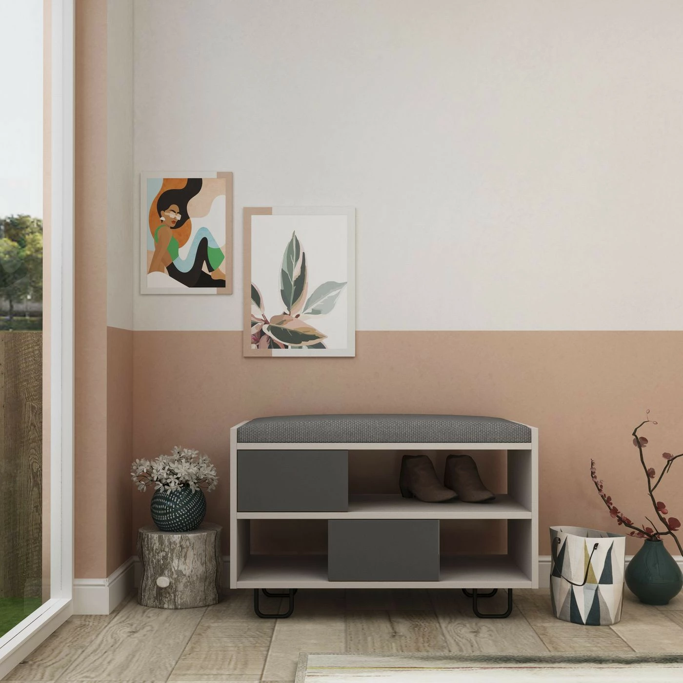 Taltuta eteisen kenkäkaaos Troy-kenkäkaapin avulla. Penkkimäisen kaapin päällä on harmaa pehmuste istumismukavuuden lisäämiseksi.