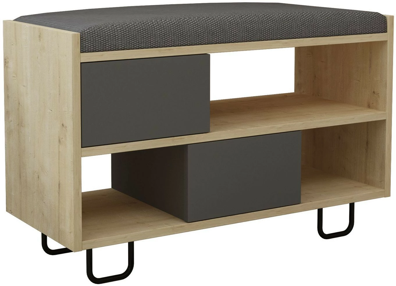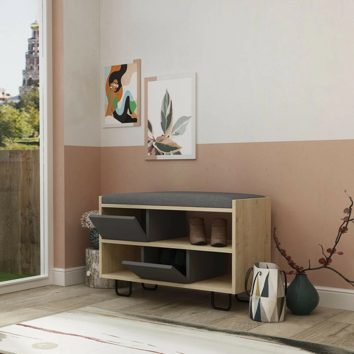 Taltuta eteisen kenkäkaaos Troy-kenkäkaapin avulla. Penkkimäisen kaapin päällä on harmaa pehmuste istumismukavuuden lisäämiseksi.