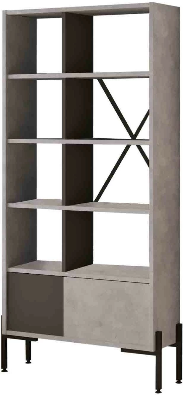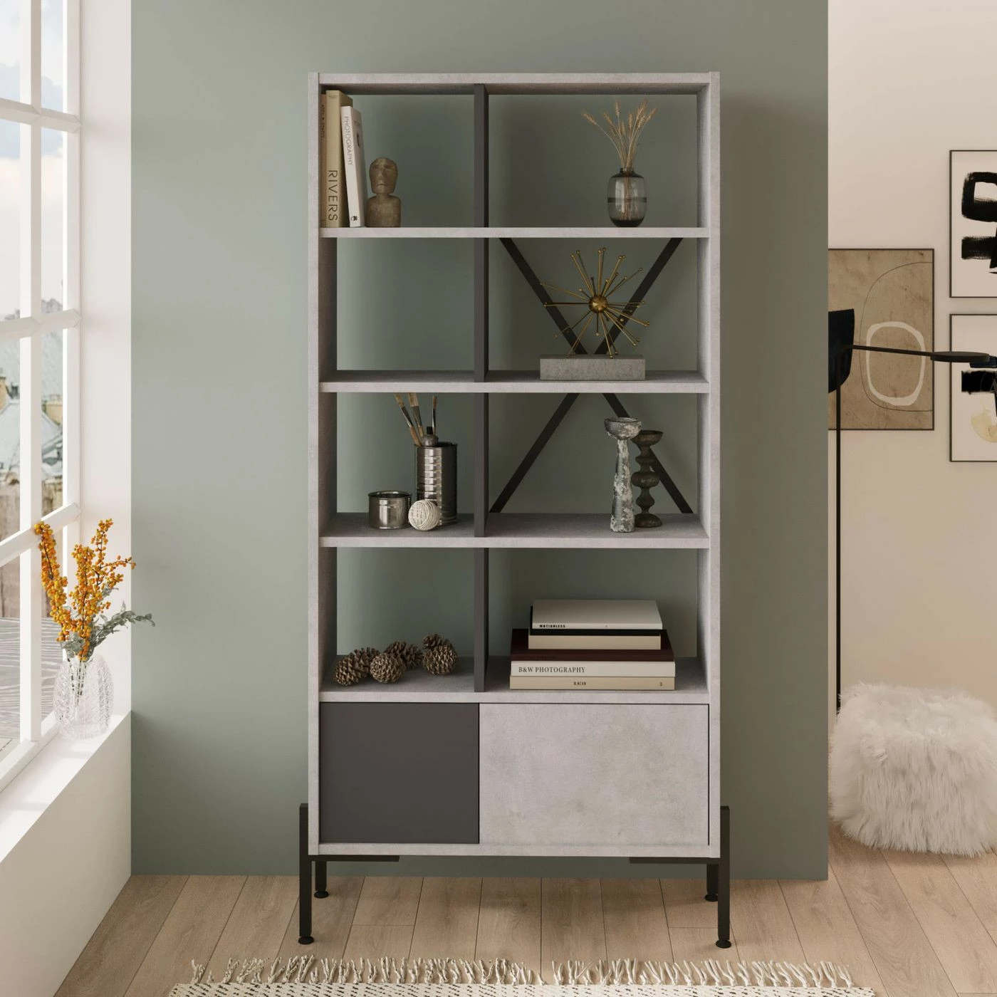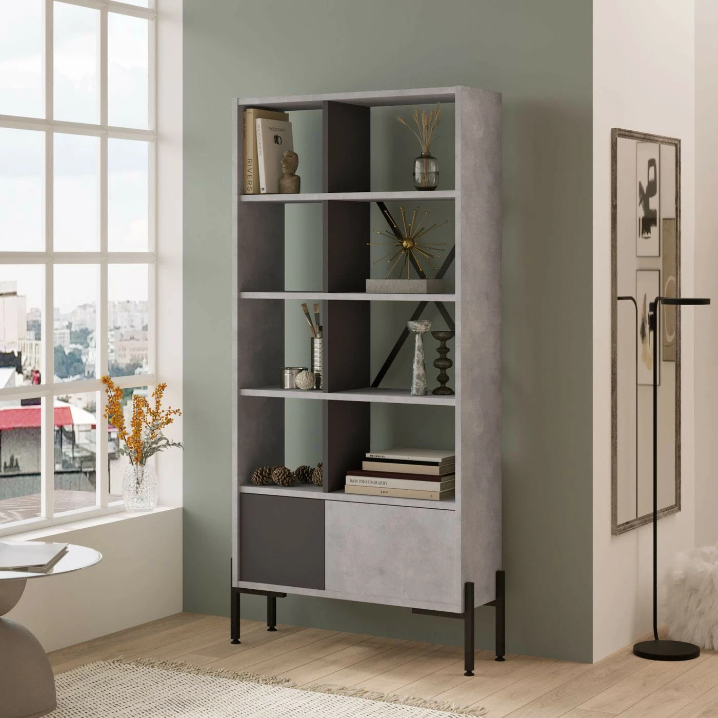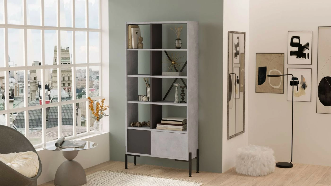 Vaaleanharmaa BO1-kirjahylly. Ala- ja keskiosassa on antrasiitinharmaa tehosteväri. Hyllyn jalat ovat metallia.