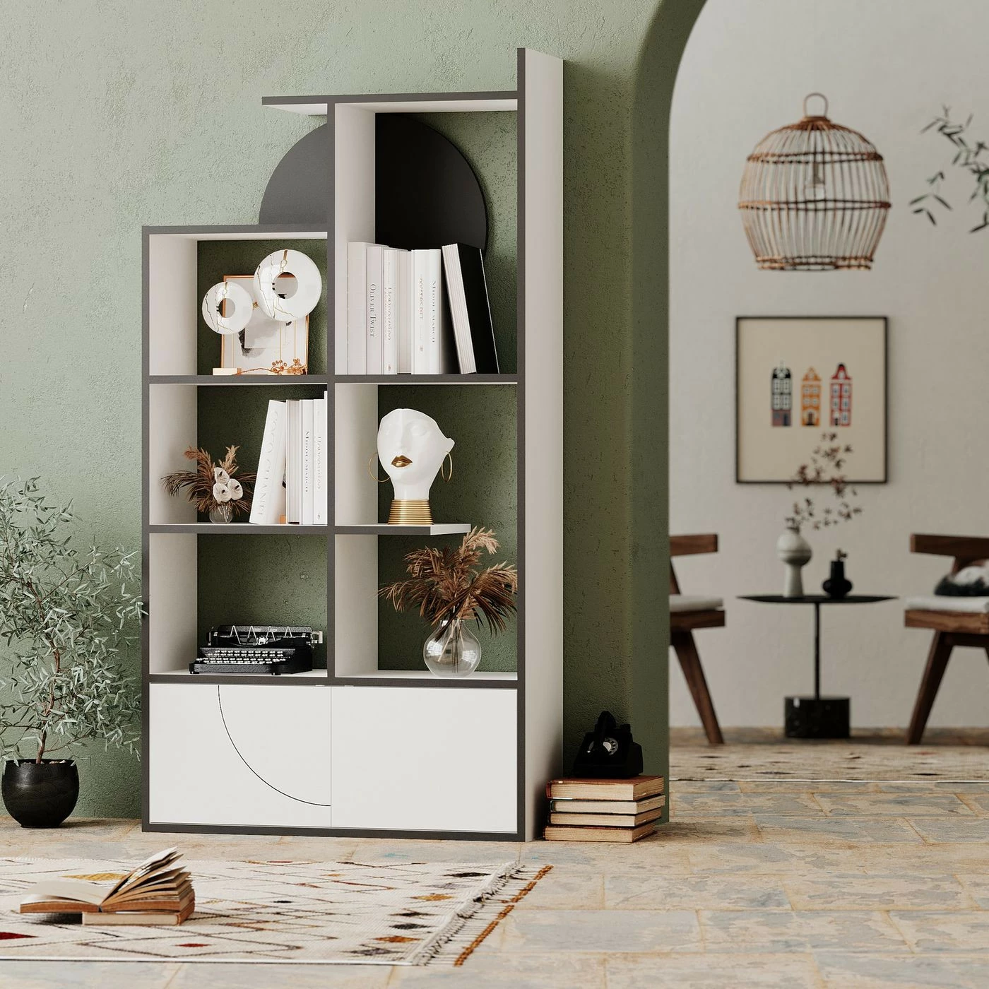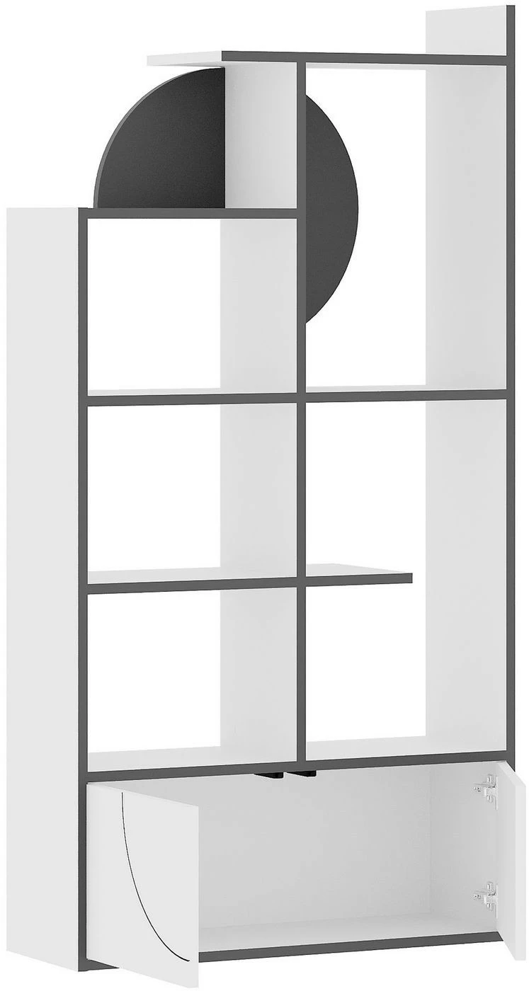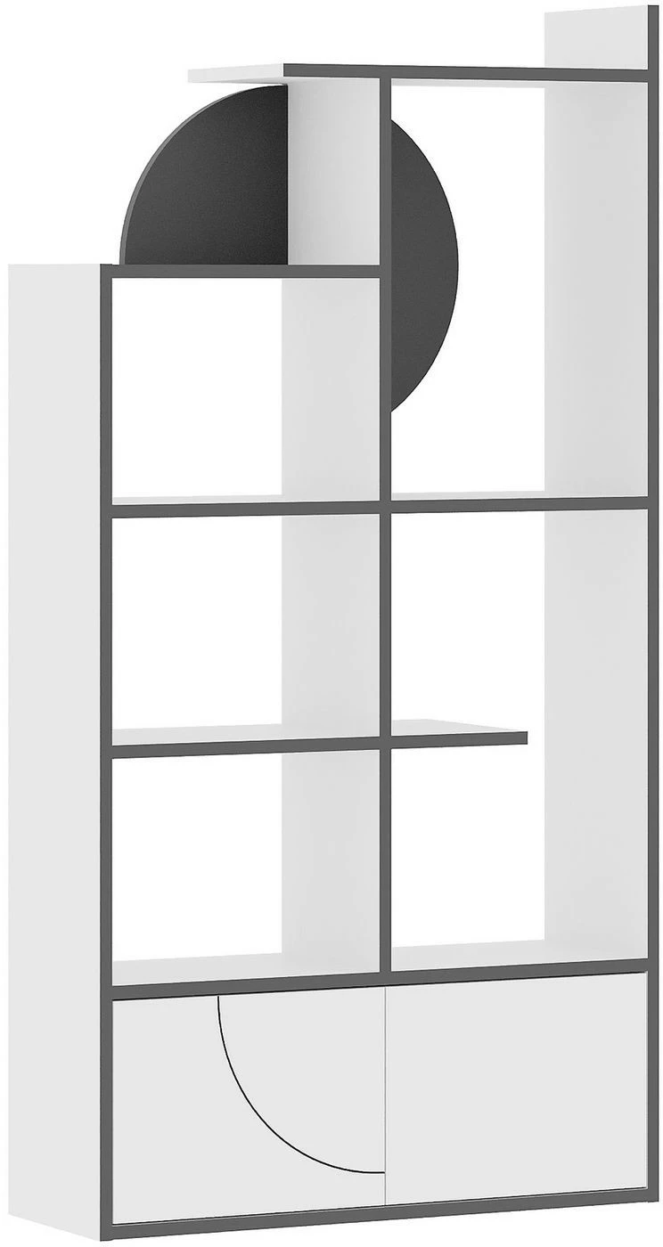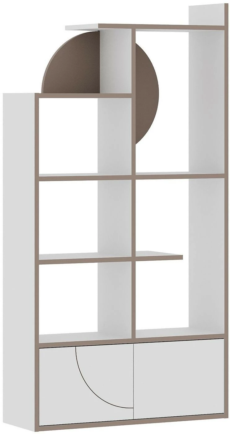 Omintakeinen Half-kirjahylly. Takaosan koriste tuo mieleen puolikuun. Runkoväri valkoinen.