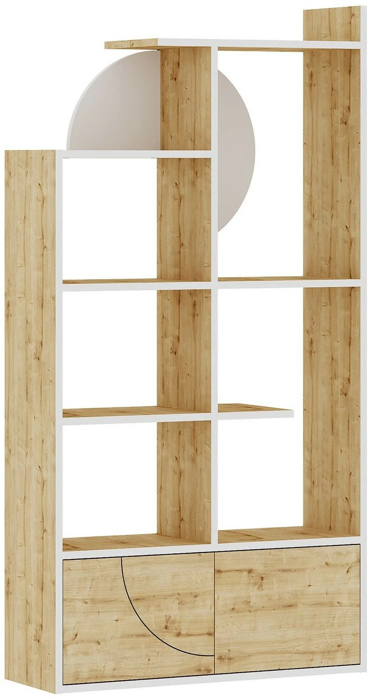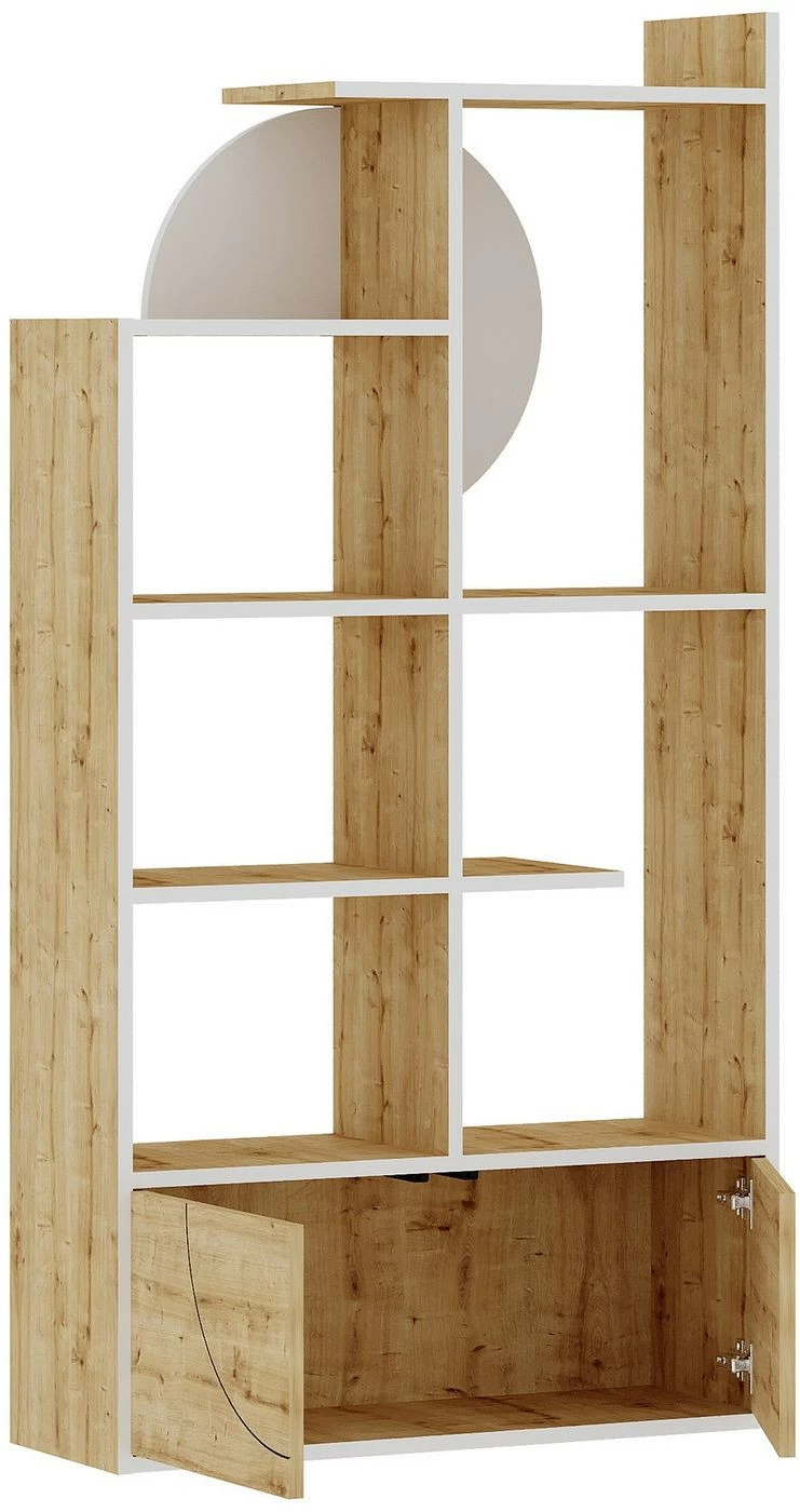 Omintakeinen Half-kirjahylly. Takaosan koriste tuo mieleen puolikuun.