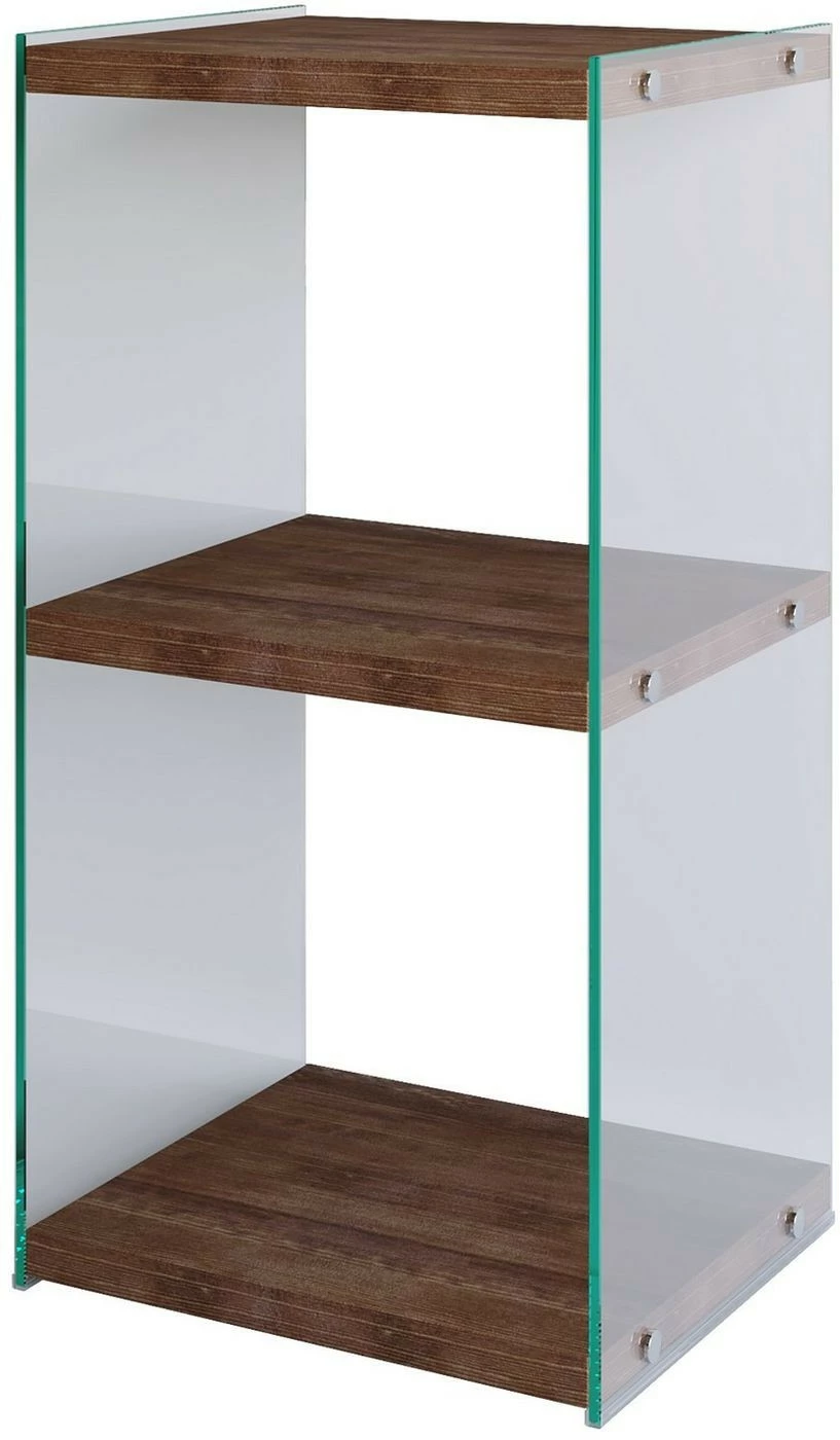 Kaunis pieni kirjahylly, jossa yhdistyvät lasin kepeys ja puun jämäkkyys.