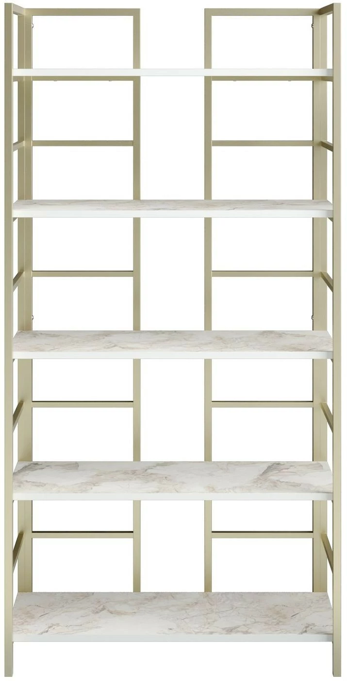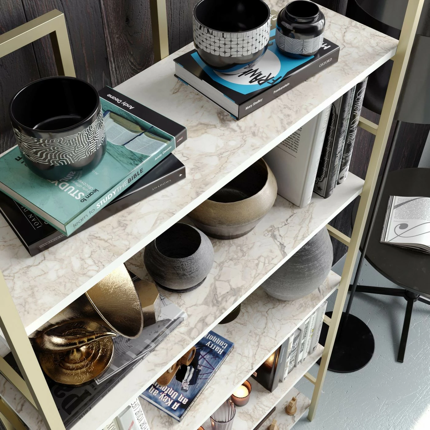 Tinleys-kirjahylly on sopivan ylellinen mutta ei överi. Kullanvärinen metallirunko ja vaaleat hyllyt.