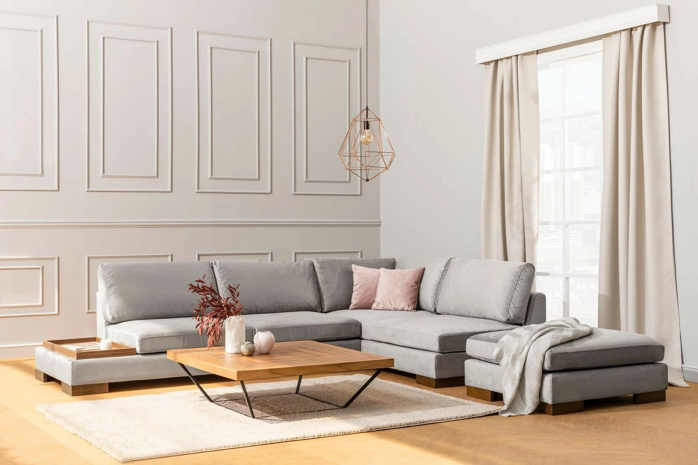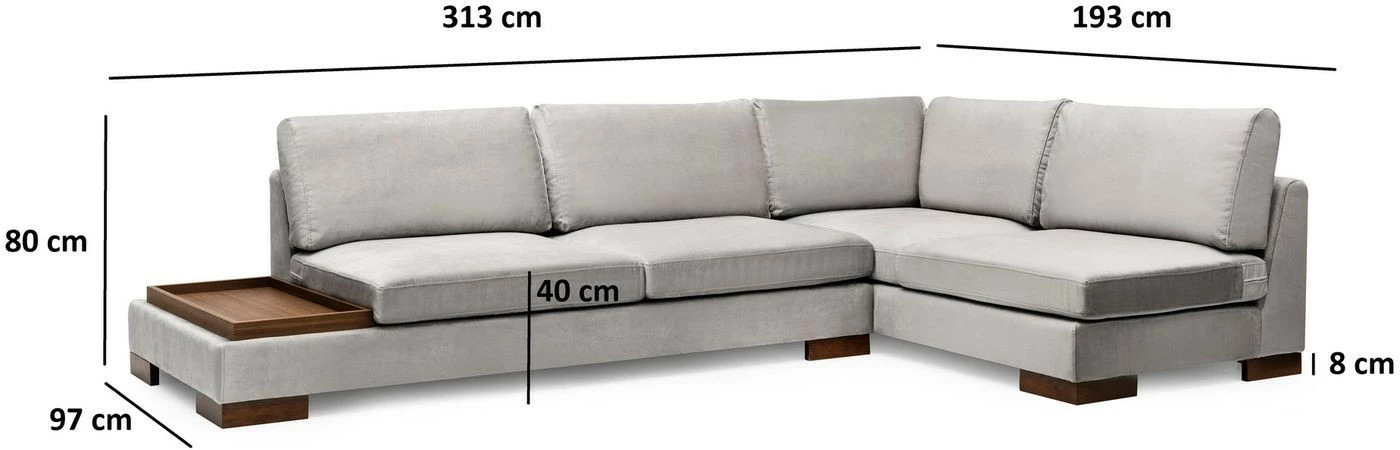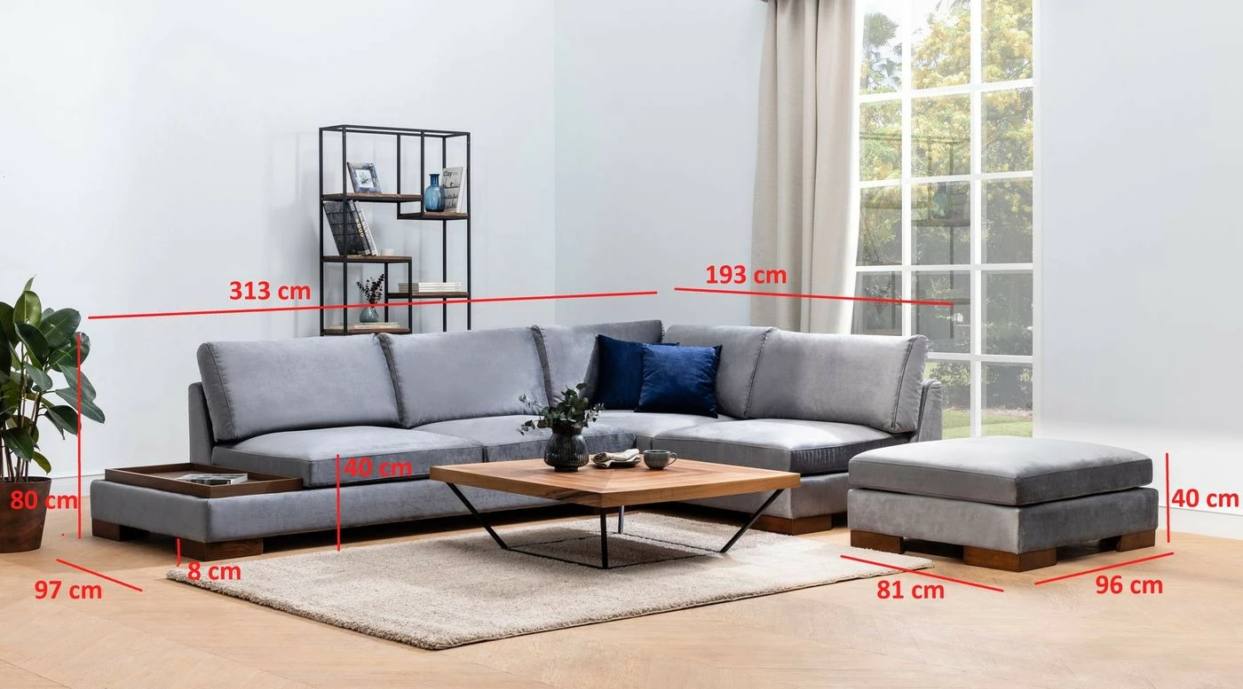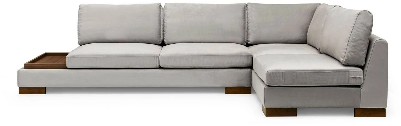 Tulip-kangassohva ja erillinen rahi. Kulmasohvan lyhyempi osa on edestäpäin katsottuna oikealla puolella. Vasemmassa päädyssä on matala osa, joka toimii säilytyspaikkana ja laskutilana kaukosäätimille, lehdille ja virvokkeille.