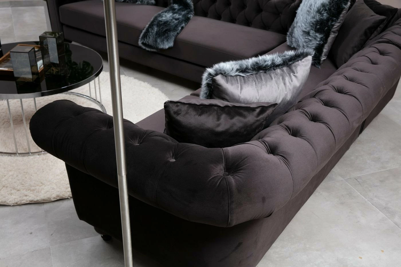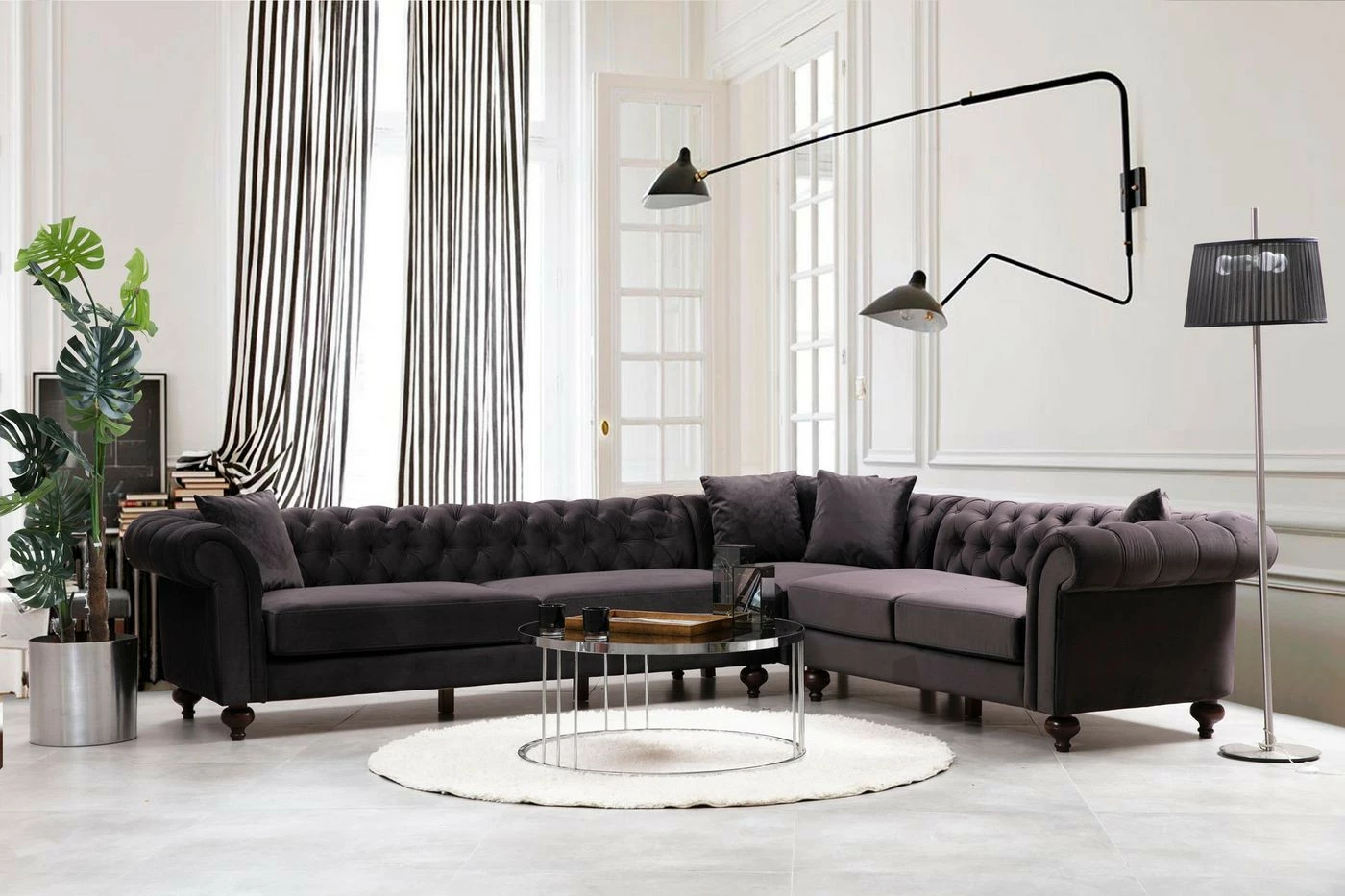 Komea Bogart-kulmasohva kutsuu viettämään aikaa isommallakin seurueella. Tekstiiliverhoilu ja mustat puiset jalat. Lyhyempi osa on edestäpäin katsottuna oikealla puolella. Lyhyemmän osan leveys on 263 cm.