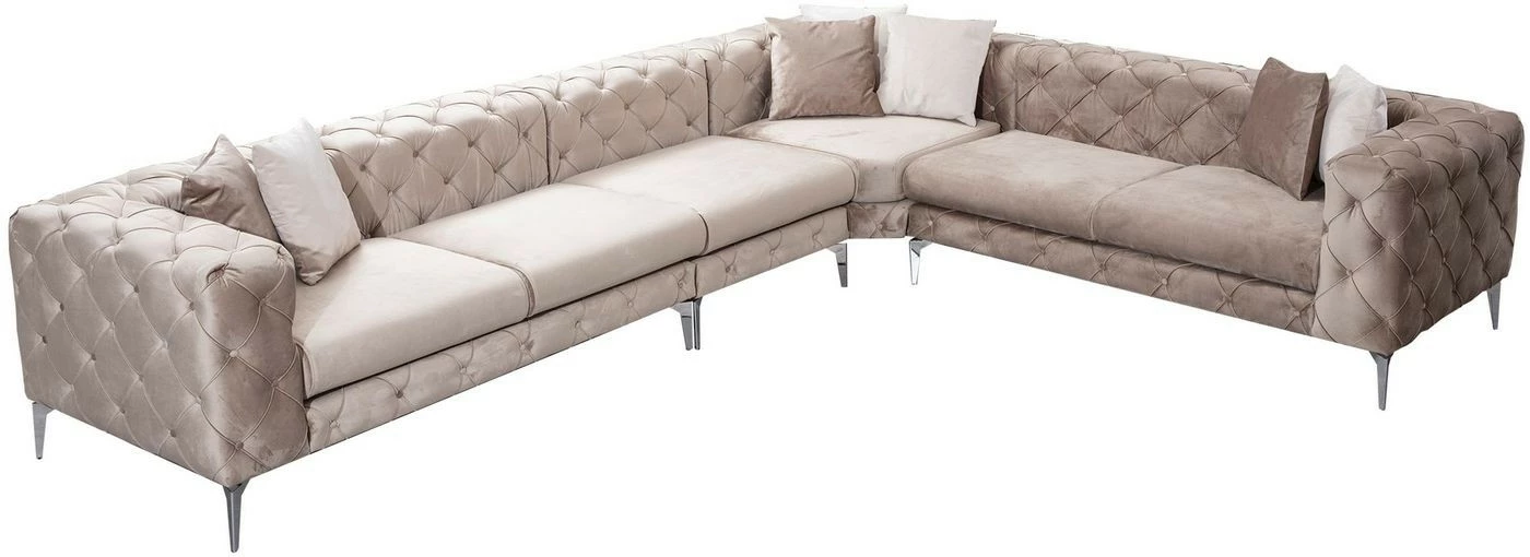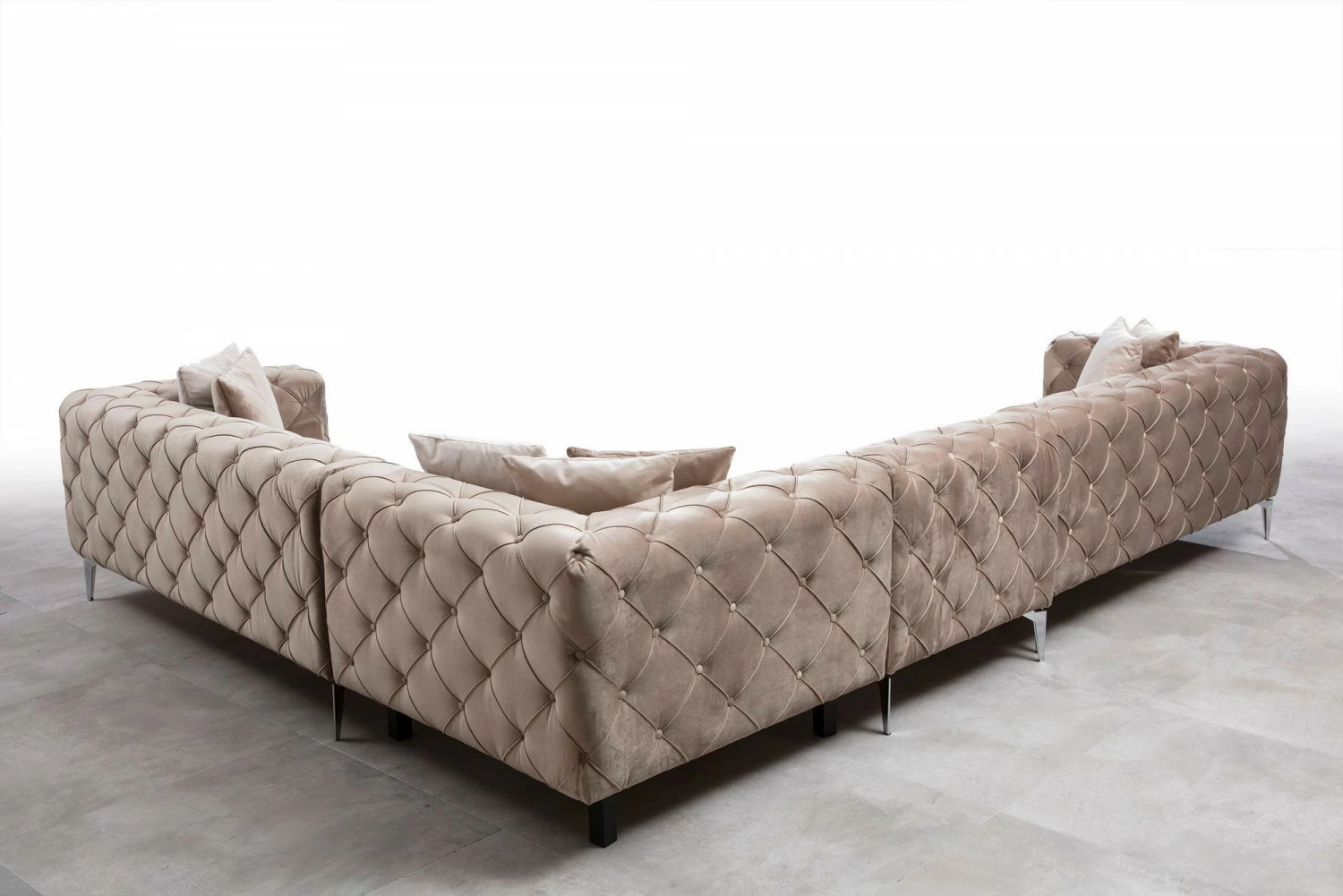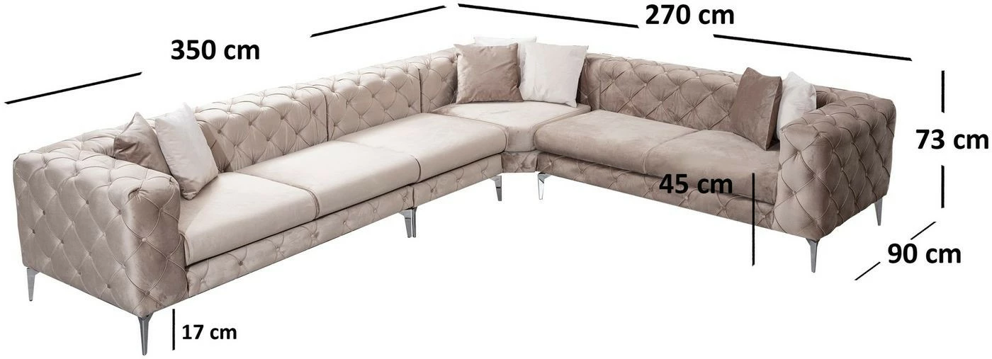 Como-sohvassa on ylellinen tekstiiliverhoilu ja mattamustat metallijalat. Oikeakätisen sohvan lyhyempi osa on edestäpäin katsottuna oikealla puolella. Mukana toimitetaan kaksi koristetyynyä.