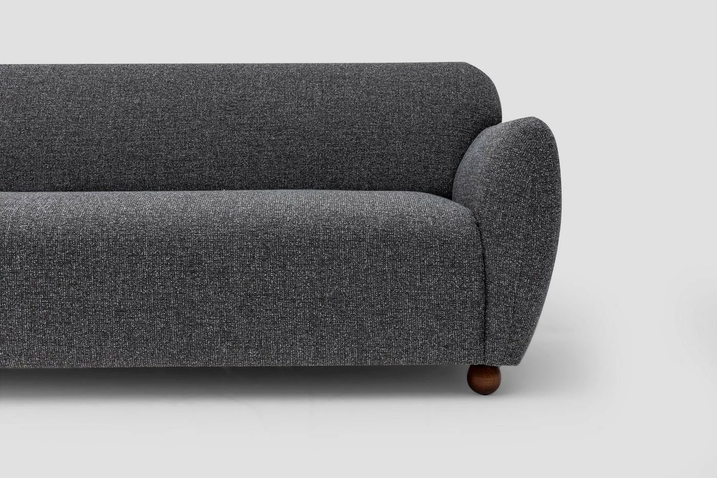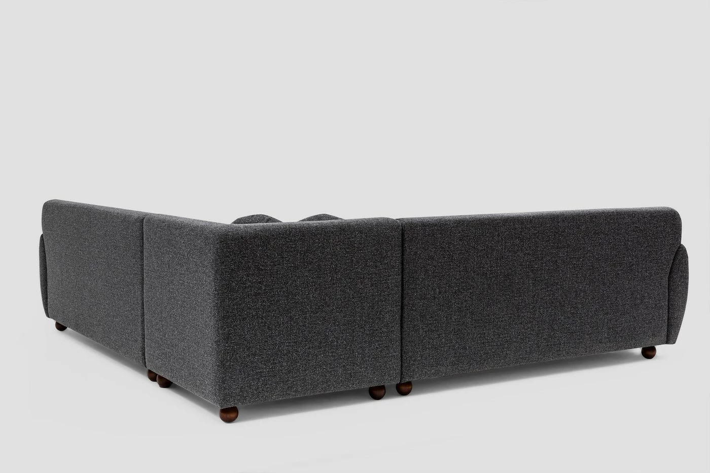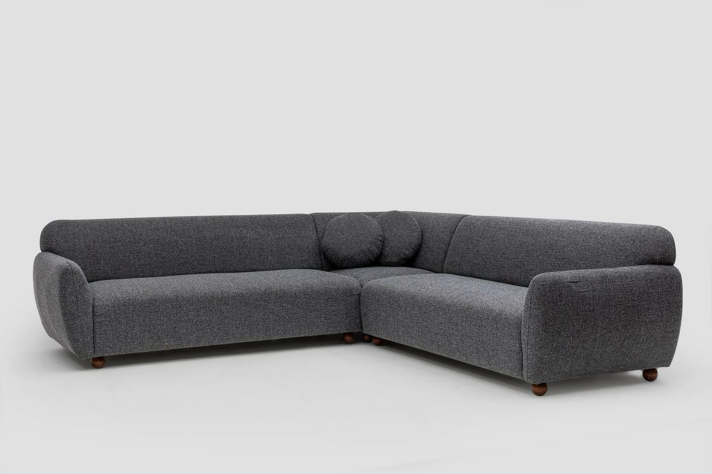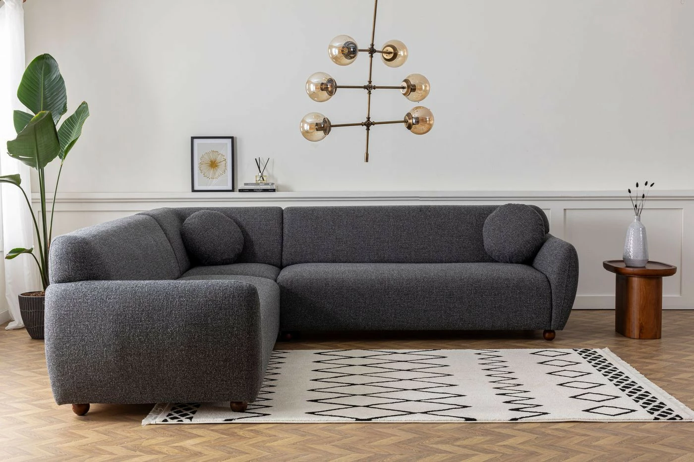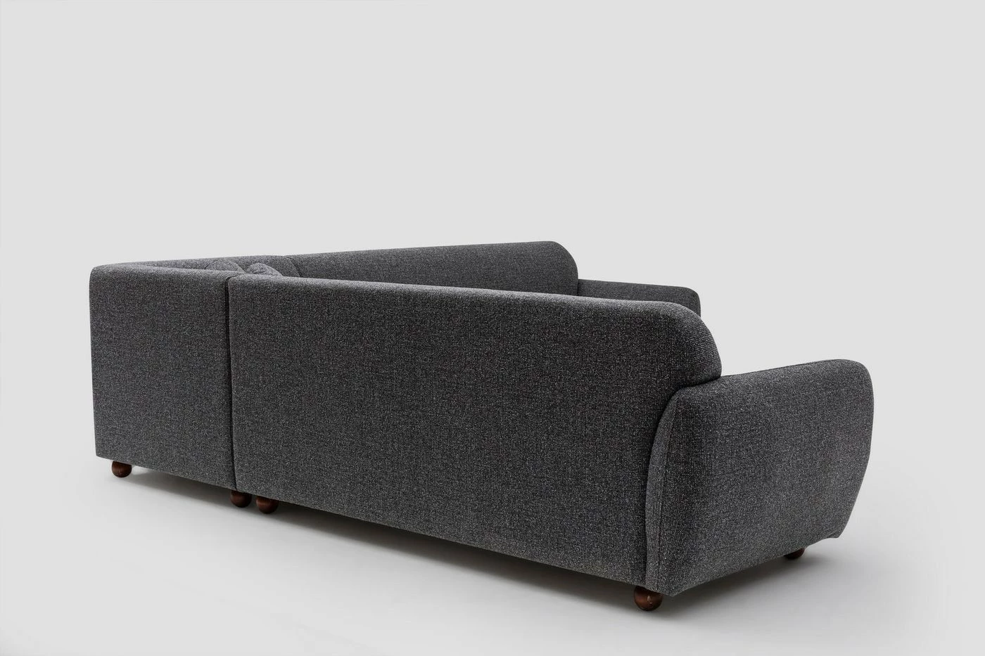 Ihanan muhkea Eddy-kulmasohva kutsuu viettämään aikaa isommallakin porukalla. Verhoilu kangasta, jalat puuta.