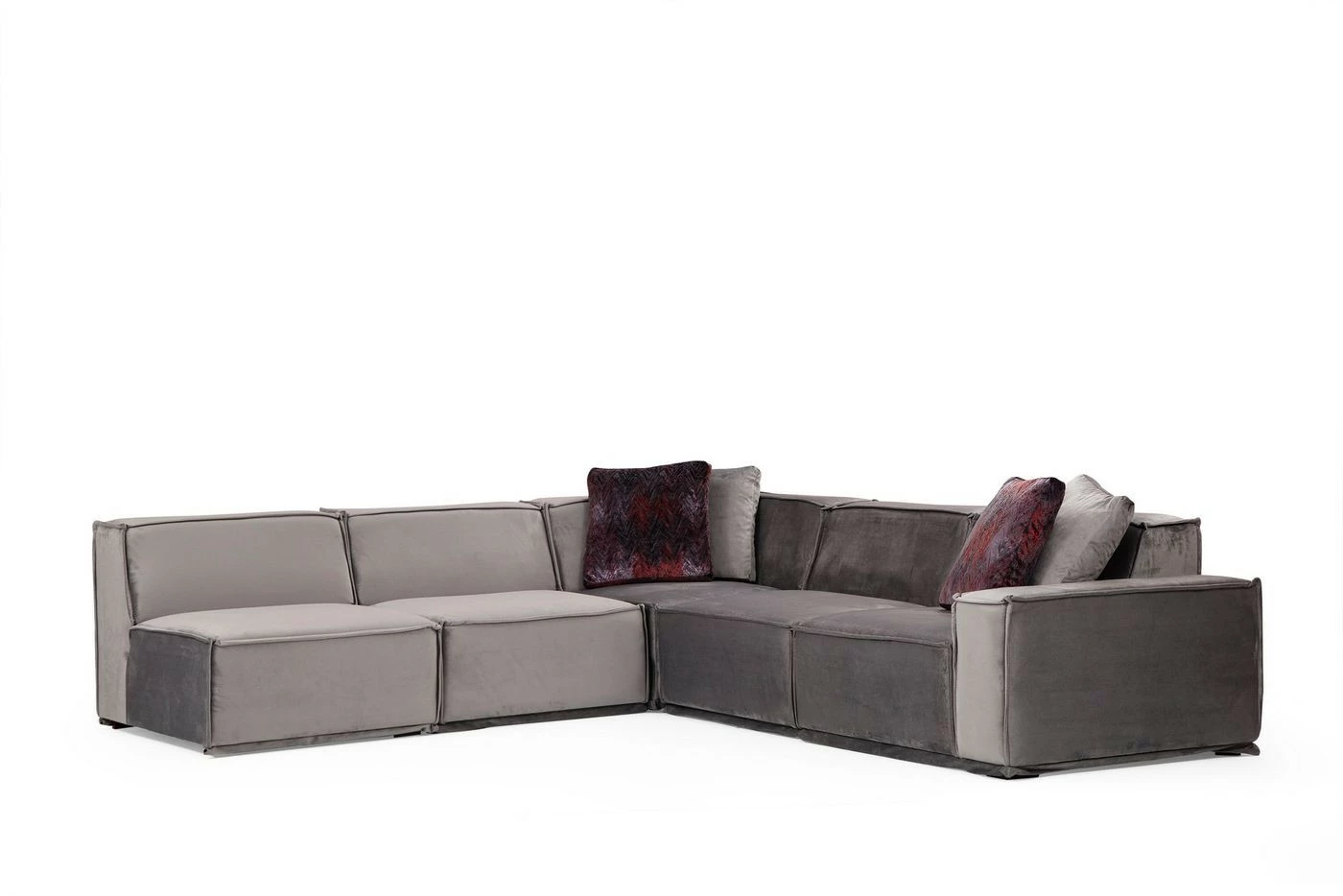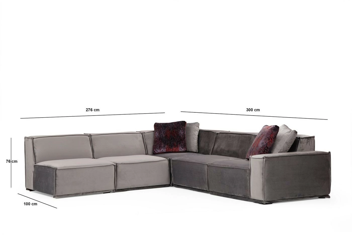 Kuudenistuttavassa Lego-kulmasohvassa on kaunis tekstiiliverhoilu harmaan sävyissä. Lyhyempi osa vasemmalla puolella. Mukana toimitetaan neljä koristetyynyä.