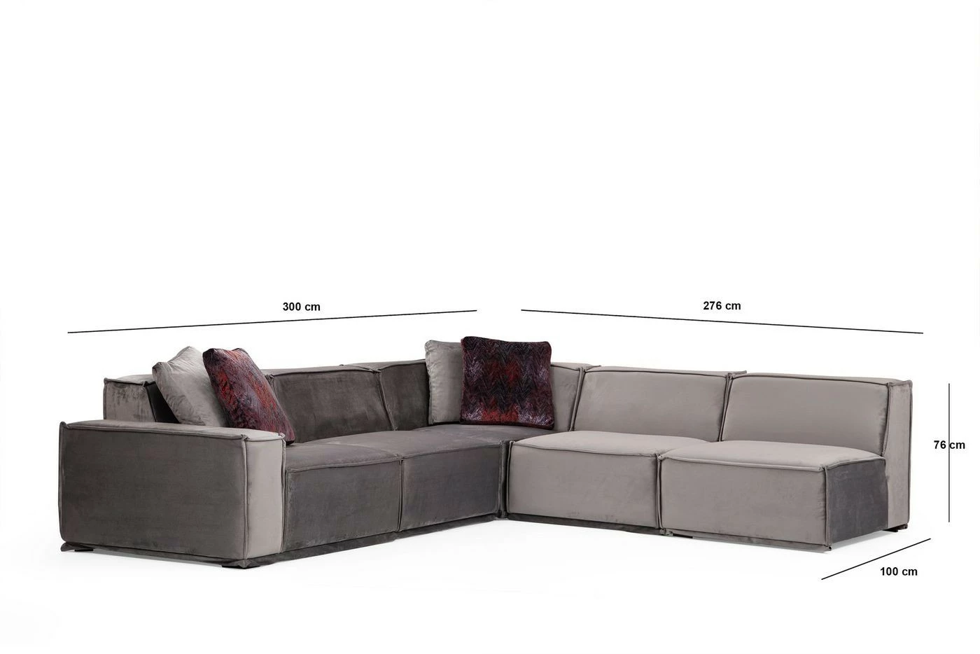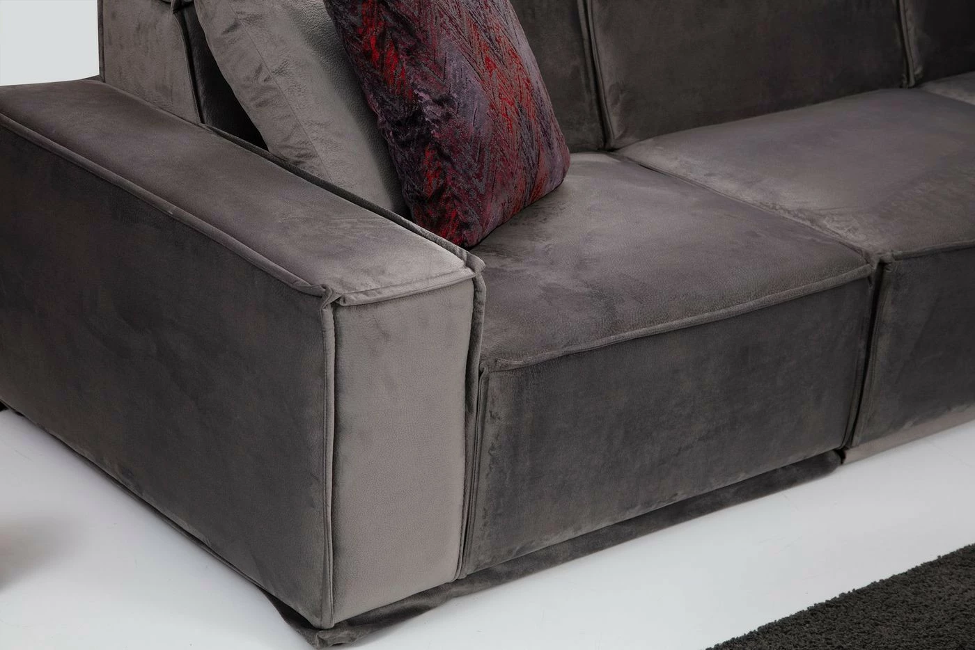 Kuudenistuttavassa Lego-kulmasohvassa on kaunis tekstiiliverhoilu harmaan sävyissä. Lyhyempi osa oikealla puolella. Mukana toimitetaan neljä koristetyynyä.