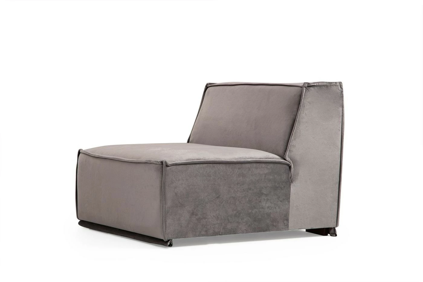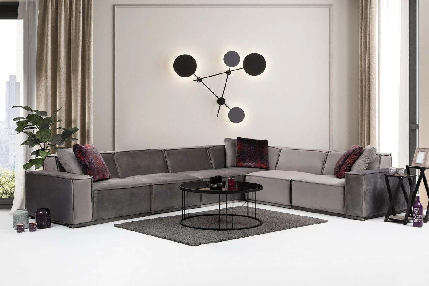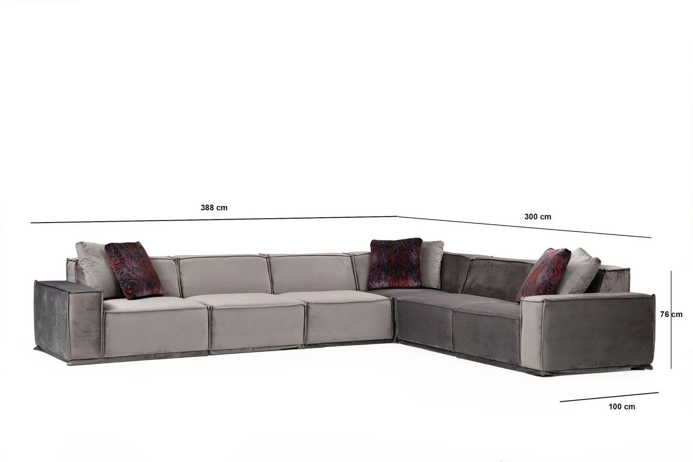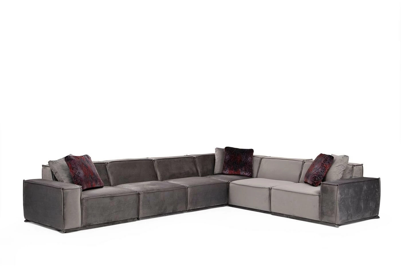 Kuudelle istujalle mitoitetussa Lego-kulmasohvassa on kaunis tekstiiliverhoilu harmaan sävyissä. Lyhyempi osa oikealla puolella. Mukana toimitetaan neljä koristetyynyä.