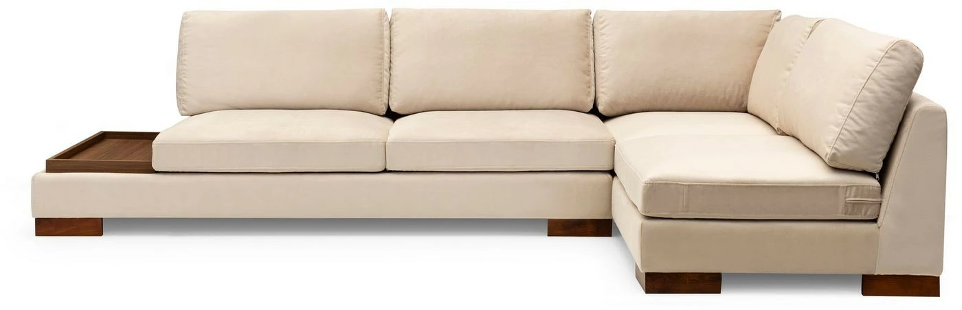 Kaunis Tulip-kangassohva. Kulmasohvan lyhyempi osa on edestäpäin katsottuna oikealla puolella. Vasemmassa päädyssä on matala osa, joka toimii säilytyspaikkana ja laskutilana kaukosäätimille, lehdille ja virvokkeille. Kuvan rahi ei sisälly toimitukseen.