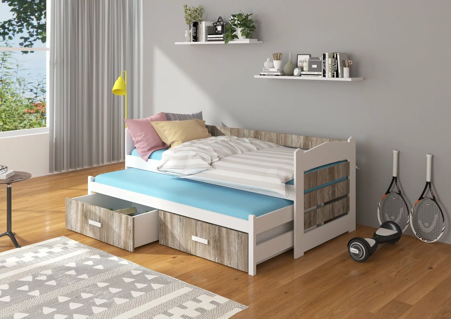 Etsitkö kahden hengen lastensänkyä? Suosittelemme kiinnittämään huomiota Tiarro-malliston sänkyihin, jotka ovat käytännöllisiä, mukavia ja näyttävät hyvältä missä tahansa huoneessa. Alasänky on ulos vedettävä, joten huonekalut eivät vie paljon tilaa huoneessa ja laatikot auttavat lelujen tai vuodevaatteiden säilyttämisessä.