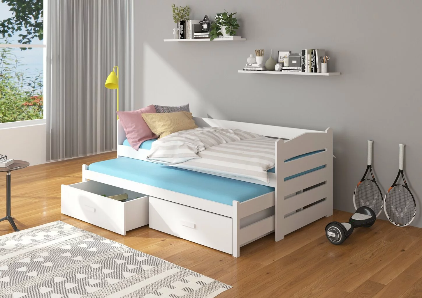 Etsitkö kahden hengen lastensänkyä? Suosittelemme Tiarro-malliston sänkyjä, jotka ovat käytännöllisiä, mukavia ja näyttävät hyvältä missä tahansa huoneessa. Alasänky on ulos vedettävä, joten huonekalut eivät vie paljon tilaa huoneessa ja laatikot auttavat lelujen tai vuodevaatteiden säilyttämisessä.