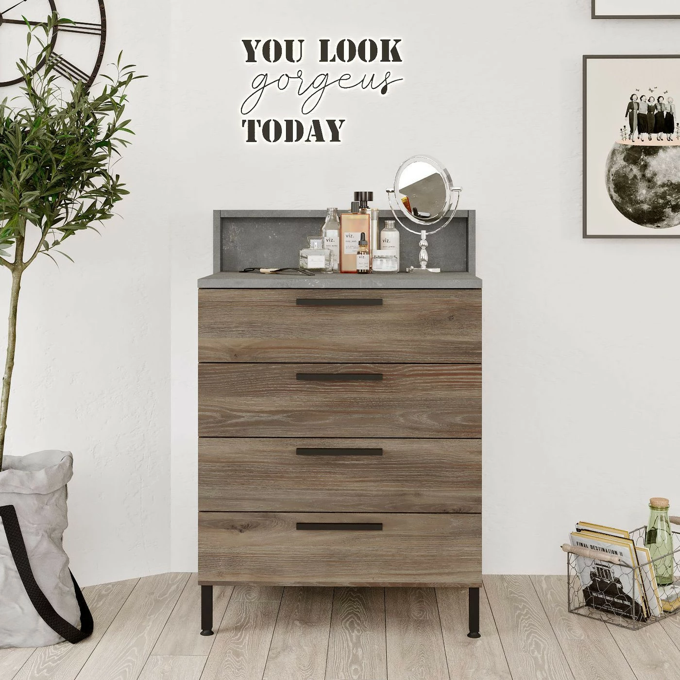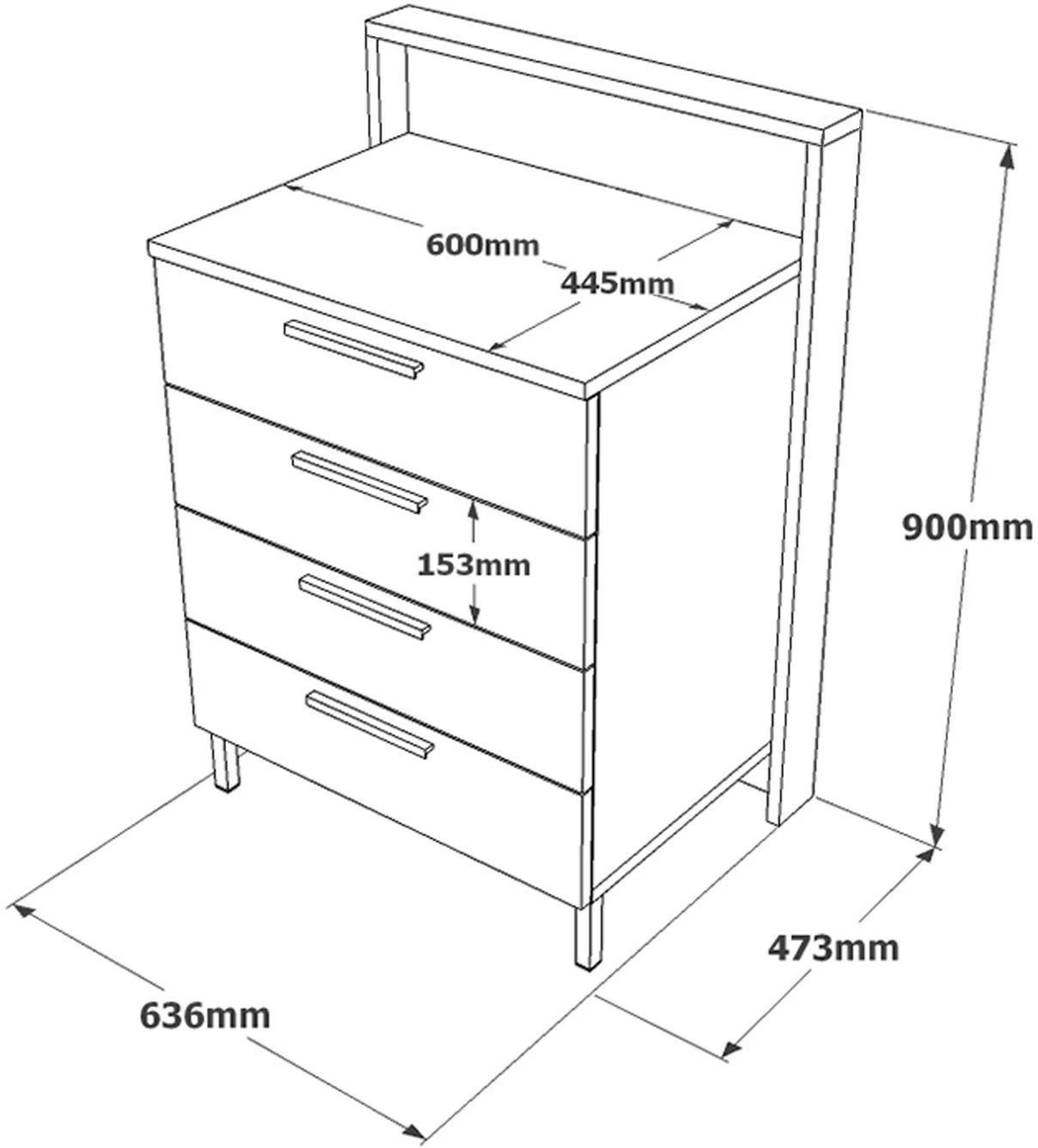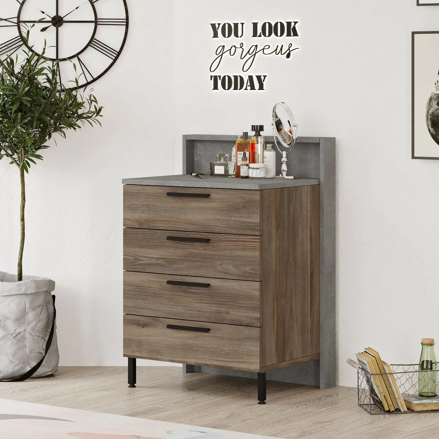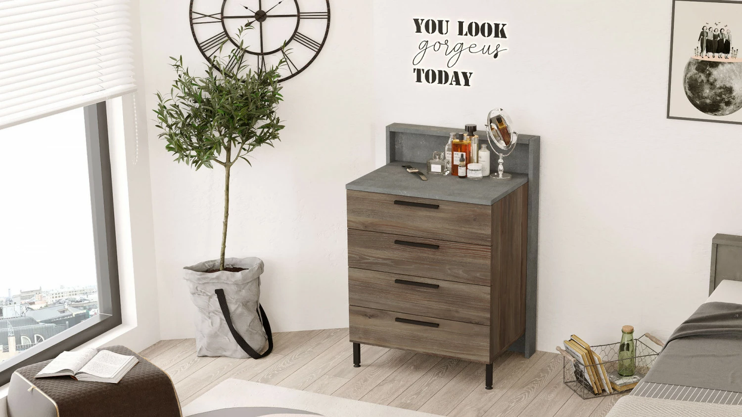 Lipastossa on neljä laatikkoa. Harmaa pöytälevy ja takaosa ovat personallinen yksityiskohta.