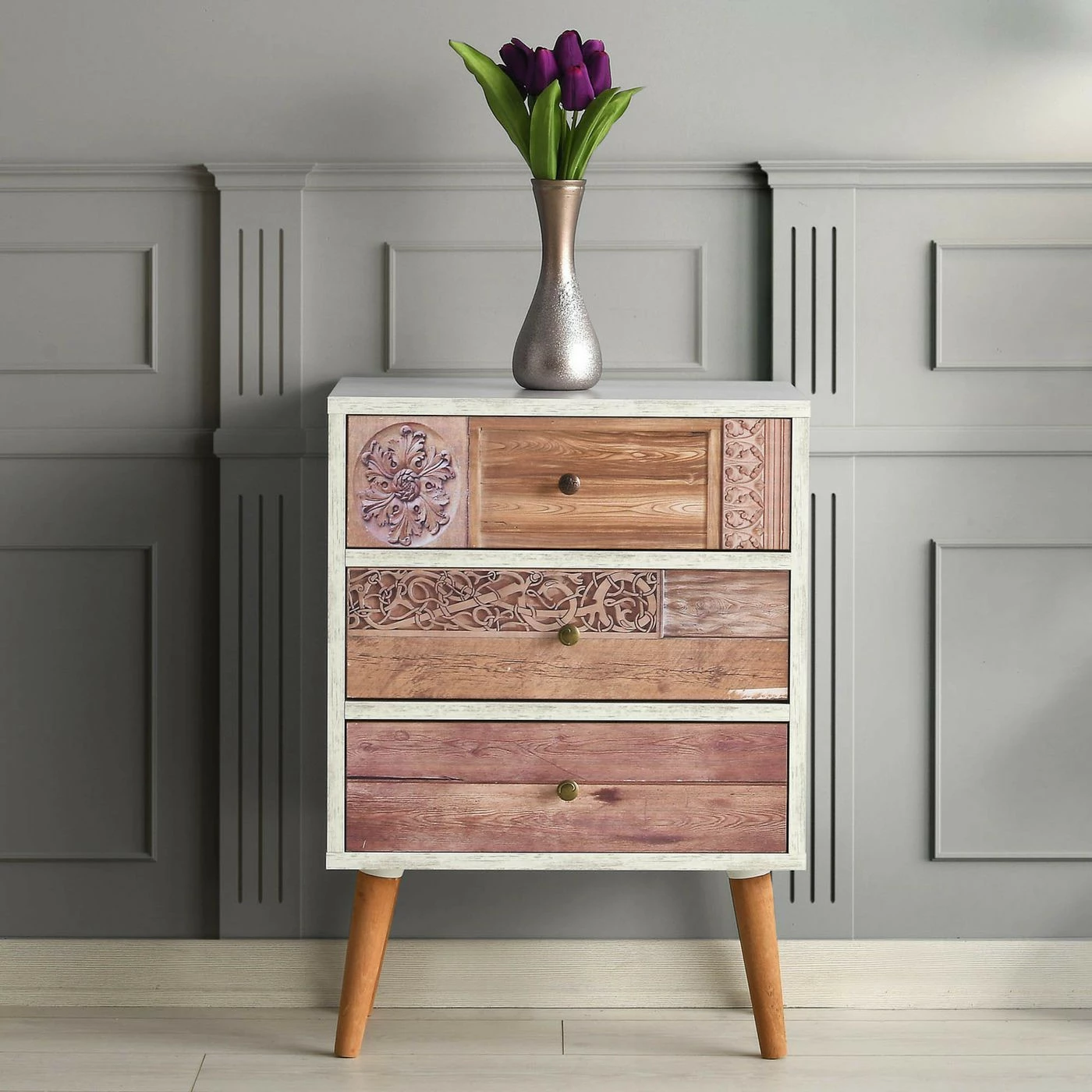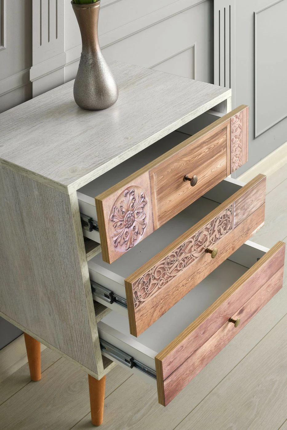 Liza-lipastossa on kolme koristeellista vetolaatikkoa.