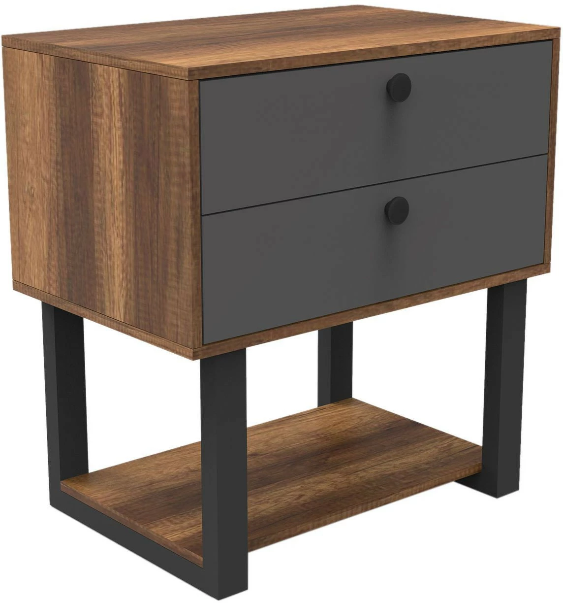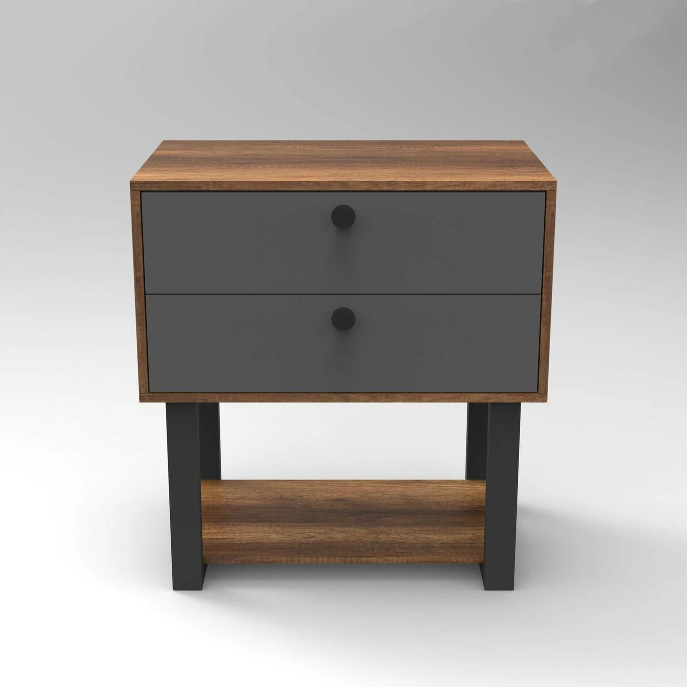 Lipastossa on kaksi harmaata laatikkoa ja tummat metallijalat.