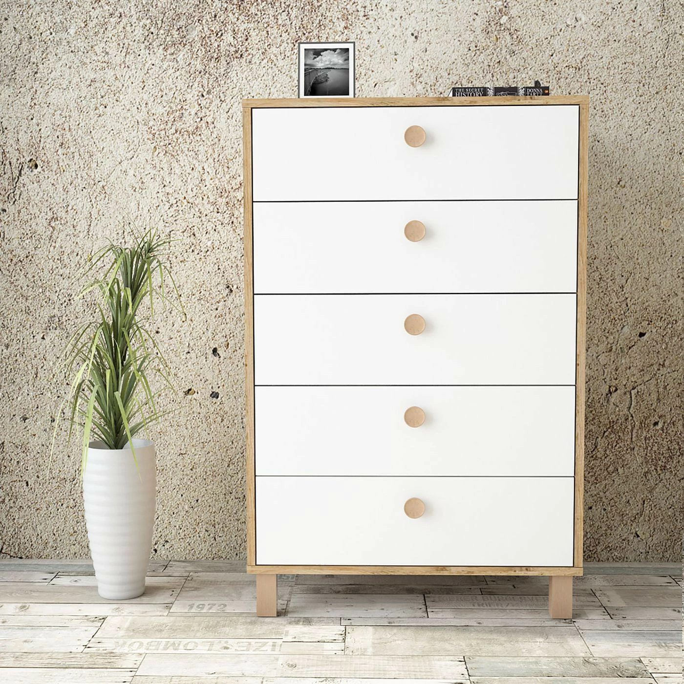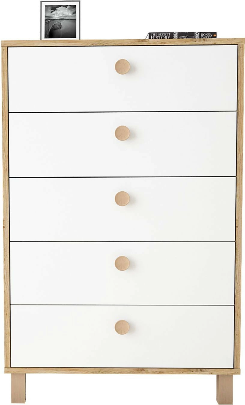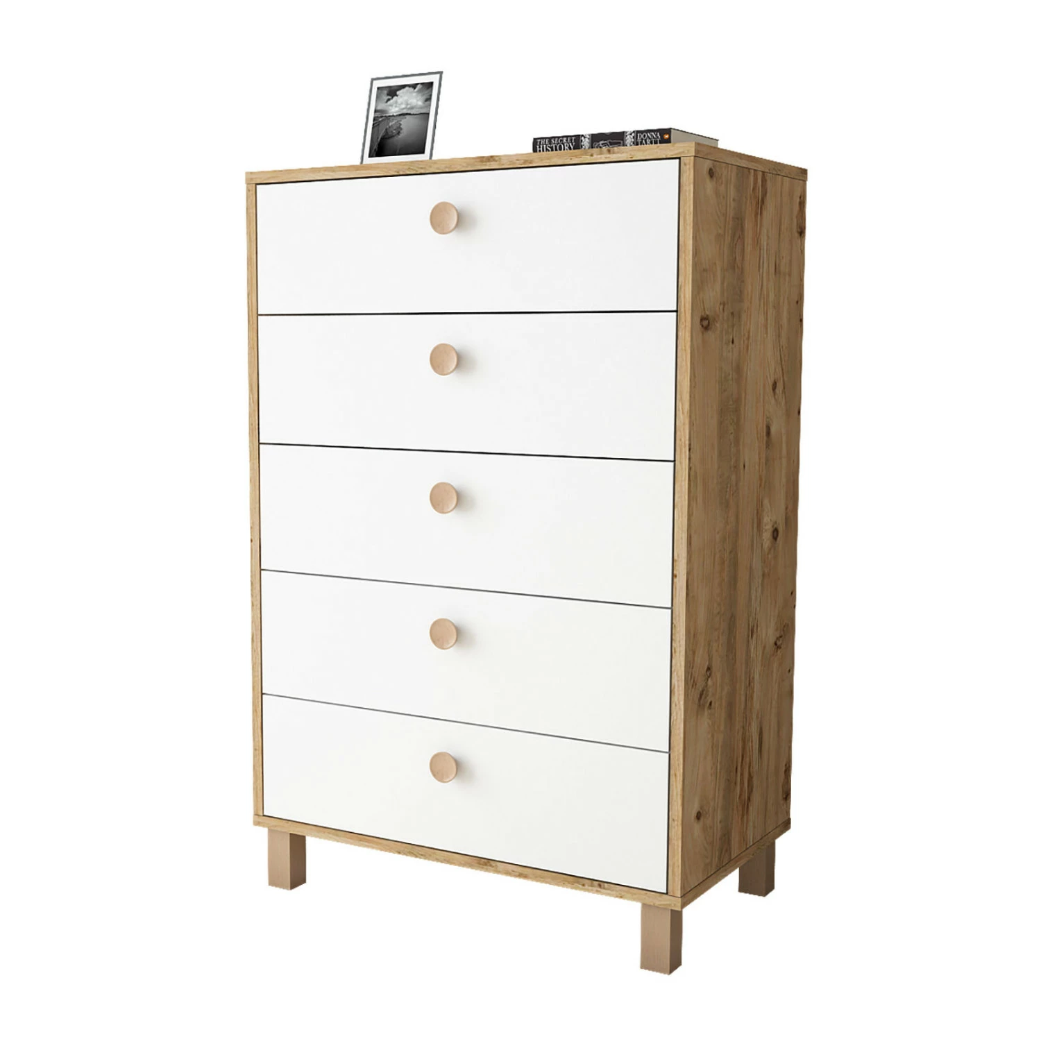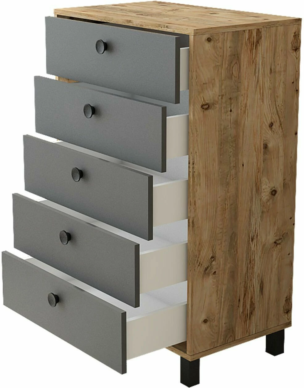 Tehosteväriset laatikot ja ruskea runko muodostavat harmonisen kokonaisuuden. Lipastossa on viisi vetolaatikkoa.