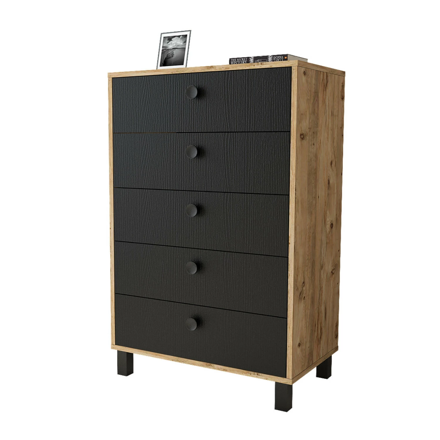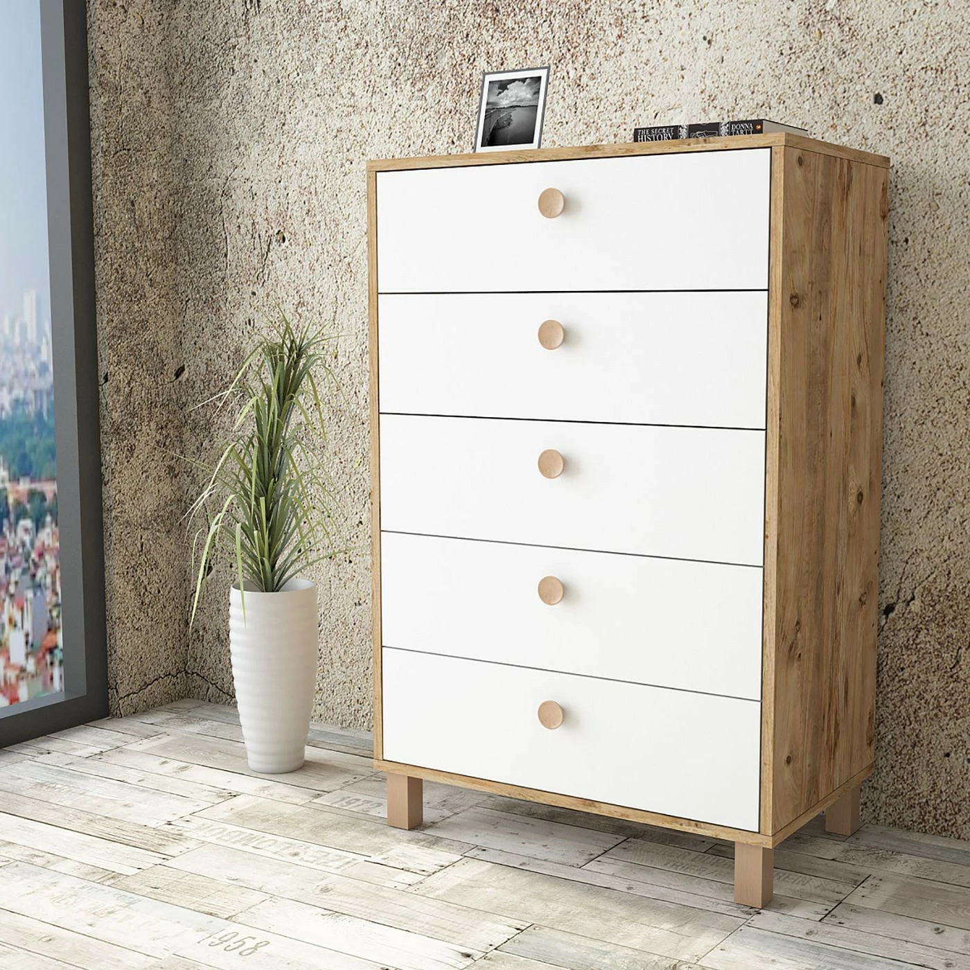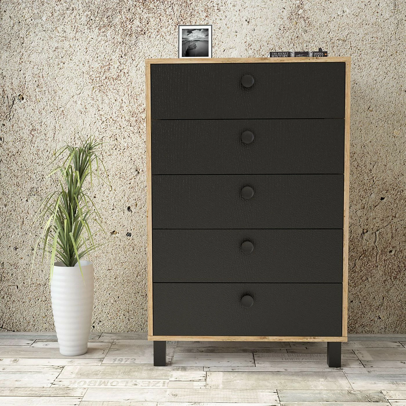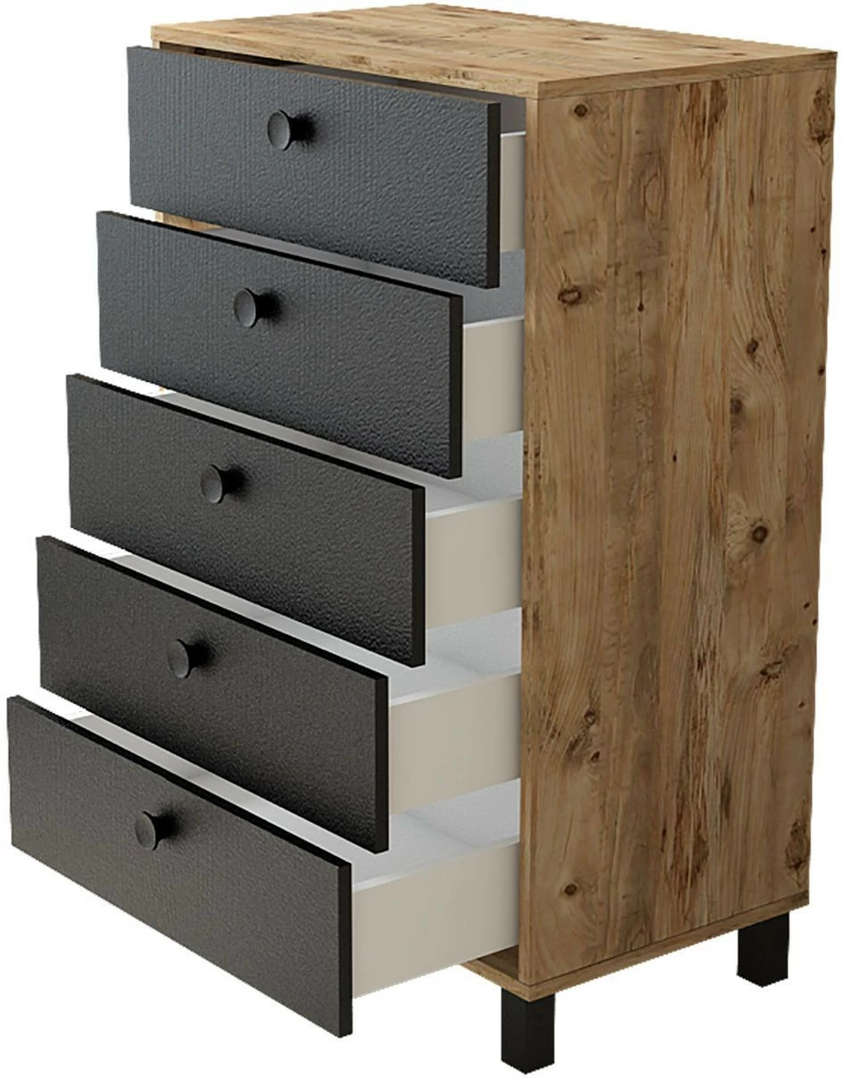 Tehosteväriset laatikot ja ruskea runko muodostavat harmonisen kokonaisuuden. Lipastossa on viisi vetolaatikkoa.