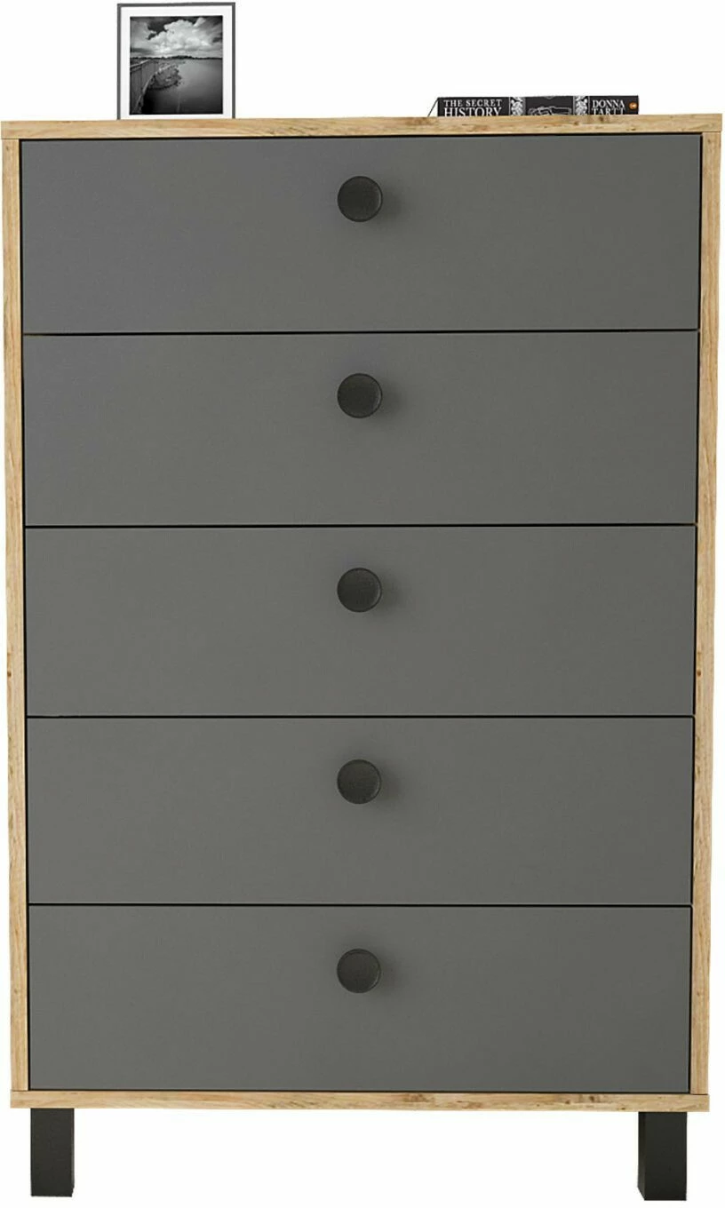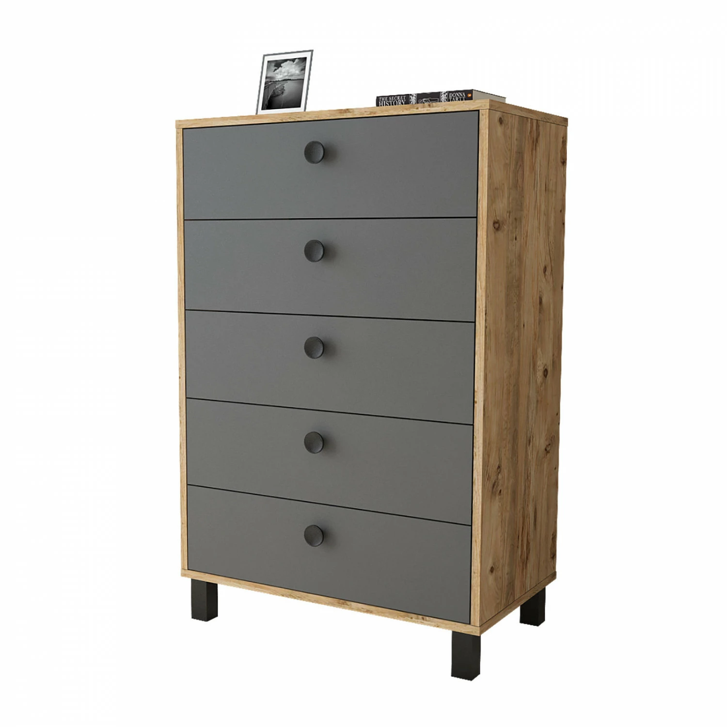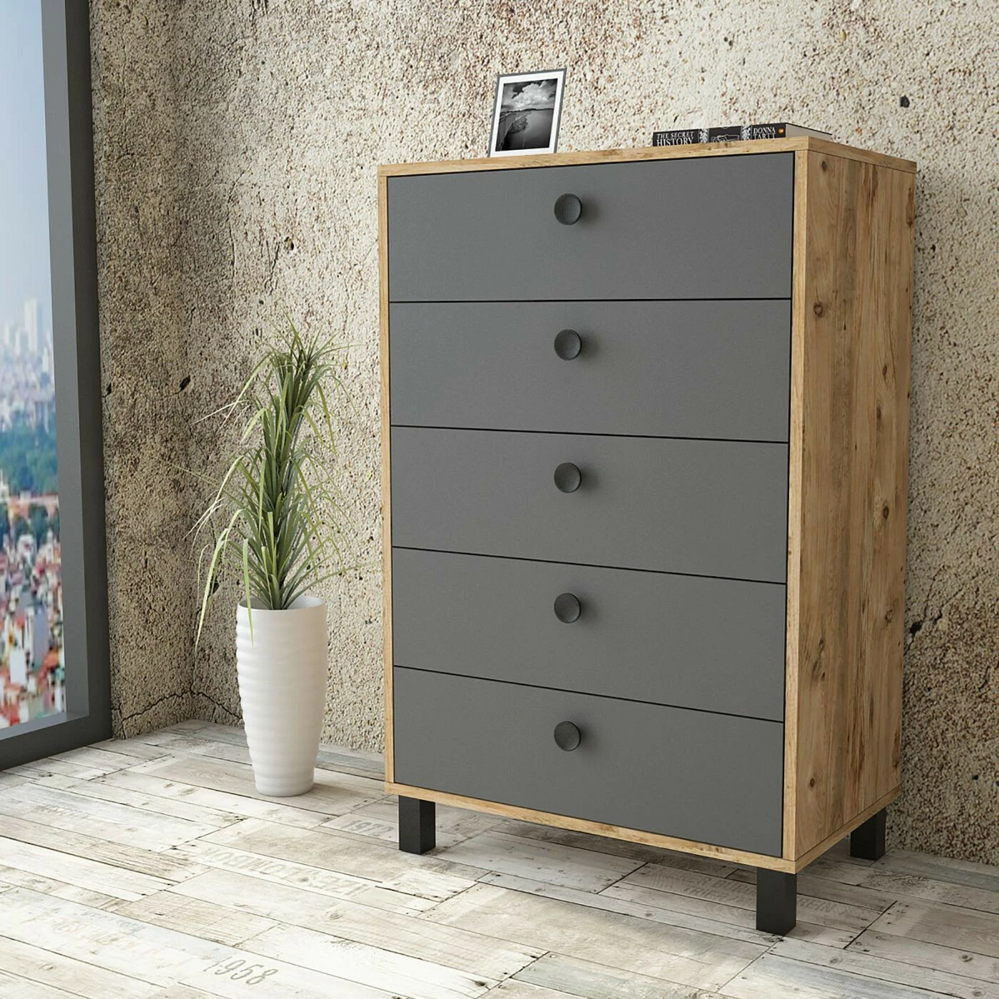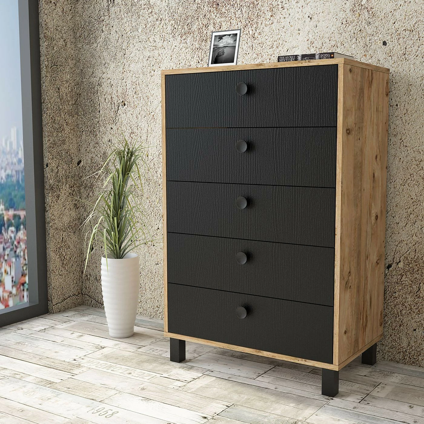 Tehosteväriset laatikot ja ruskea runko muodostavat harmonisen kokonaisuuden. Lipastossa on viisi vetolaatikkoa.