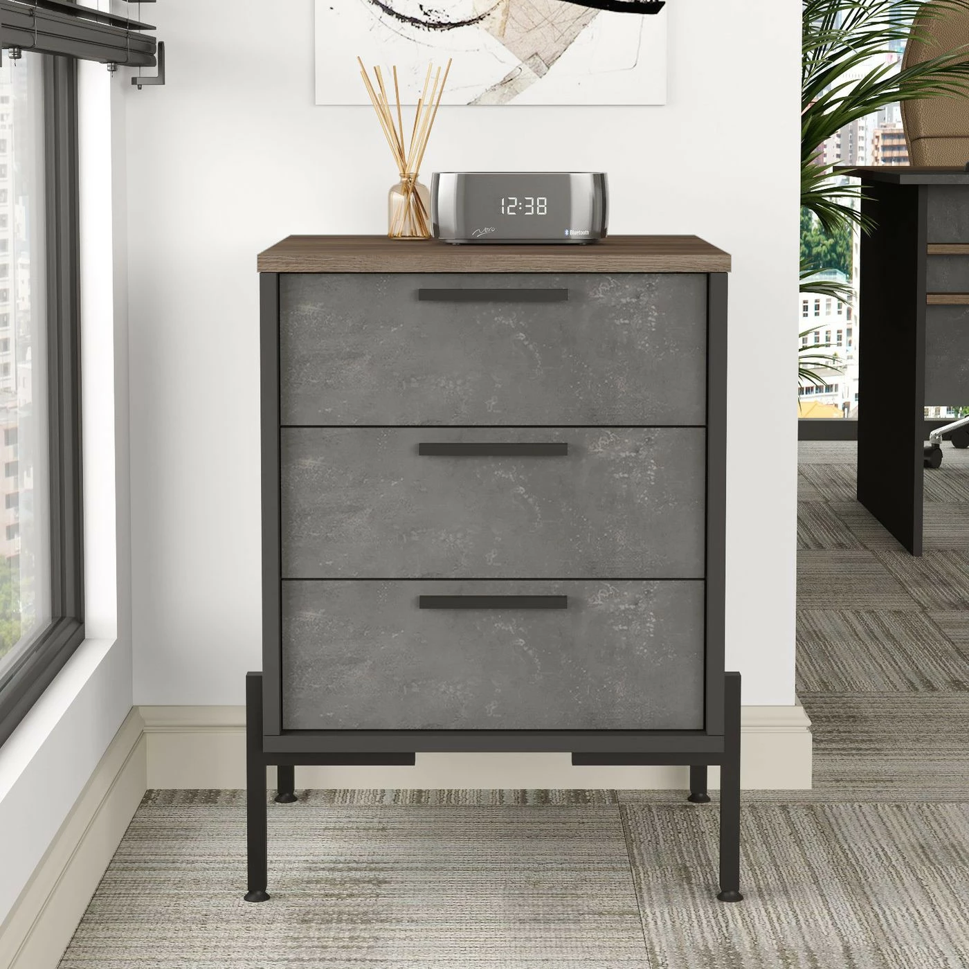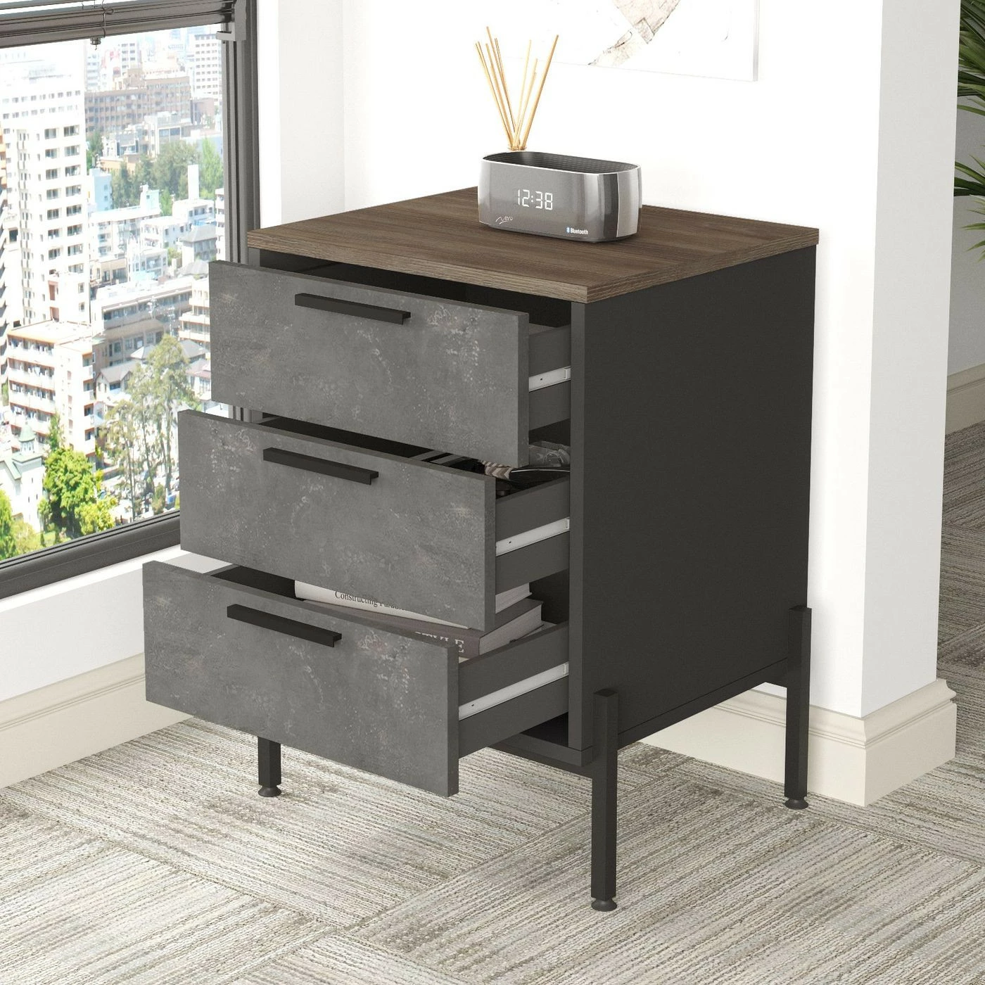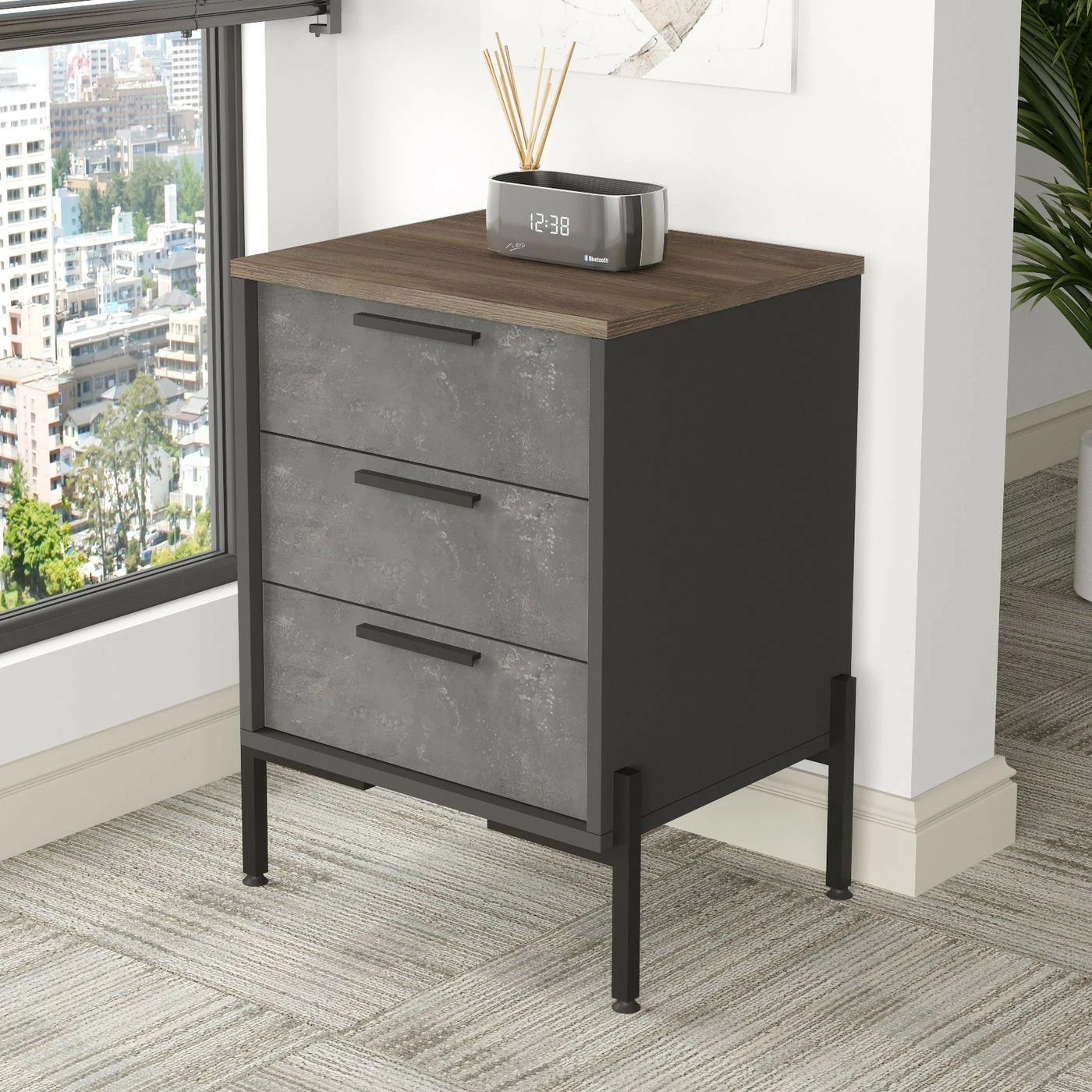 Ruskea pöytälevy tuo lipastolle pehmeää ilmettä. Kolmeen laatikkoon mahtuu mukavasti tavaraa. Jalat ovat metallia.