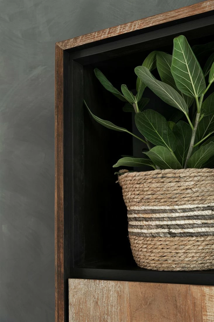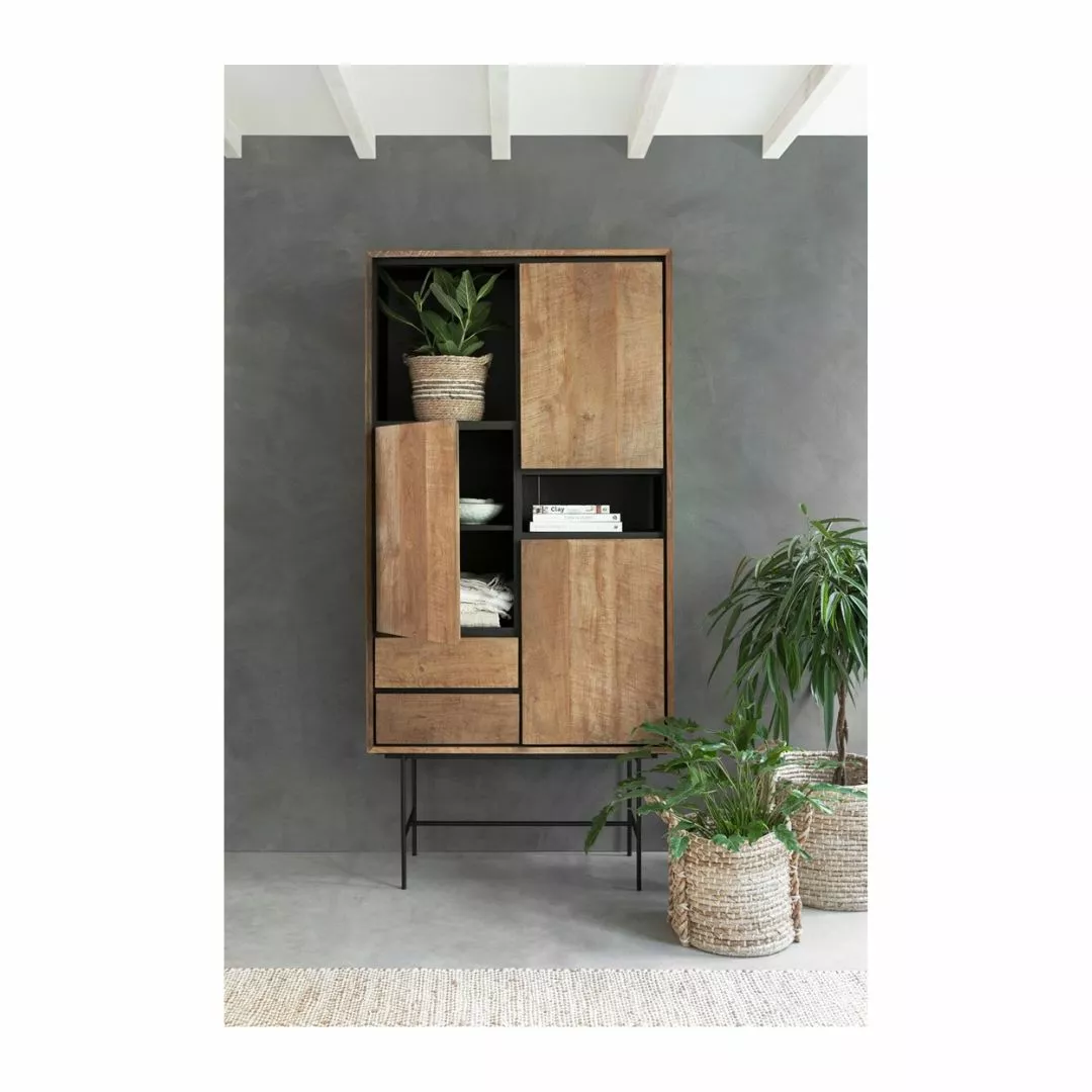Upean näyttävä korkea puinen kirjahylly usealla epäsymmetrisellä avohyllyillä ja kolmella kaapilla. Laadukas kokopuinen kirjahylly käy niin keittiön astiakaapiksi kuin olohuoneen sisustukseenkin tai lukunurkkaukseen. Hyllykkö kestää niin katsetta kuin käyttöäkin. Mustaksi hiilikäsitellyt kaapin sisäosat tuovat kalusteeseen ryhtiä ja syvyyttä.