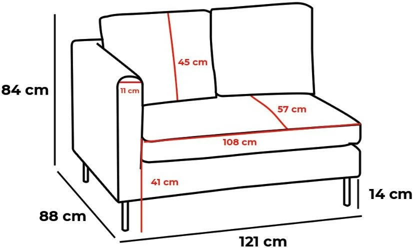 - 2-istuttava moduuli: leveys 121 cm, korkeus 84 cm, syvyys 88 cm