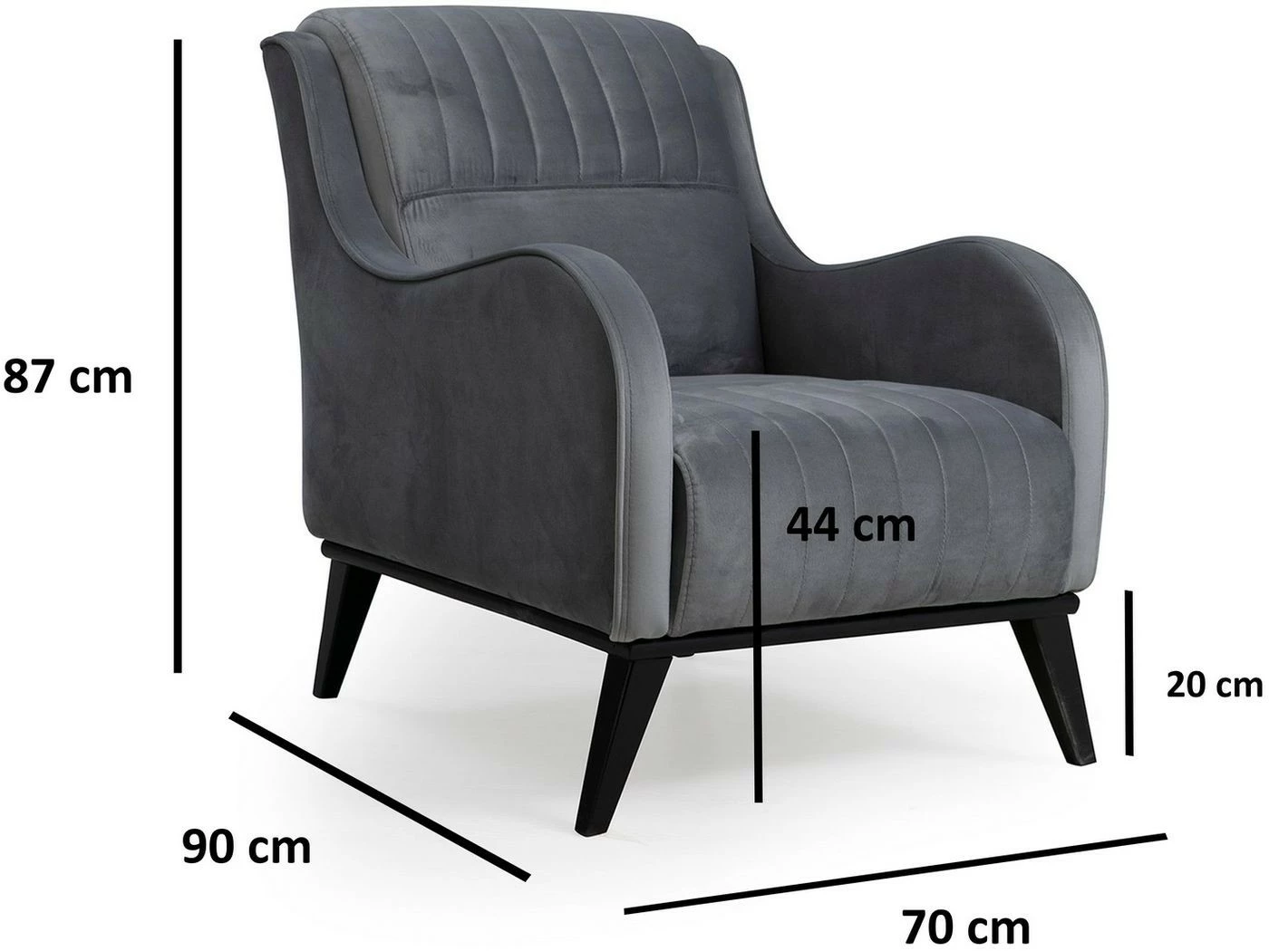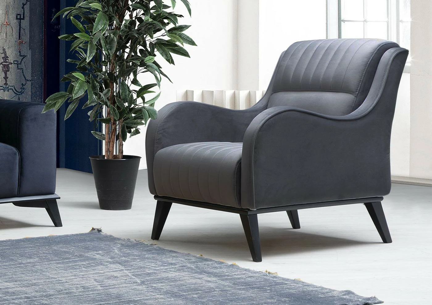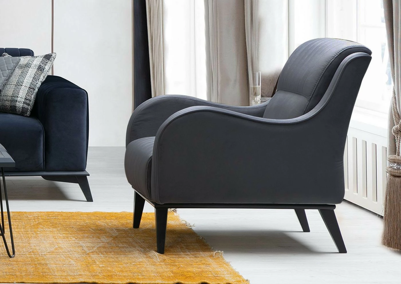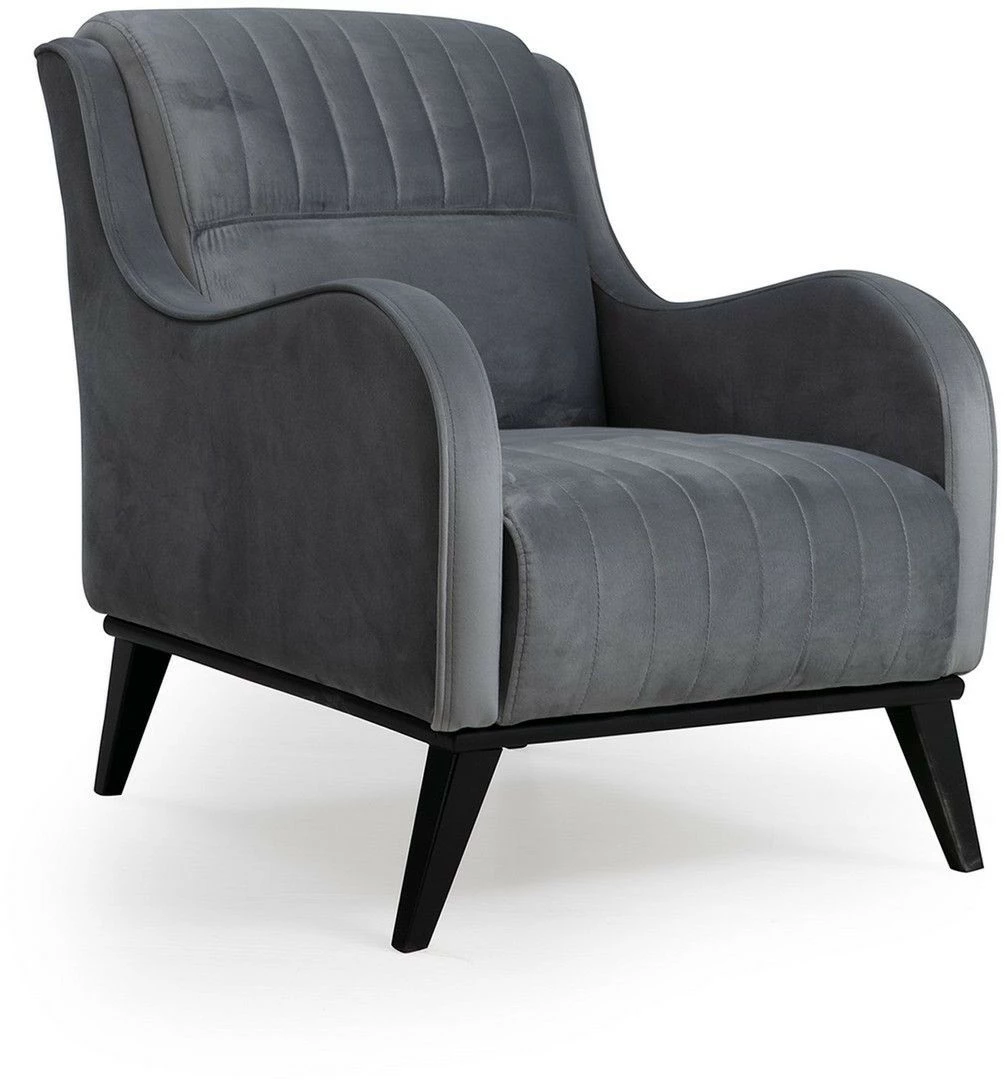 Antrasiitinharmaan Lisa-nojatuolin käsinojissa on kauniin aaltoileva muoto. Verhoilu kangasta, mustat jalat puuta.