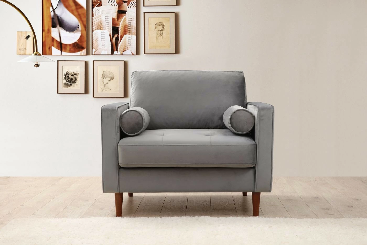 Rome-nojatuolissa on pähkinänväriset, puiset jalat. Mukana toimitettavat kaksi tyynyä lisäävät istumismukavuutta.